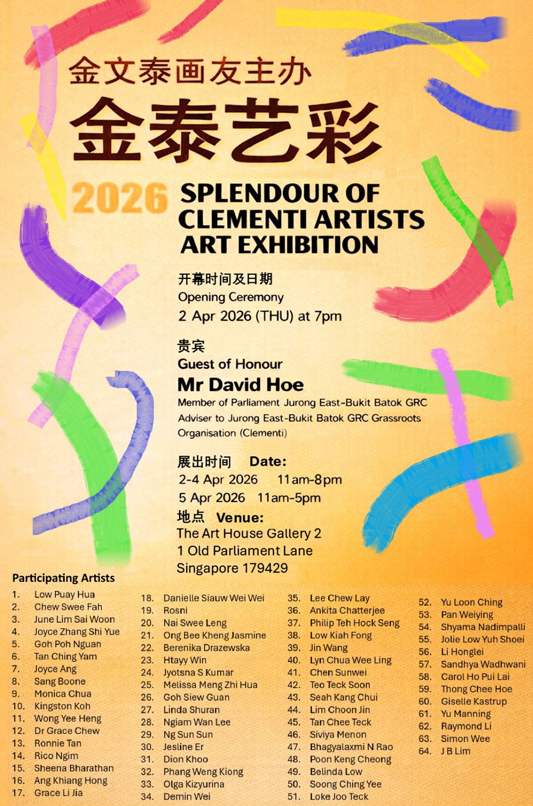I am delighted to invite you to the Splendour of Clementi Artists Art Exhibition 2026, a vibrant showcase of works by talented artists from our local community.