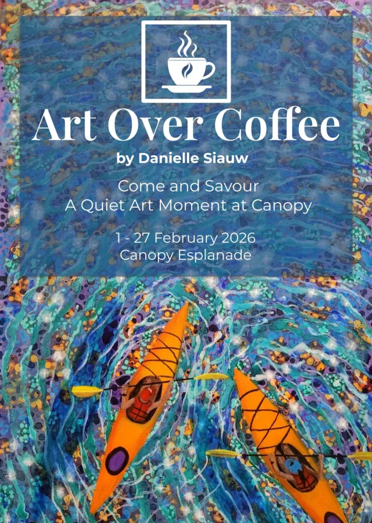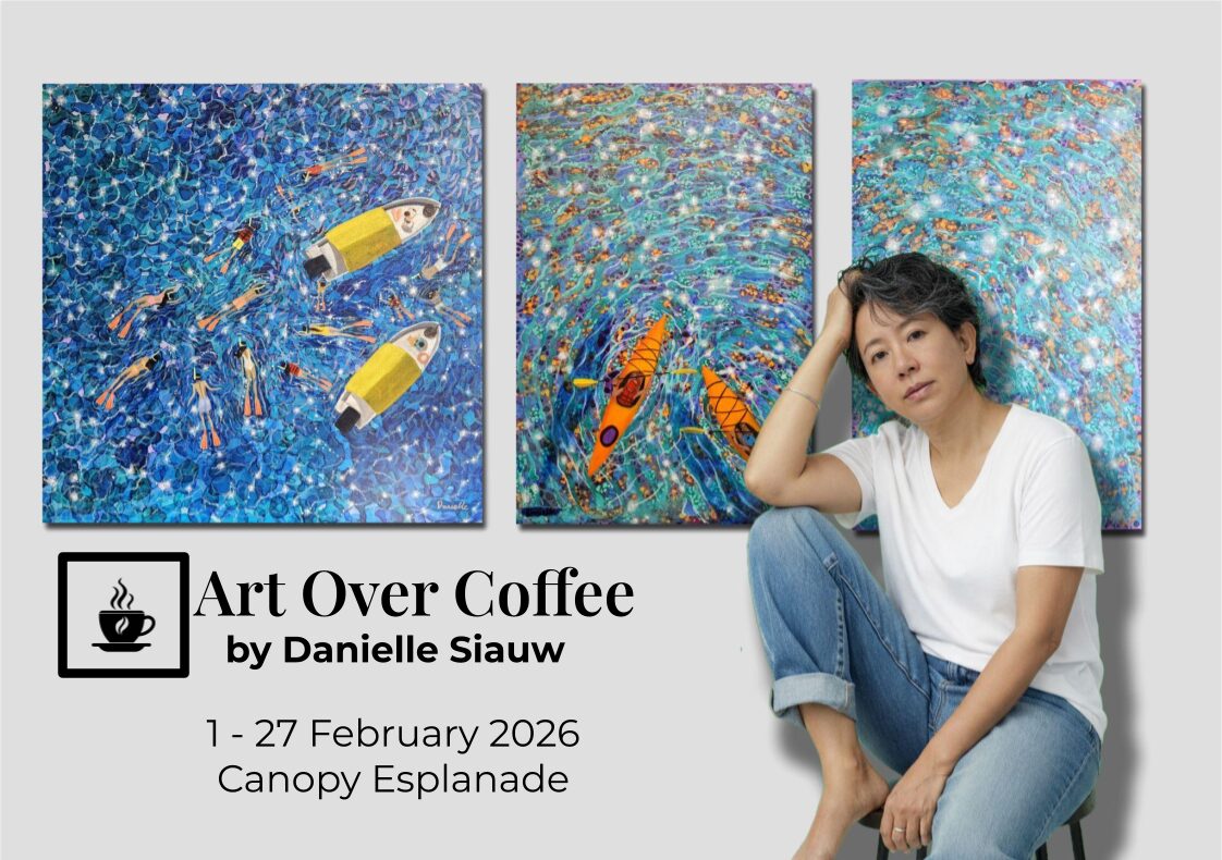 Art Over Coffee is an intimate art exhibition by Singapore-based artist Danielle Siauw, inviting viewers to slow down, pause, and reconnect with simple moments of calm and joy. Set within the relaxed café setting of Canopy Esplanade, the exhibition blends art seamlessly into everyday life – meant to be experienced gently, over coffee and conversation.