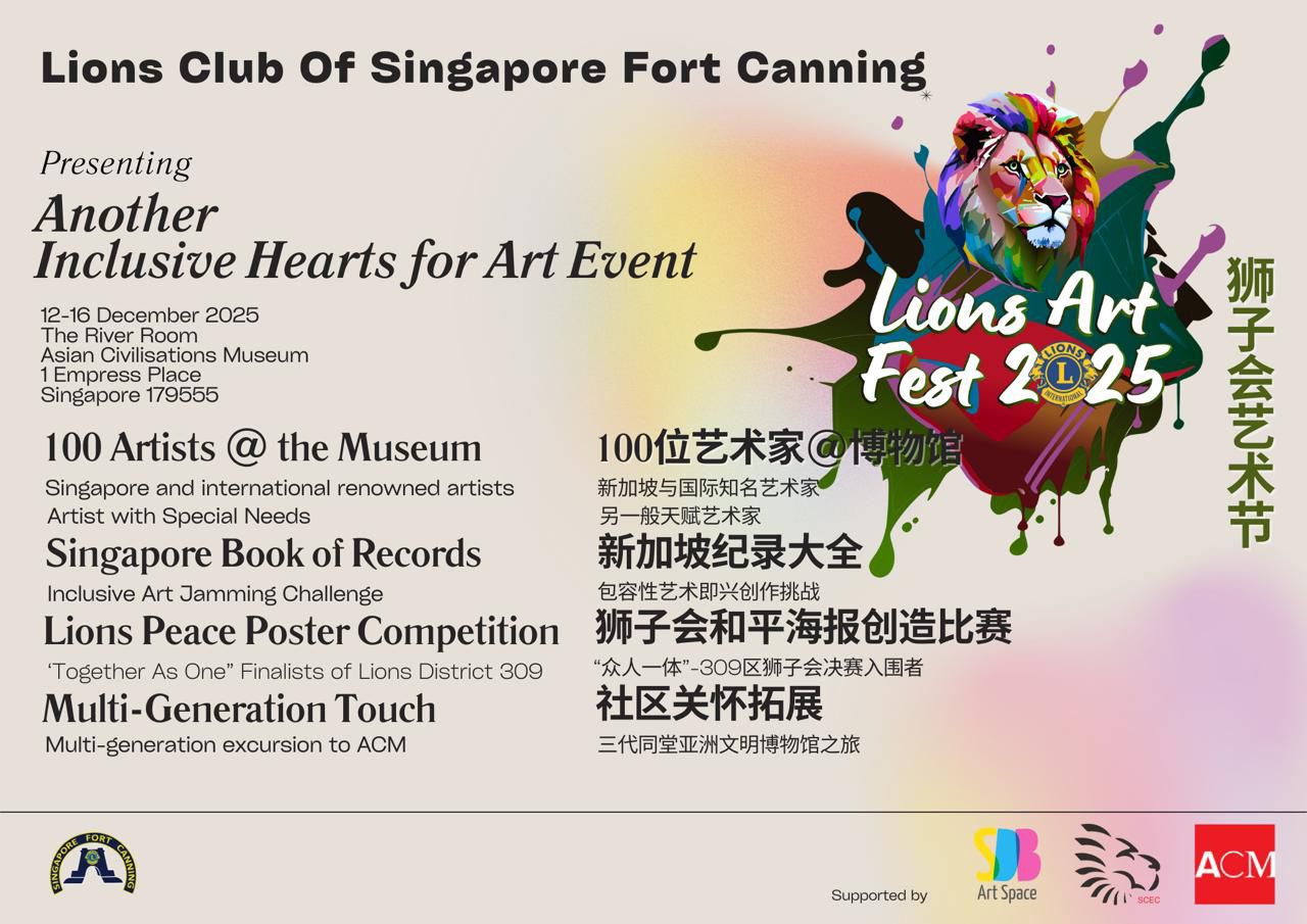 I’m excited to share the upcoming Lions Art Fest 2025, presented by the Lions Club of Singapore Fort Canning. This is a meaningful and inspiring celebration of art, community and inclusivity. This year’s theme, “Another Inclusive Hearts for Art Event,” continues the commitment to bringing people together through creativity and compassion.