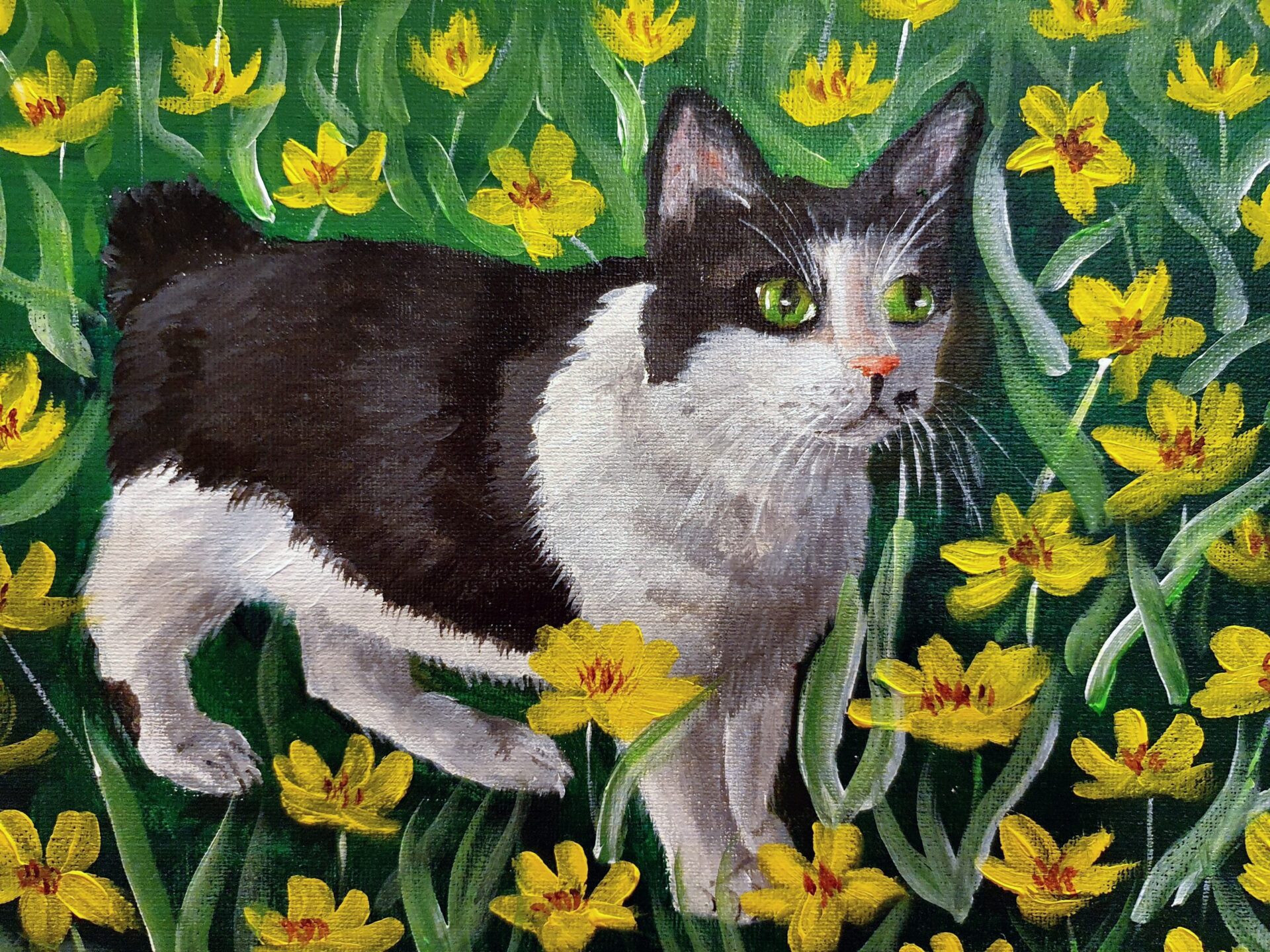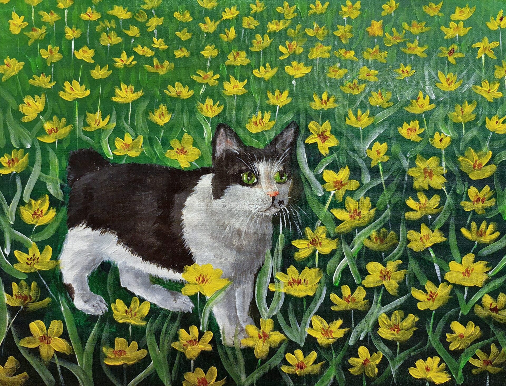 Danielle Art Original Acrylic and Oil Paintings Original Acrylic Painting – Oreo Smelling Flowers 2: Black and white cat amidst a field of vibrant yellow flowers.