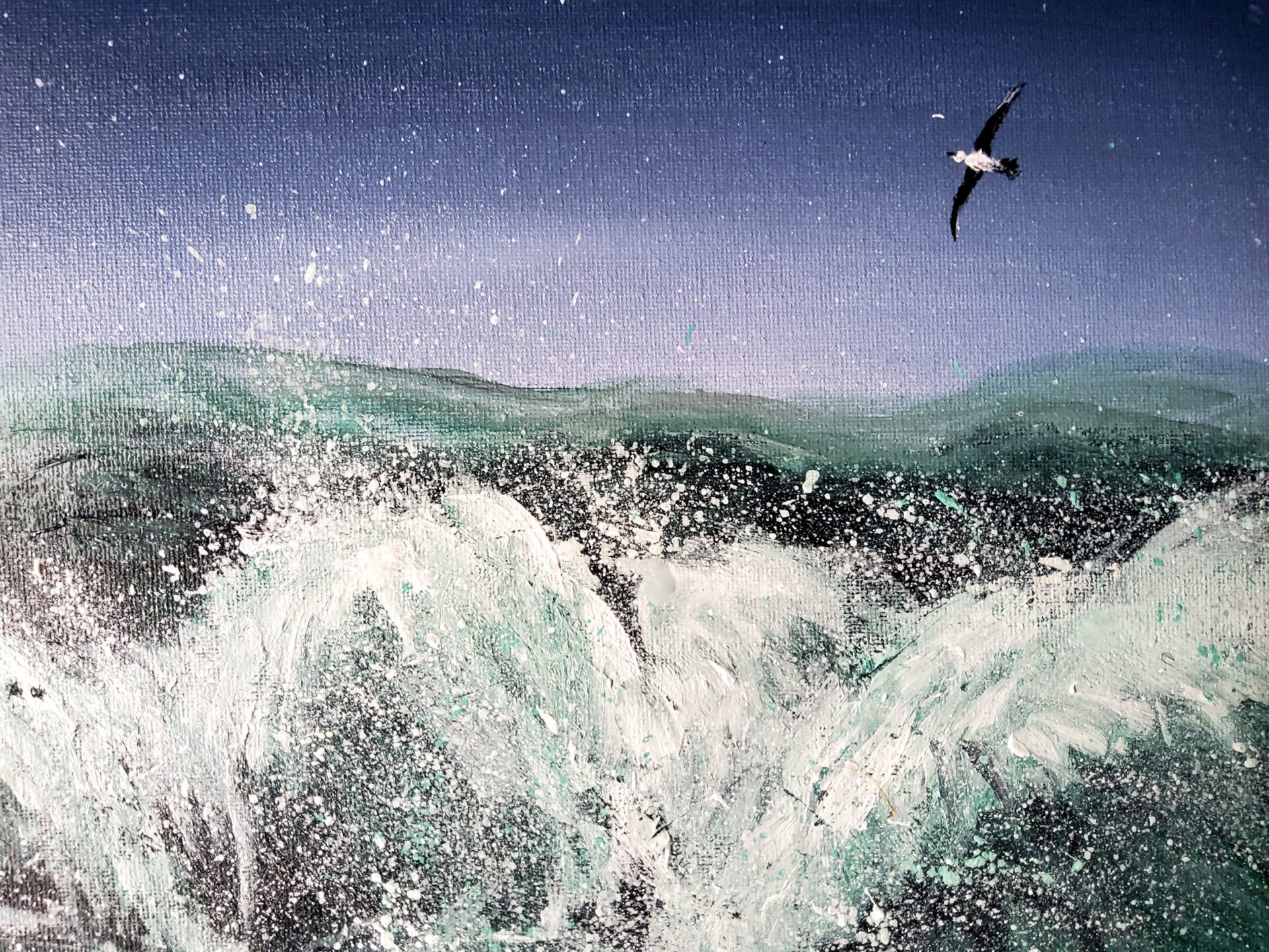 When I painted this dramatic seascape, I aimed to capture the raw energy and power of the ocean waves crashing against one another. The movement of the water, with its splashes and sprays, embodies nature’s unrelenting force and beauty. The deep blue sky above, dotted with stars and a soaring seabird, creates a sense of freedom and infinite possibility.