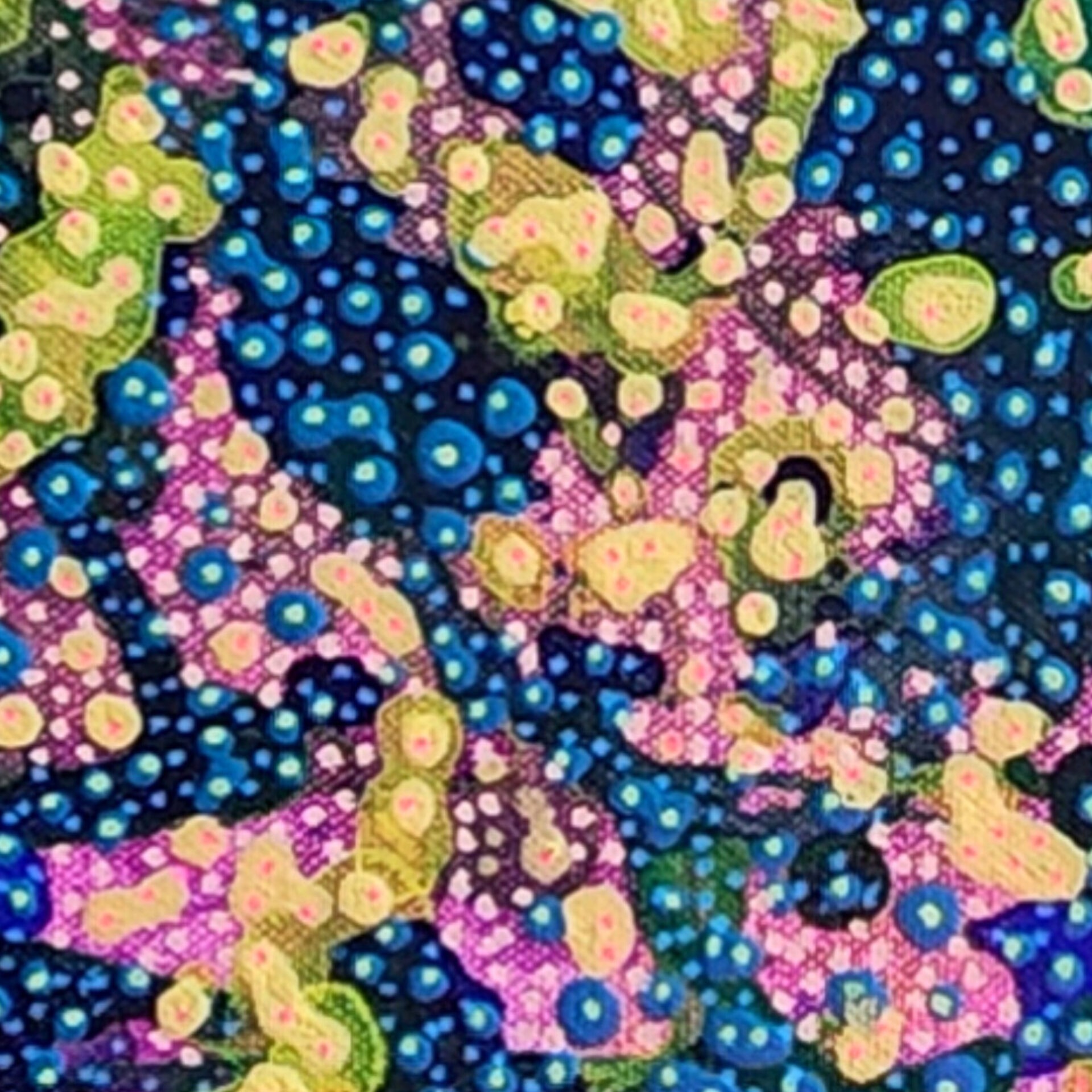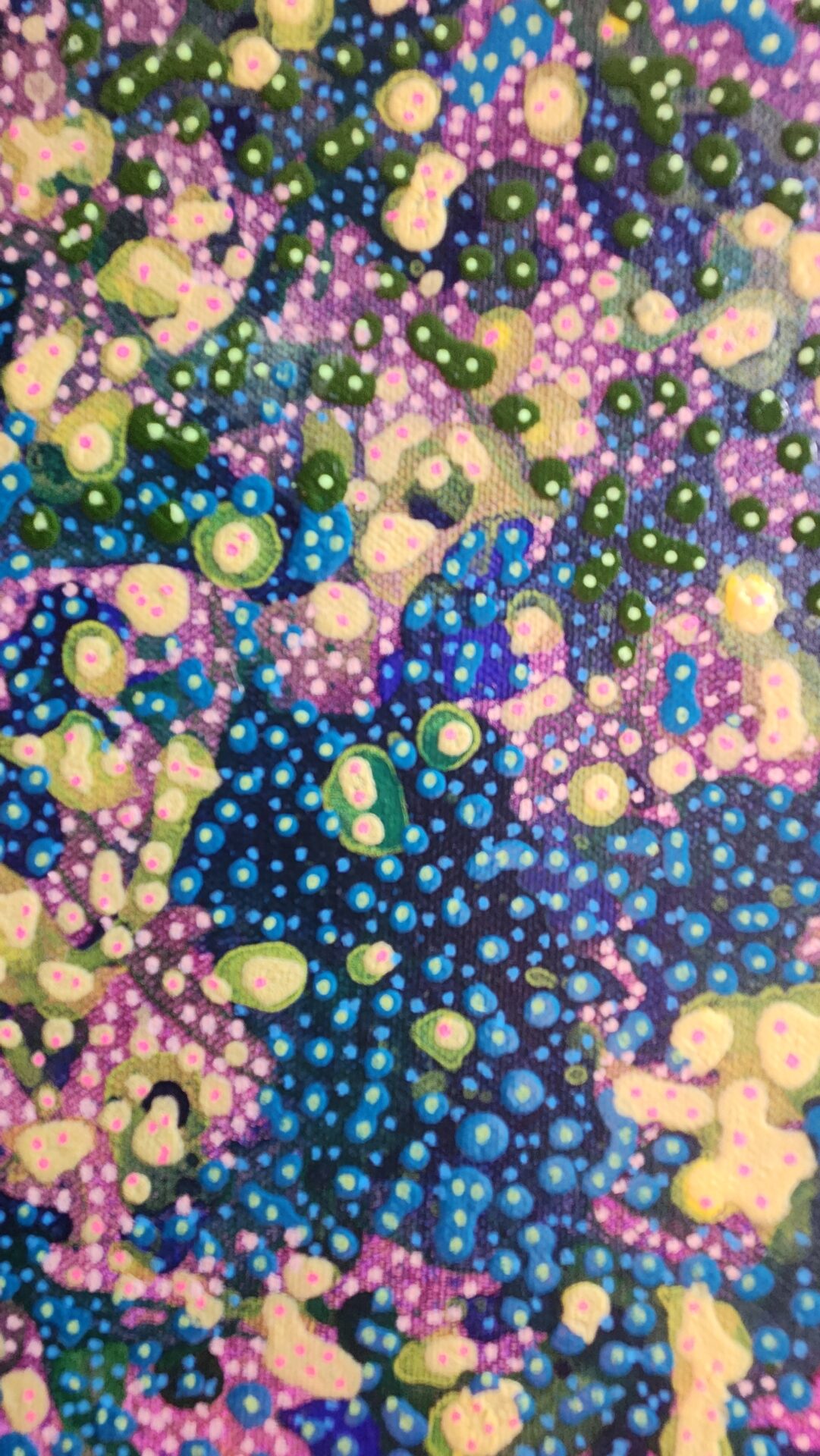 Atomic Nature 4 is an abstract painting that captures a vivid interplay of cellular and amoebic shapes, evoking the mesmerizing patterns found in both cosmic and microscopic realms. Each layer of this boldly colored composition emerges spontaneously, resulting in organic forms that feel alive with motion and possibility. Through meticulous dot detailing and flowing paint techniques, I sought to reflect nature’s own complexity—where chaos and harmony coexist in delicate balance.