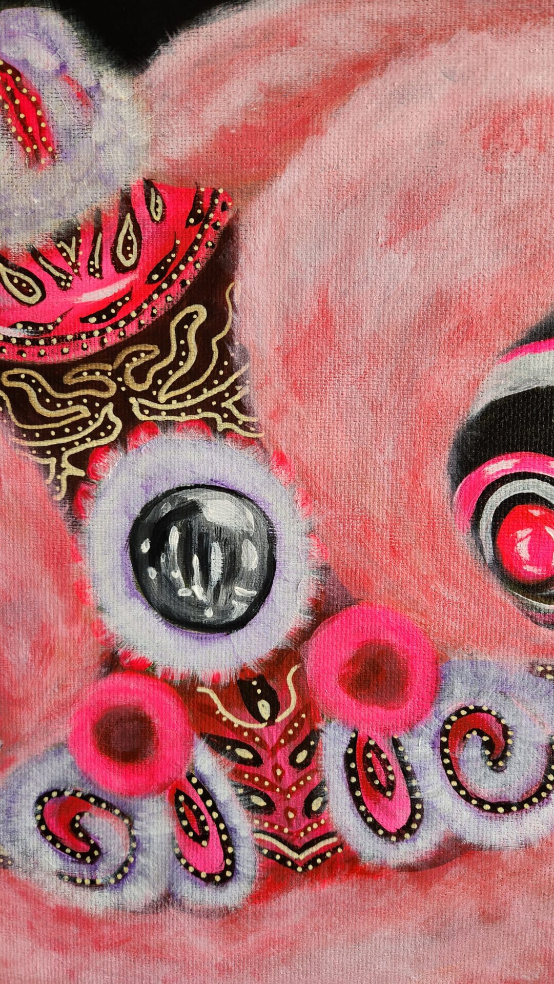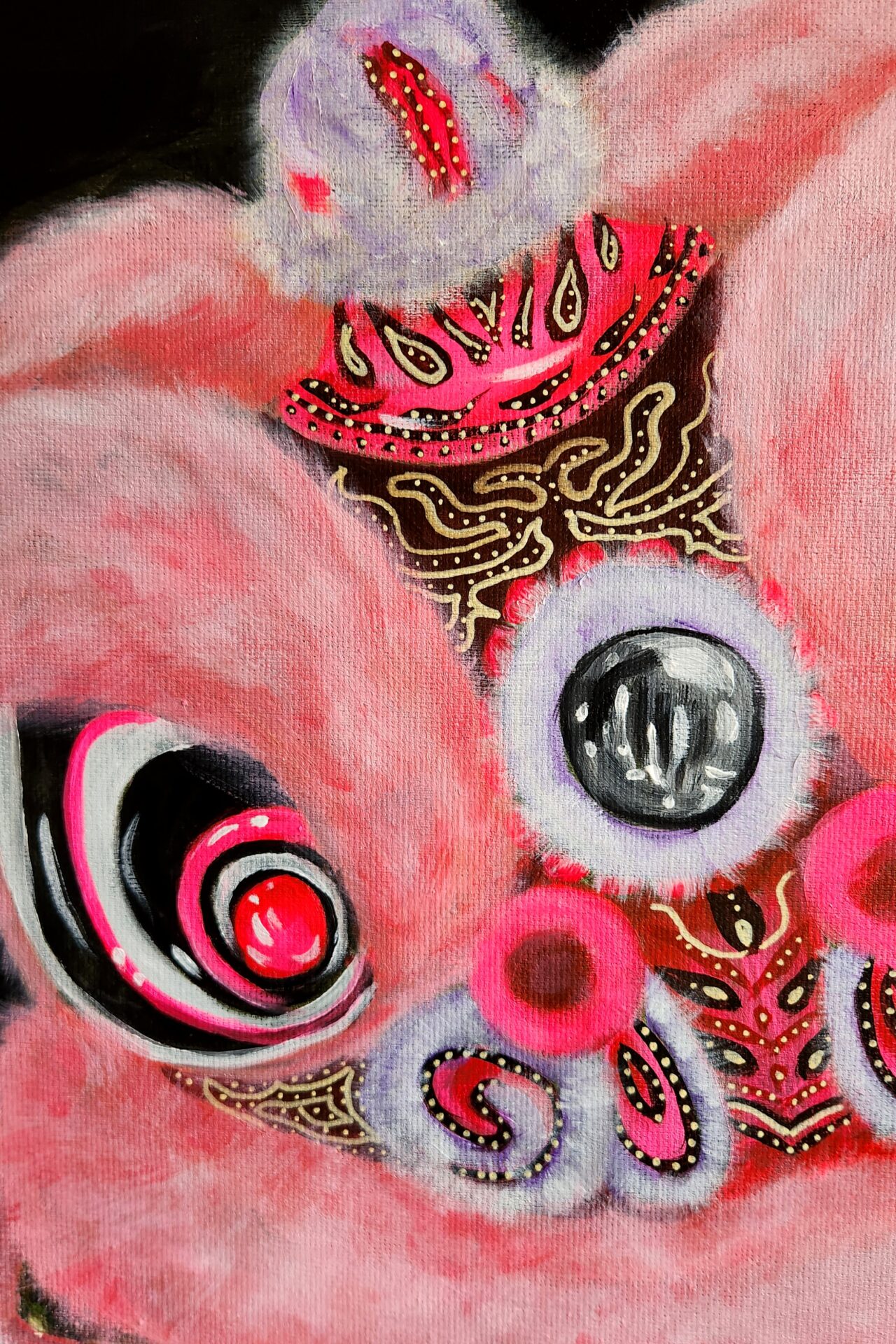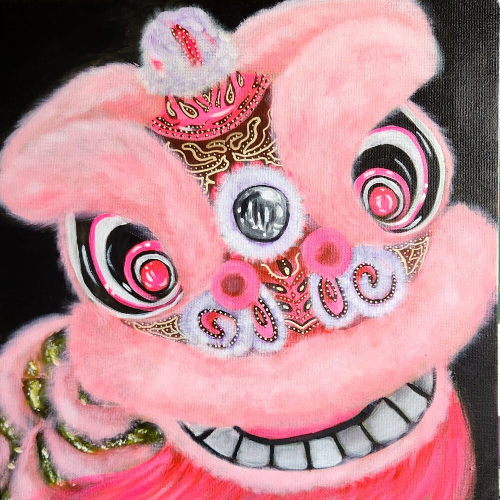“Barbie Lion” is my vibrant tribute to the fusion of traditional culture and modern-day glamour. Inspired by the iconic lion dance and reimagined in Barbie’s signature pink, this painting celebrates the meeting of heritage and playful creativity. The lion dance, a symbol of strength, joy, and prosperity, takes on a fresh, whimsical twist with its bold pink hues, intricate patterns, and a dash of personality reminiscent of Barbie’s fearless self-expression.