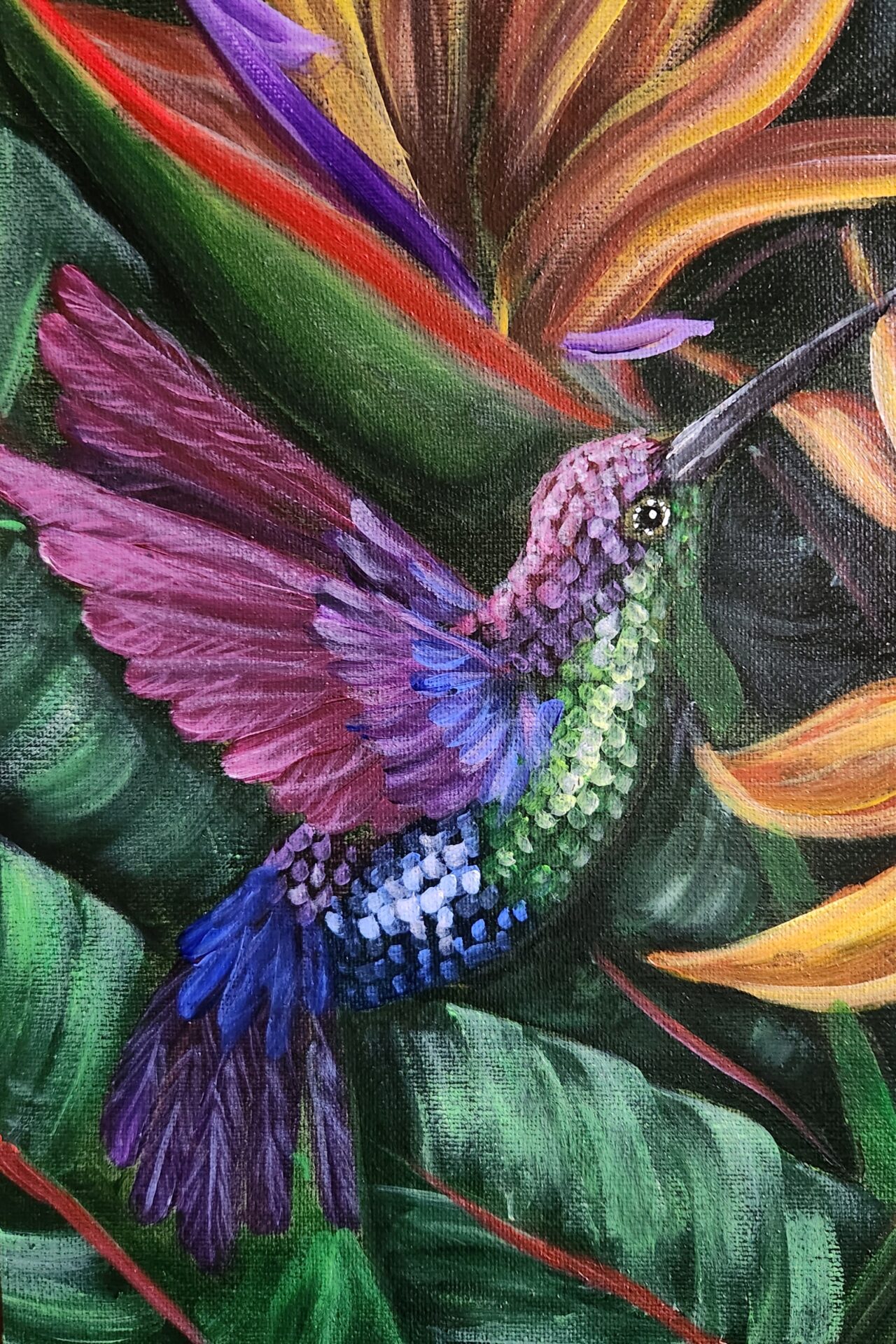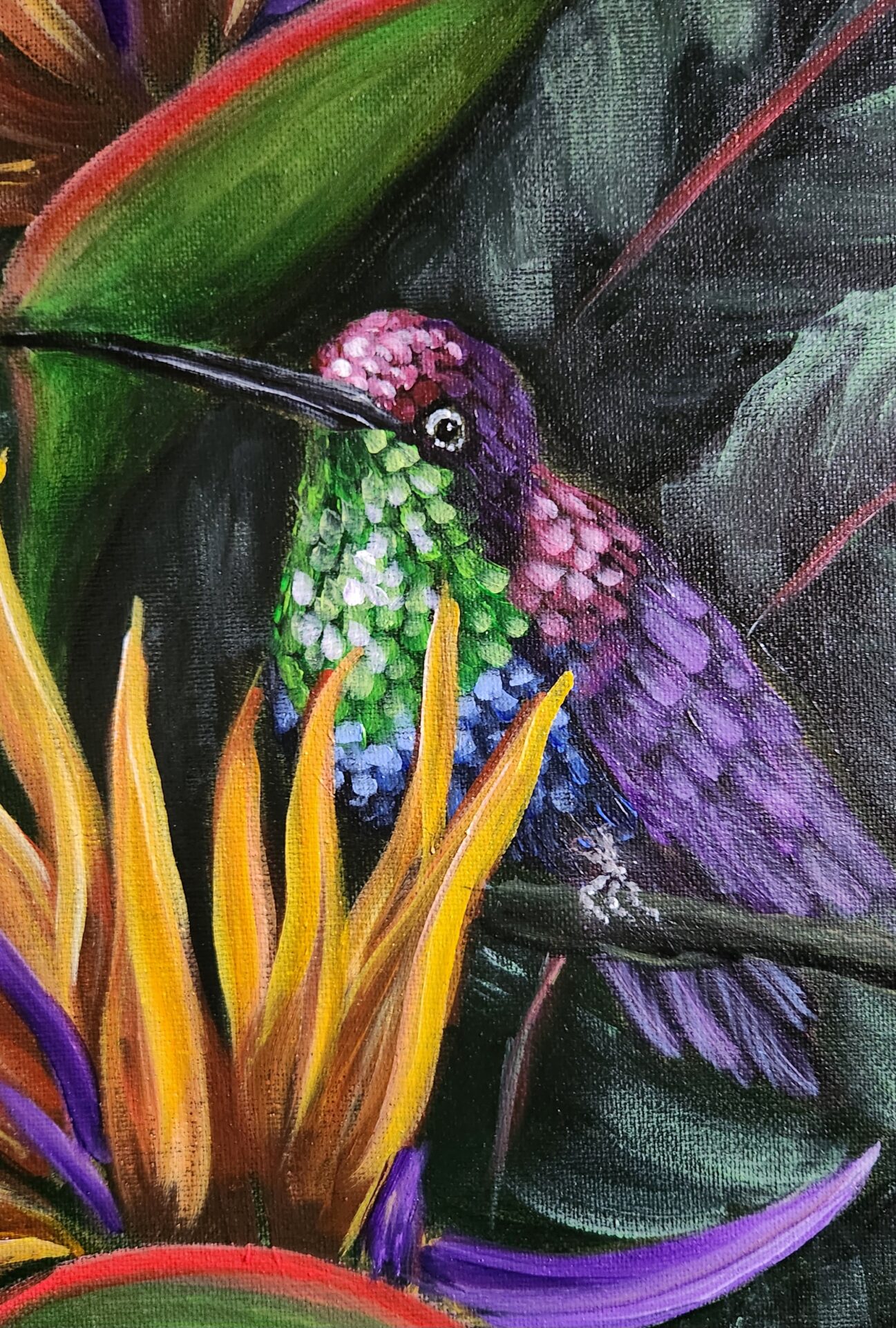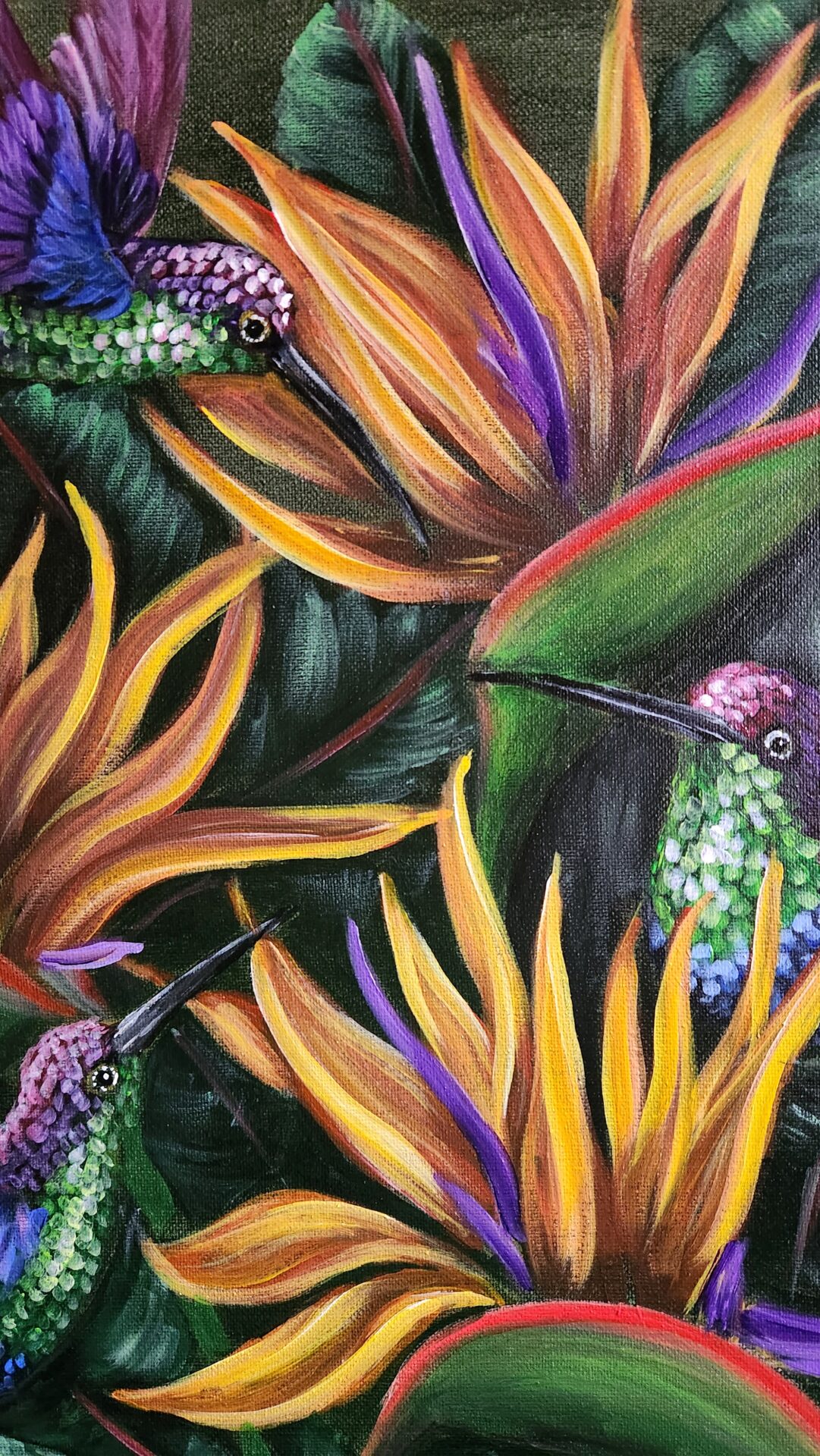 In “Birds od Paradise 1”, I sought to capture the delicate dance between nature’s most graceful creatures, the hummingbirds, and the vibrant heliconias that surround them. Through a meticulous blend of colors and intricate brushstrokes, I aimed to convey the essence of these fleeting moments of connection between the avian wonders and the tropical blooms.