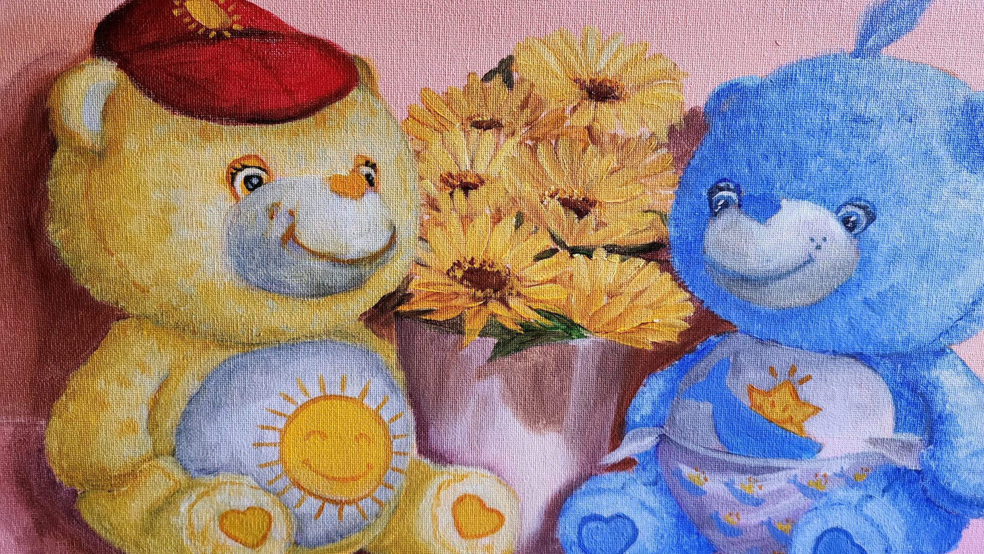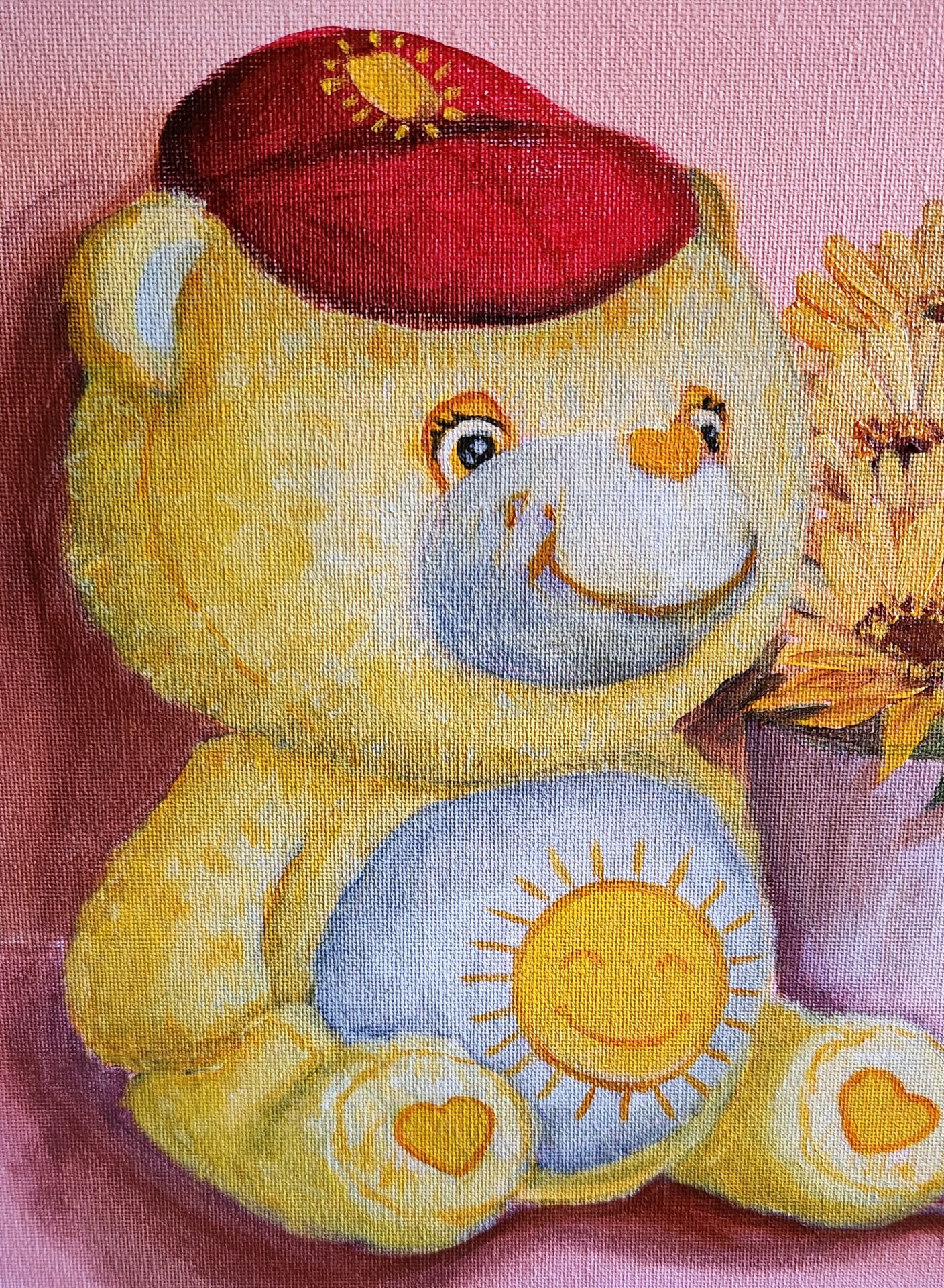 “Childhood Comforts: Sunshine & Tugs” is a deeply personal piece that takes me back to the joys and solace of my childhood in the 1980s. Growing up in a dysfunctional household, the Care Bears weren’t just toys to me—they were my safe space, my escape, and my constant companions. Sunshine Bear, with its bright sun symbol, reminded me that happiness and hope could still exist, even in the darkest moments. Baby Tugs, with its gentle innocence, gave me a sense of love and tenderness I often longed for.