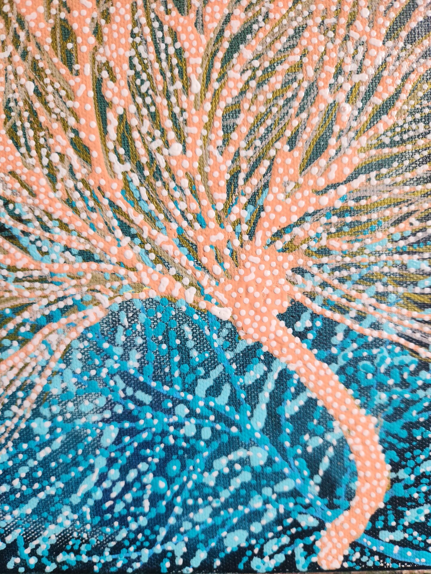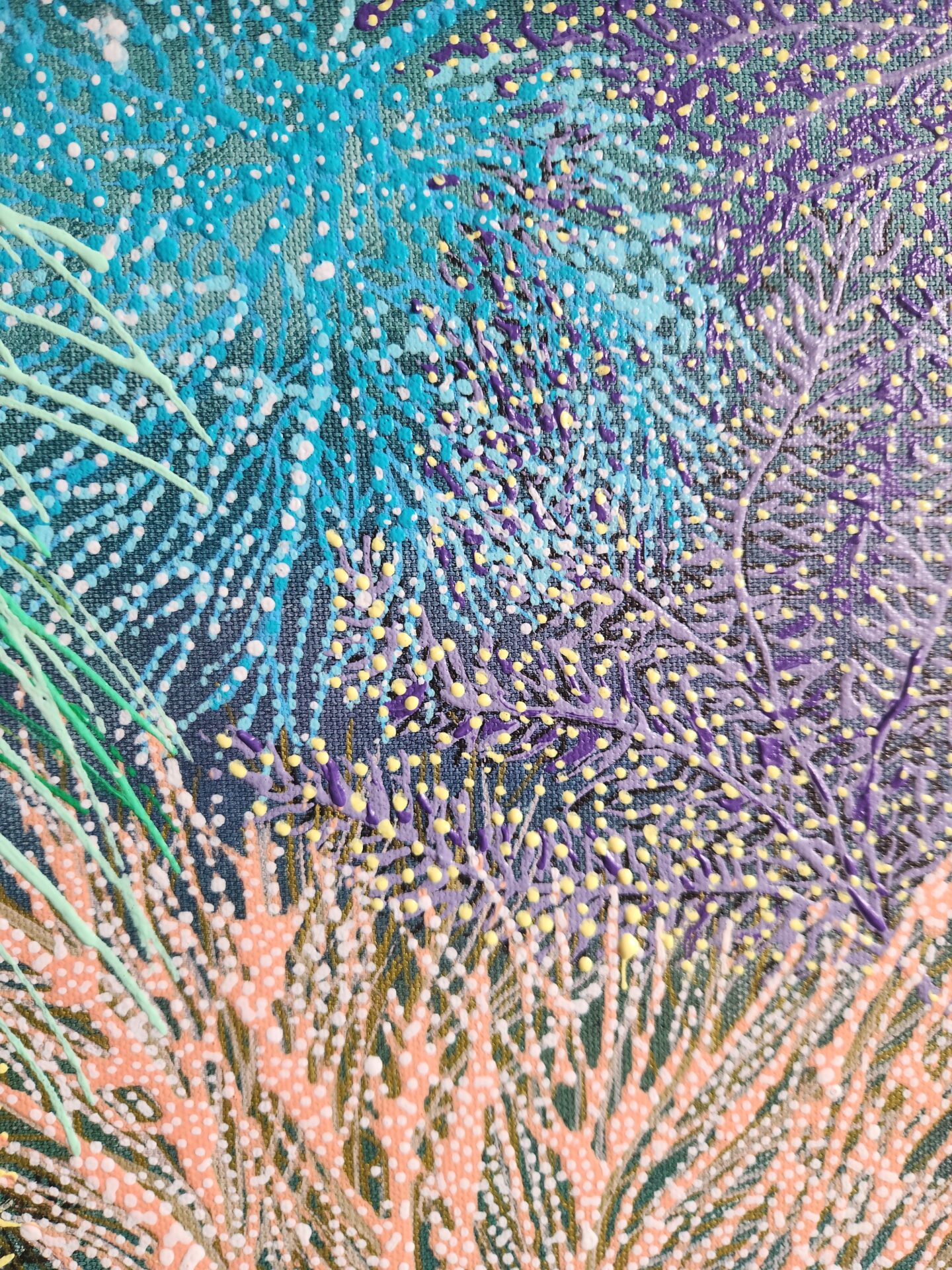 Coral Symphony 2 is an abstract nature-inspired painting that illuminates the interplay between organic forms and vibrant color. In this piece, I have carefully layered textural elements to evoke the delicate complexities of botanical life and underwater coral reefs. By merging flowing lines with dynamic brushstrokes, my goal is to create an immersive experience where the viewer can continually discover new shapes, patterns, and meanings, an invitation to explore the boundless transformations found in nature.