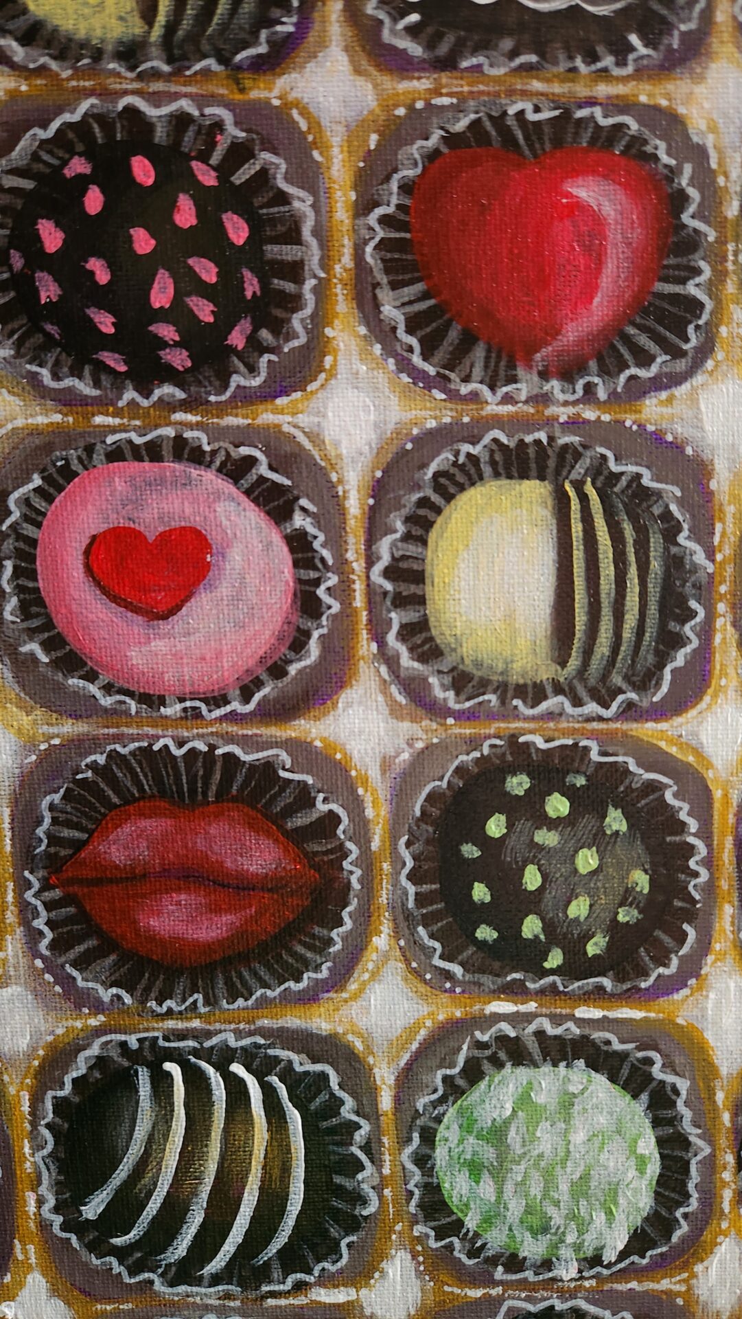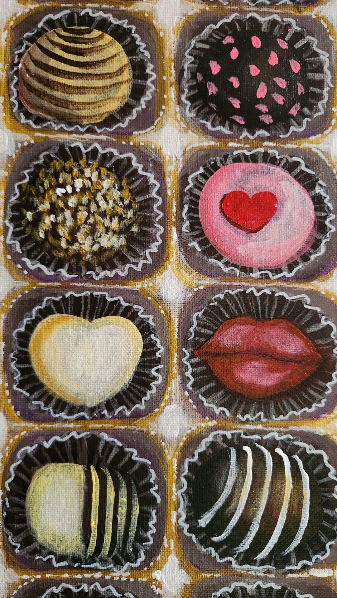 A Tray of Fancy Chocolates is a vibrant painting celebrating the artistry and indulgence of fine chocolates. Each piece, with intricate details and textures, symbolizes joy, celebration, and the beauty of life’s small pleasures, making it a warm and elegant addition to any space.