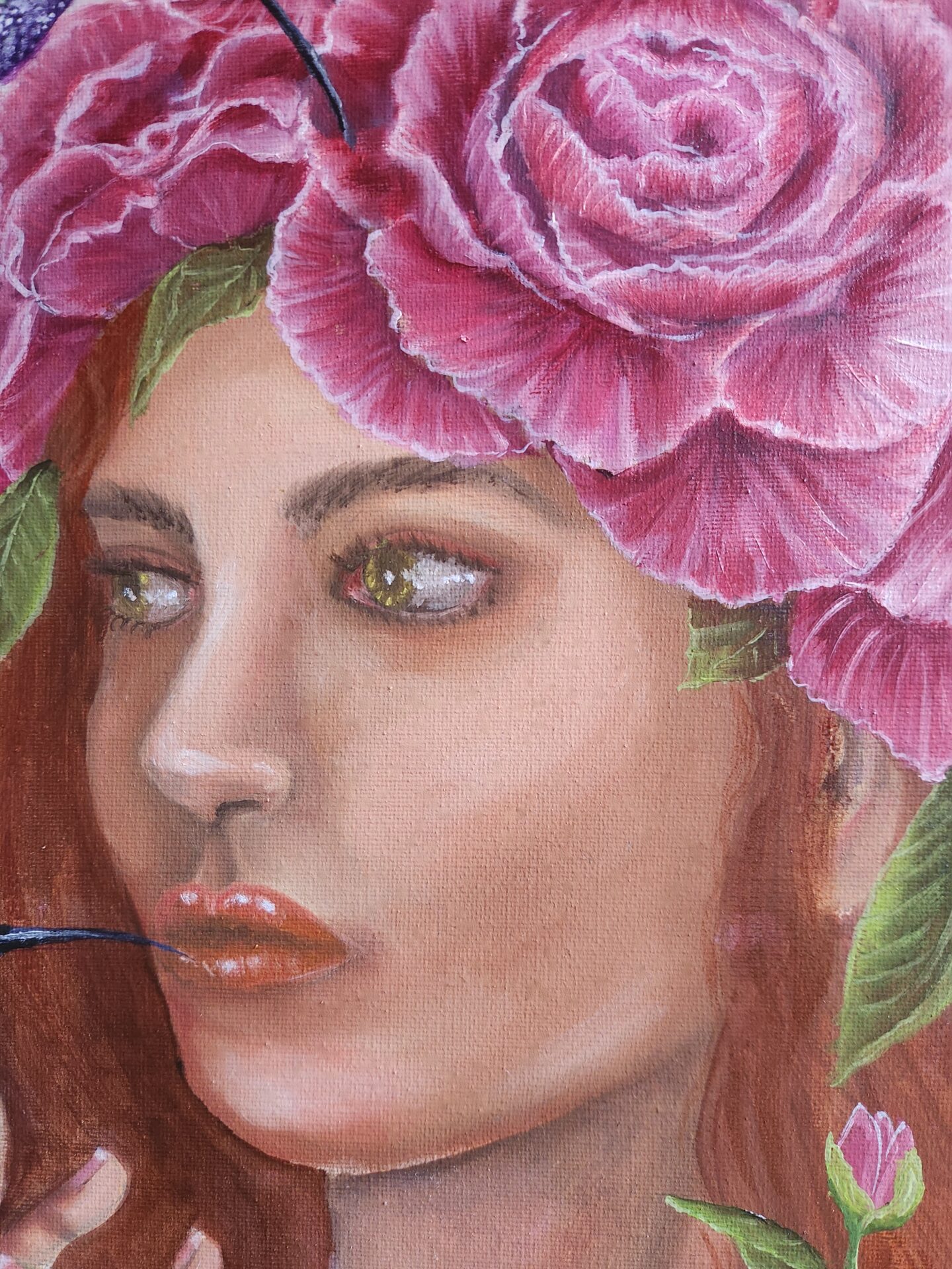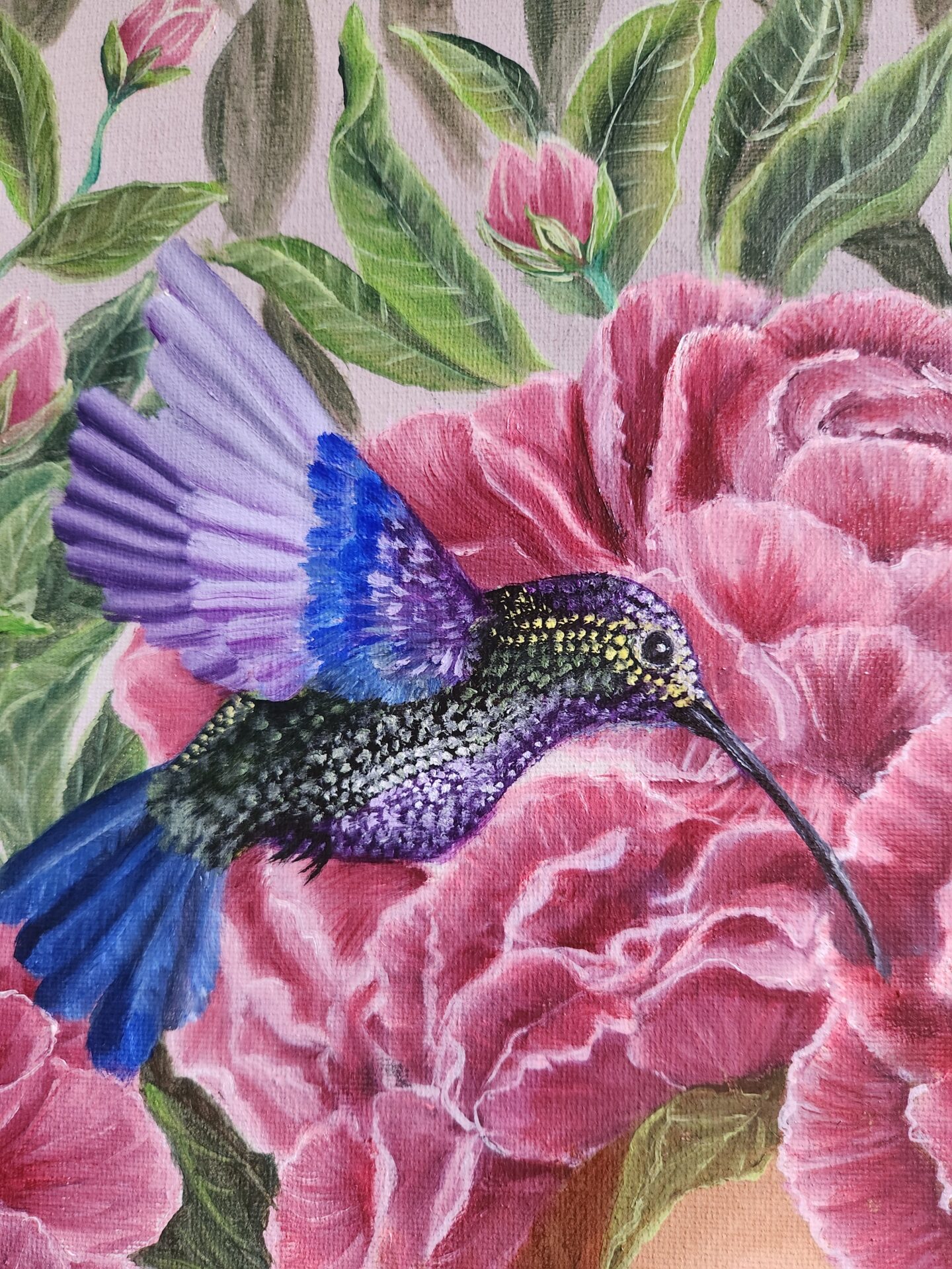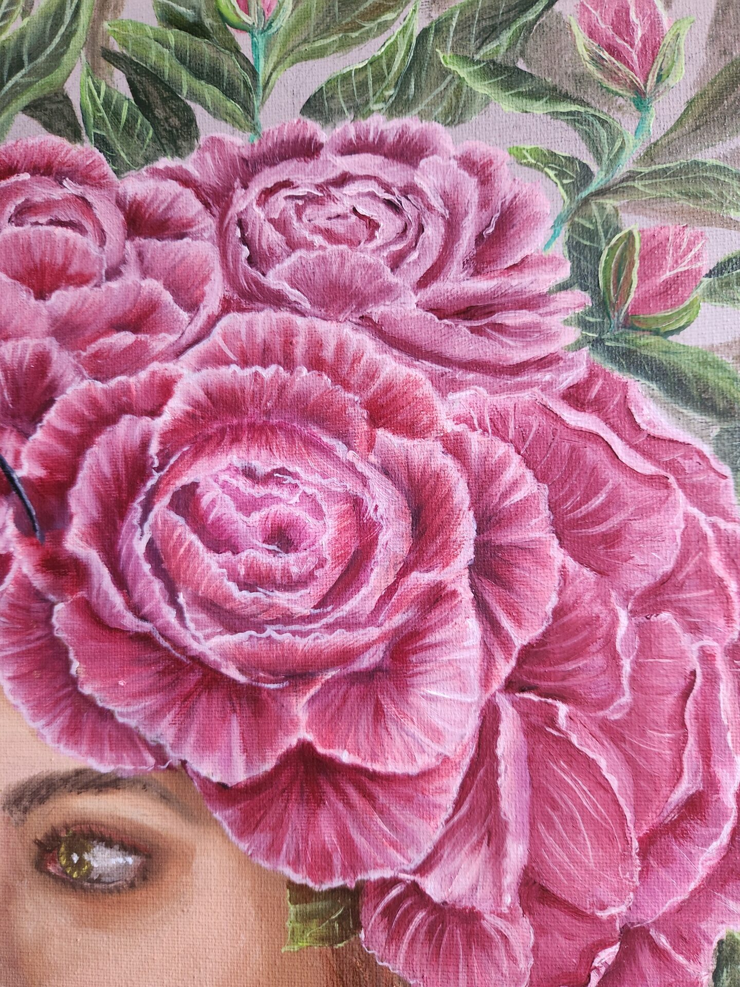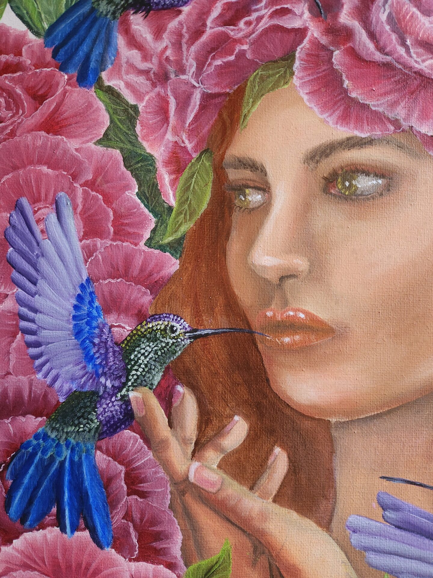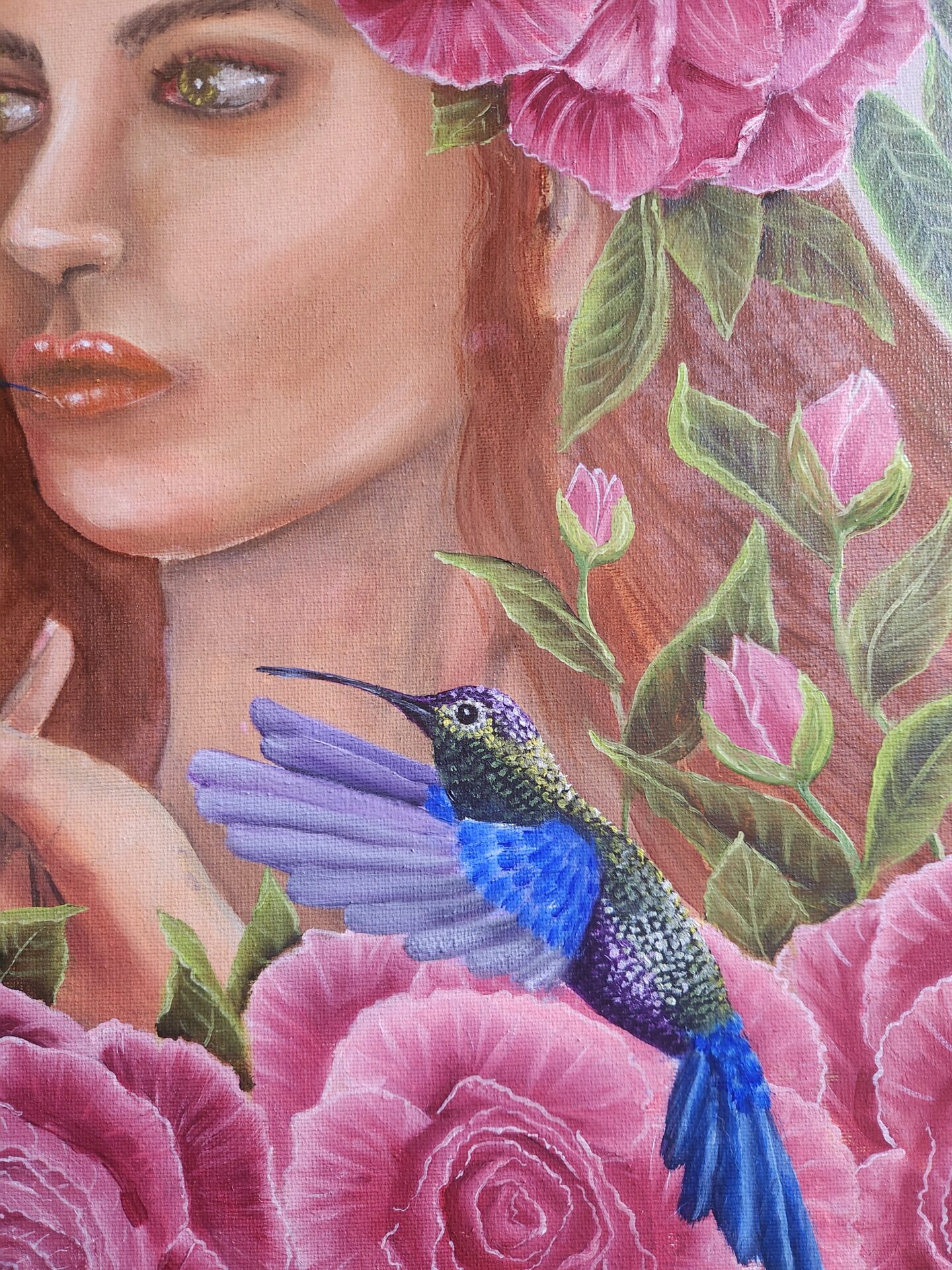 In this painting, I wanted to capture the profound feeling of breaking free—an inner liberation that unfolds gently, like the petals of a blooming peony. The woman’s gaze, framed by vibrant flowers, conveys strength, introspection, and the transformative journey of self-discovery. Surrounding her are hummingbirds, their delicate wings symbolizing the joyful energy and lightness that come with true emancipation.