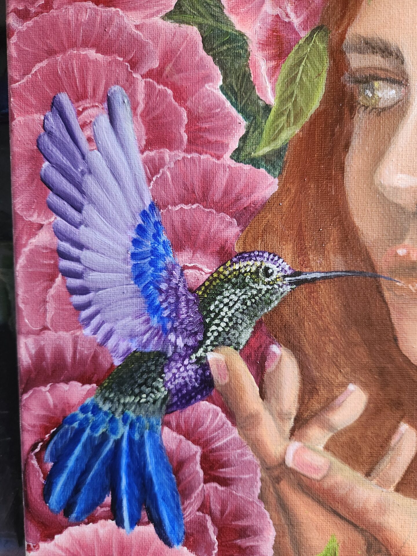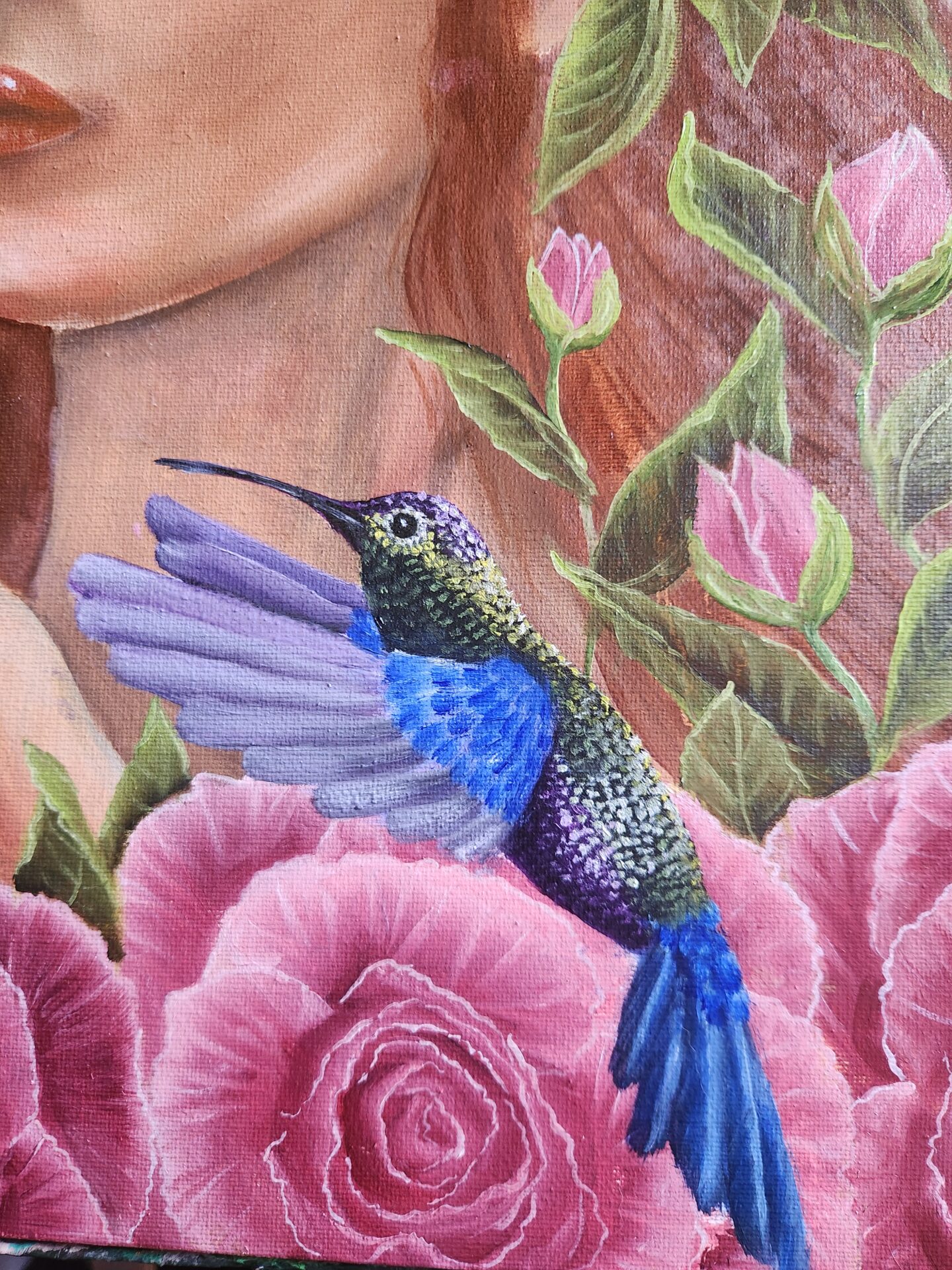 This piece is a visual reminder that freedom begins within us, nurtured by the beauty of nature and the vibrant spark of our own spirit. The harmonious connection between the woman and the hummingbirds reflects the balance of strength and grace it takes to live authentically. For me, this painting is a declaration: finally, I can live on my own terms. I hope it inspires others to embrace their journey toward inner freedom and self-expression.