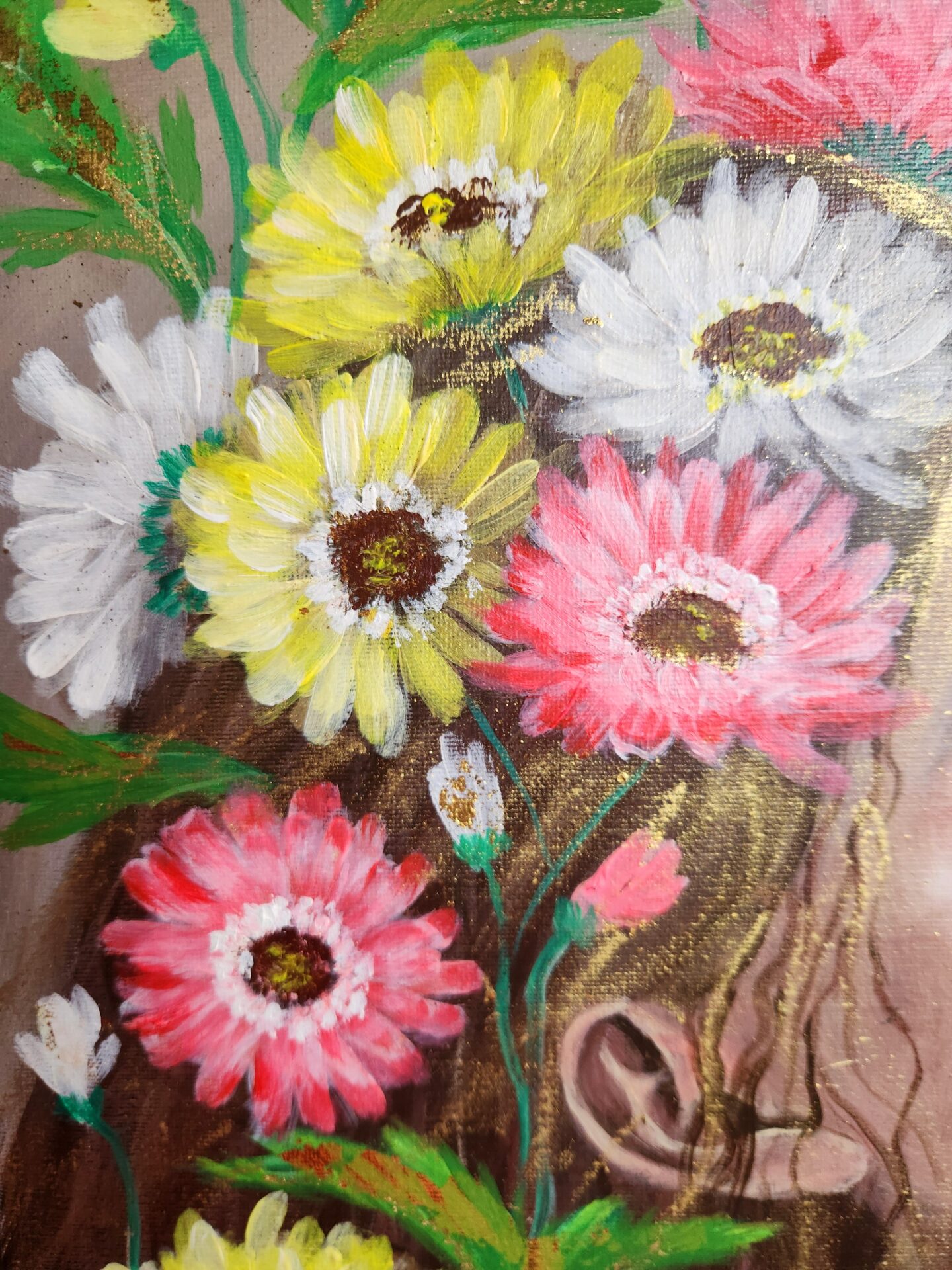 The cascading gerberas, with their vivid yellows, whites, and pinks, symbolize hope, resilience, and renewal. Their blooms intertwine with her hair, as if she is one with nature, embodying a journey of healing and rebirth. Each petal whispers a story of growth, reminding us that even in challenging environments, we can rise, bloom, and thrive.