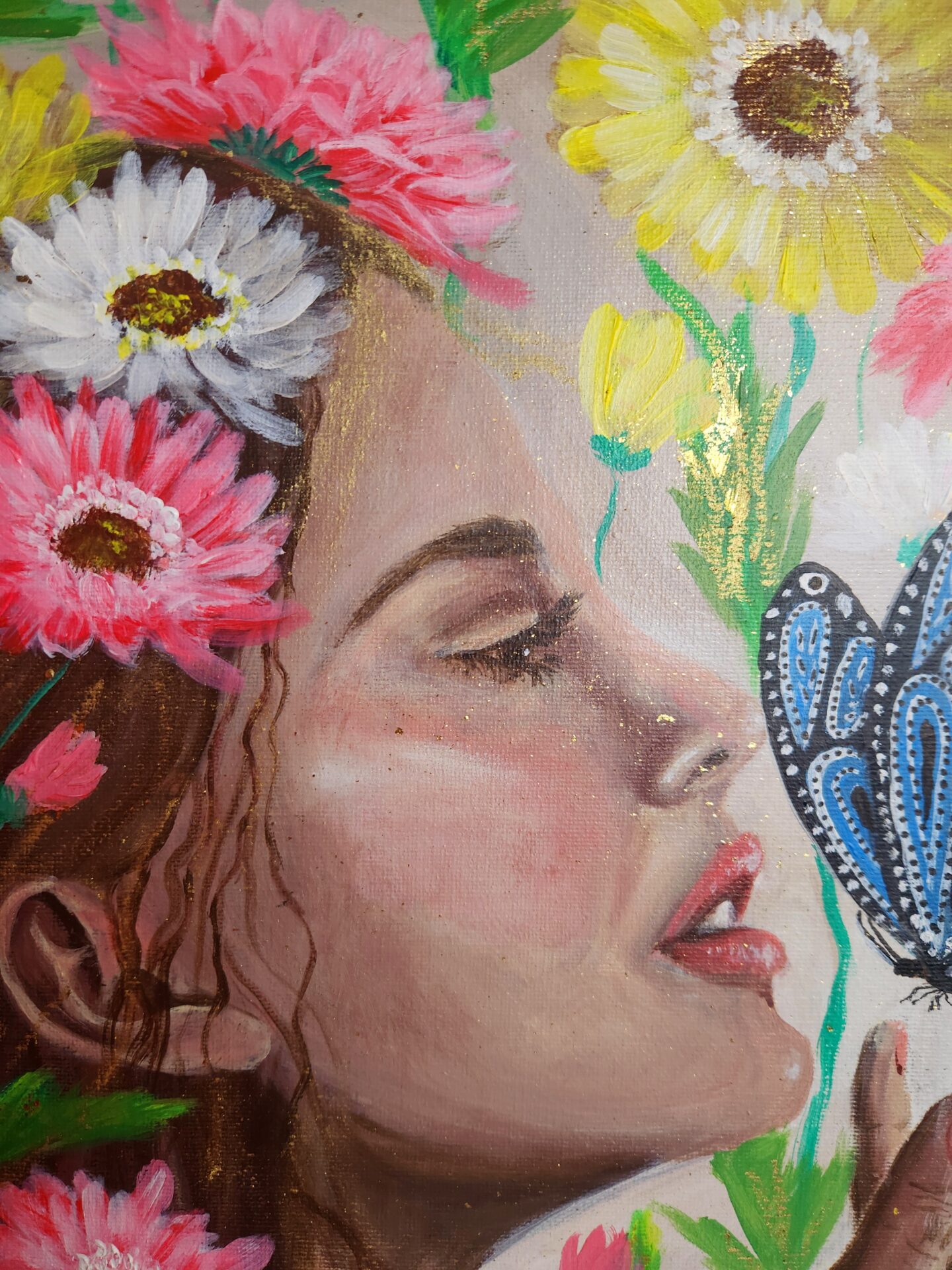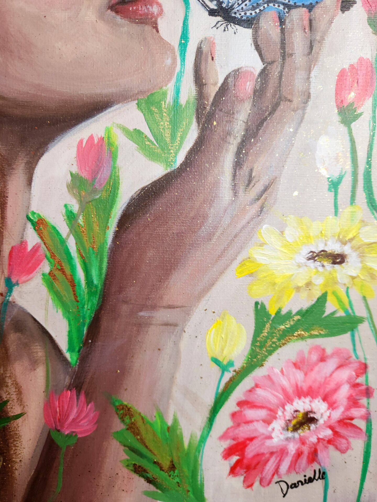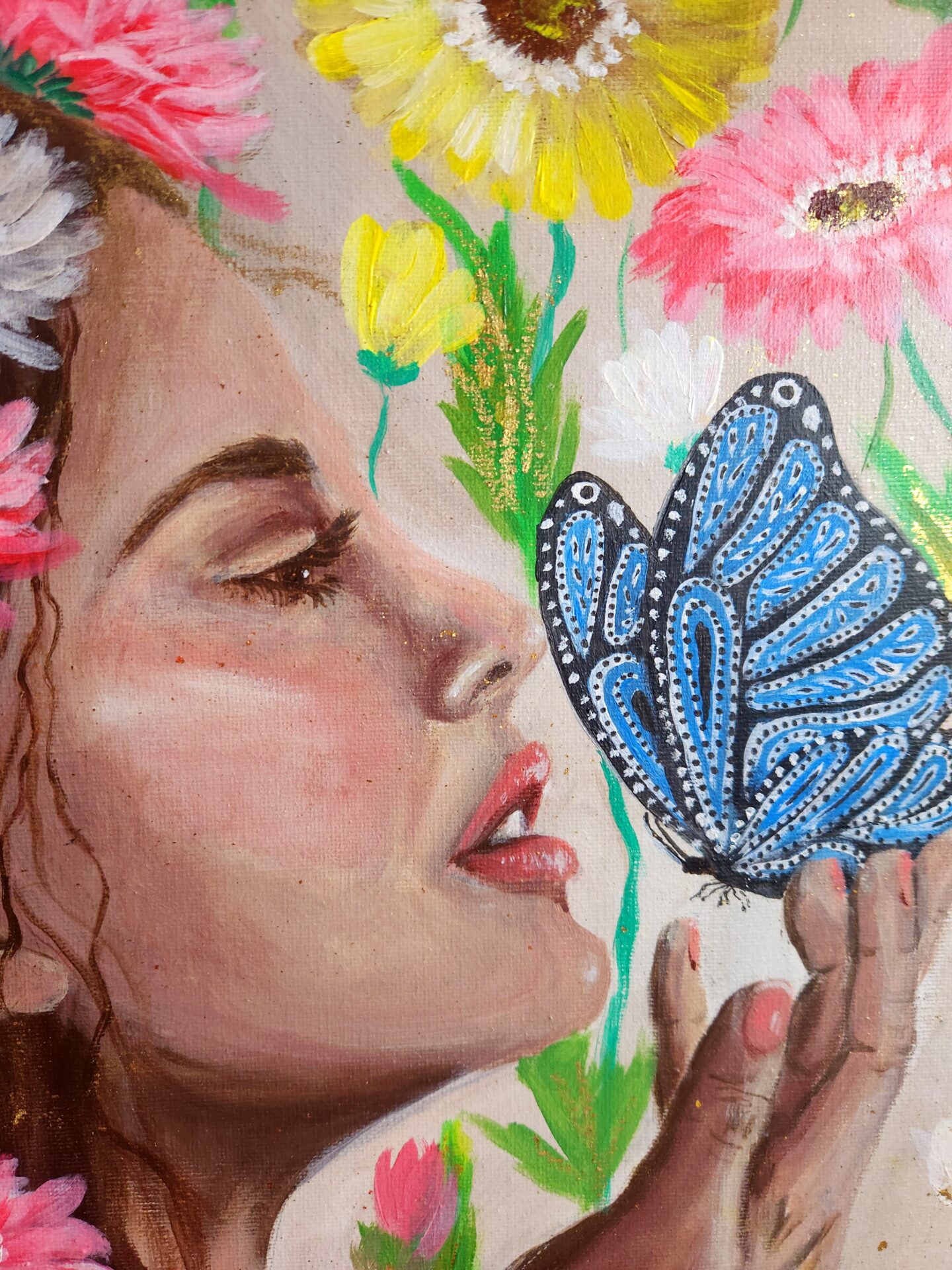 When I created this painting, I wanted to tell a story about metamorphosis, the beauty of change, and the freedom that comes with letting go. The girl in this piece, with her head tilted back and eyes closed, holds a delicate butterfly—an eternal symbol of transformation. The butterfly, painted in vibrant detail, represents a moment of liberation, a release from pain, and a departure from toxic places and people that no longer serve our growth. It’s a celebration of personal evolution, of finding strength in vulnerability, and of embracing the new chapters life offers us.