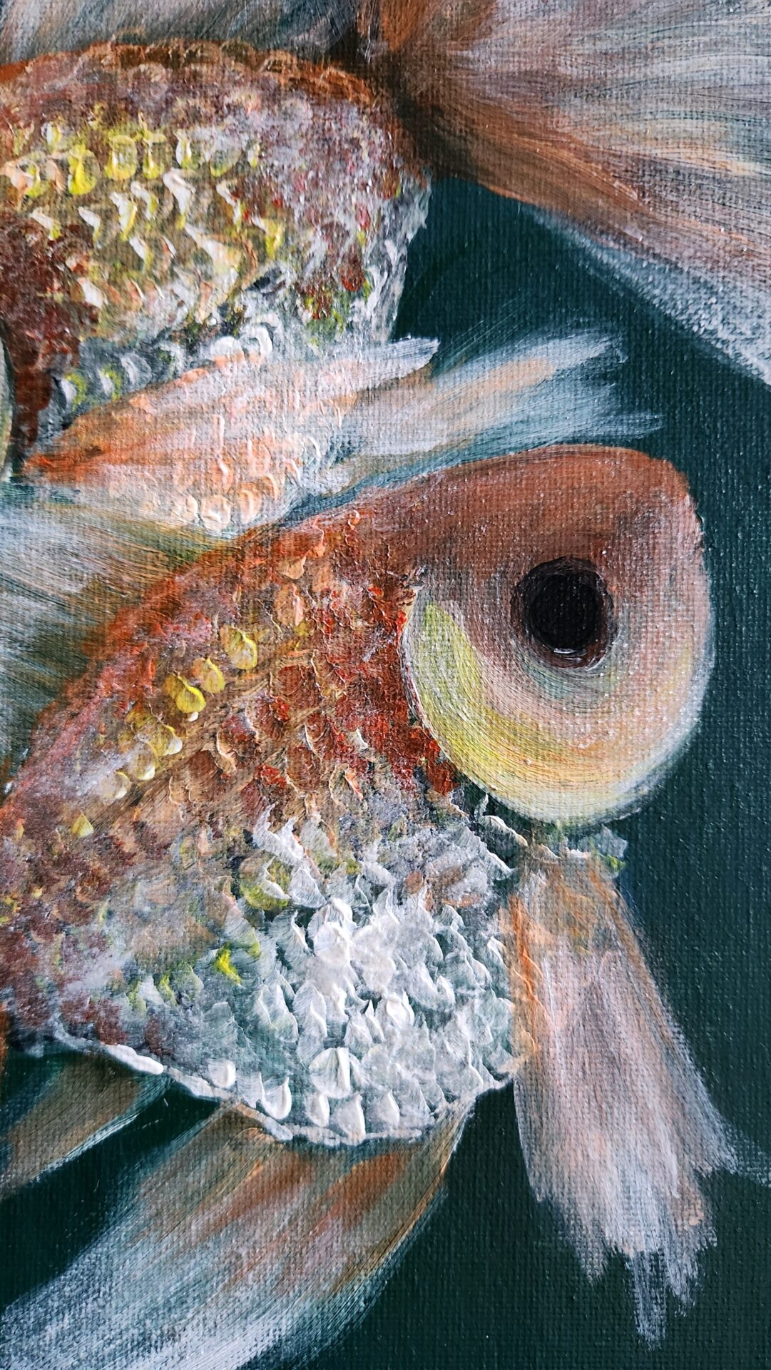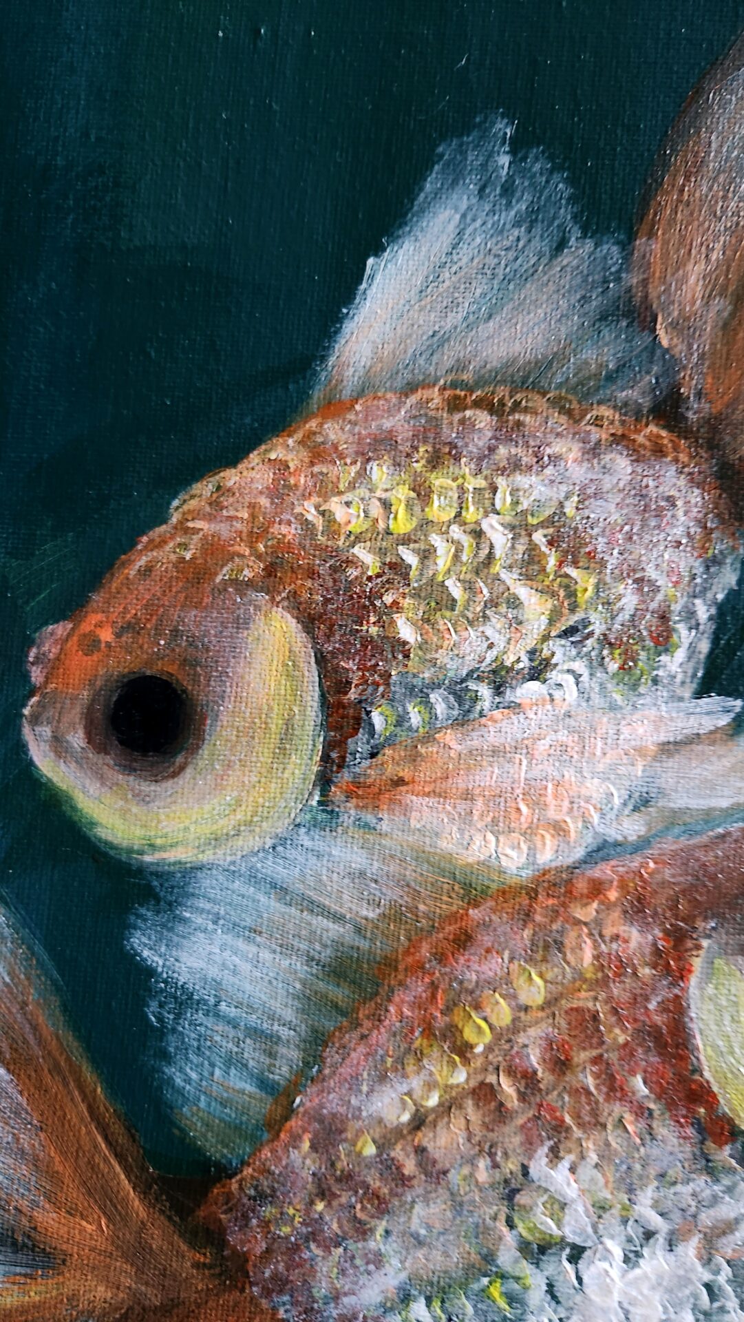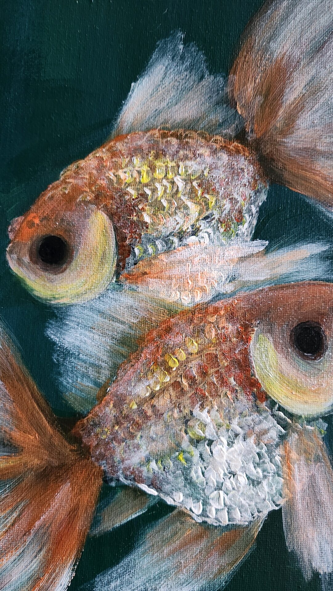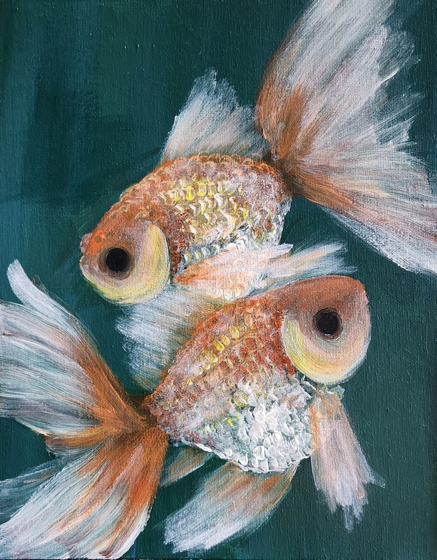 Goldfish Trio 1 captures the serene beauty of two goldfish with flowing fins and shimmering orange and silver scales. This painting celebrates harmony, balance, and the peaceful rhythms of nature, making it a calming and elegant addition to any space.