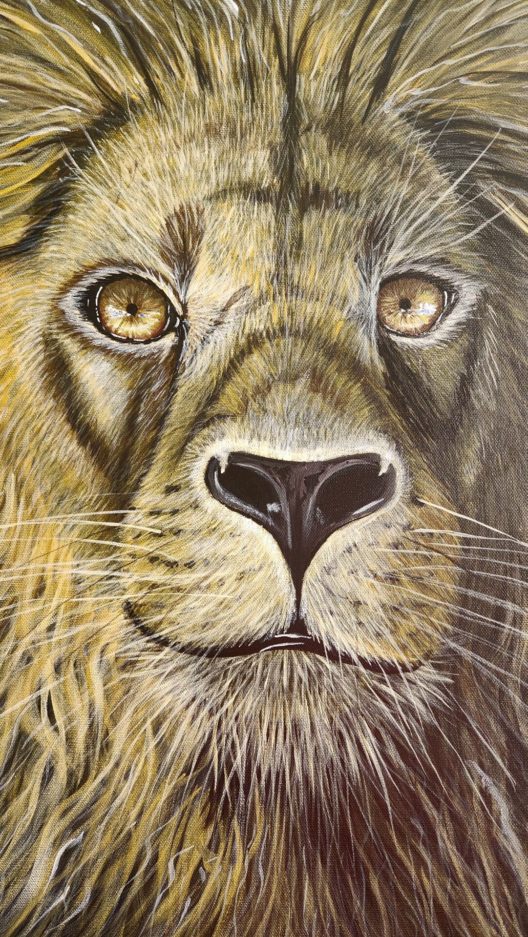 This painting, titled Heart of a Lion, is a tribute to the quiet strength and unwavering courage that lies within us all. As I painted this majestic lion, I was struck by the depth of his gaze—calm yet commanding, fierce yet compassionate. Every detail, from the flowing golden mane to the intensity of his piercing eyes, was crafted to embody the spirit of resilience and inner power.