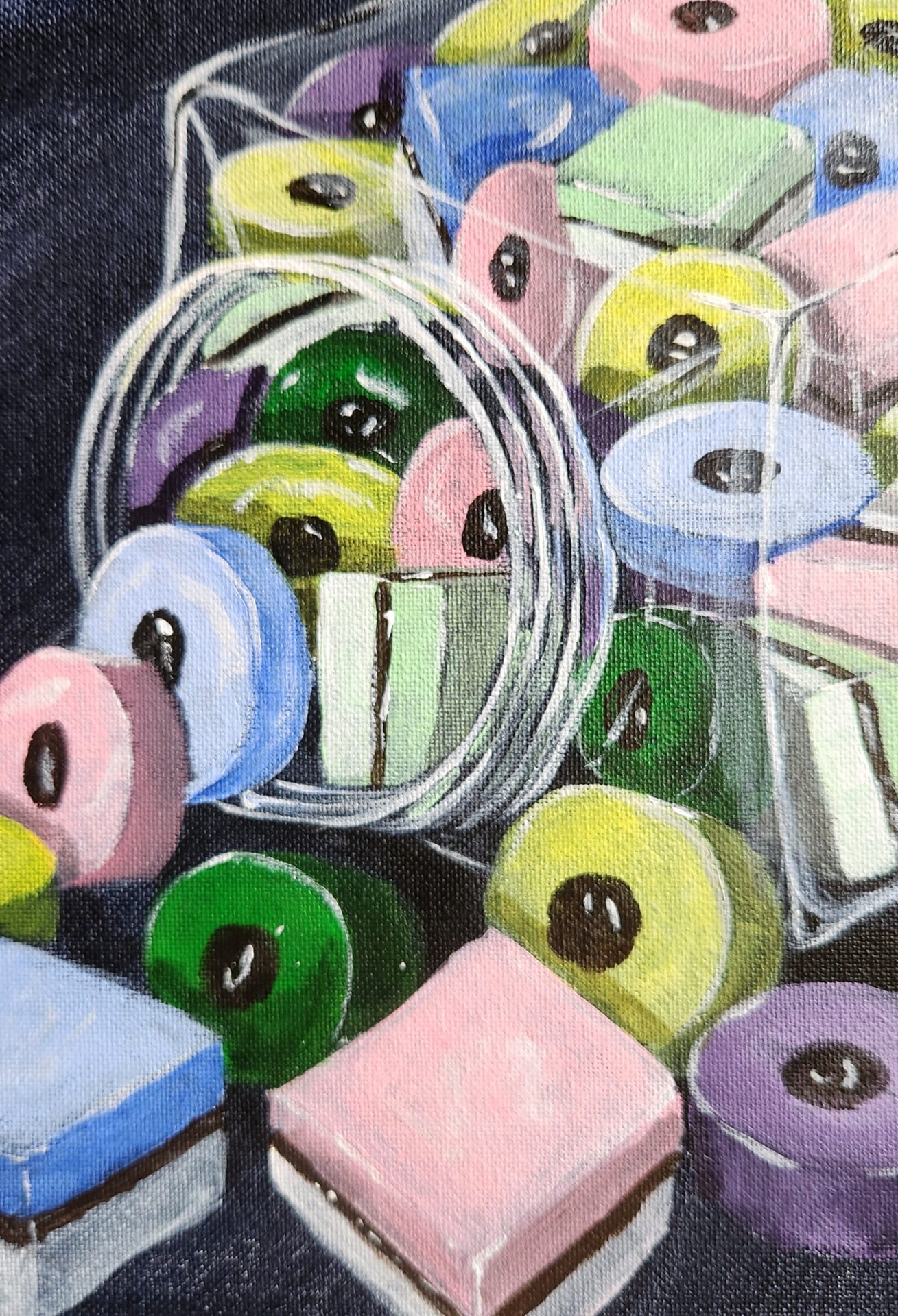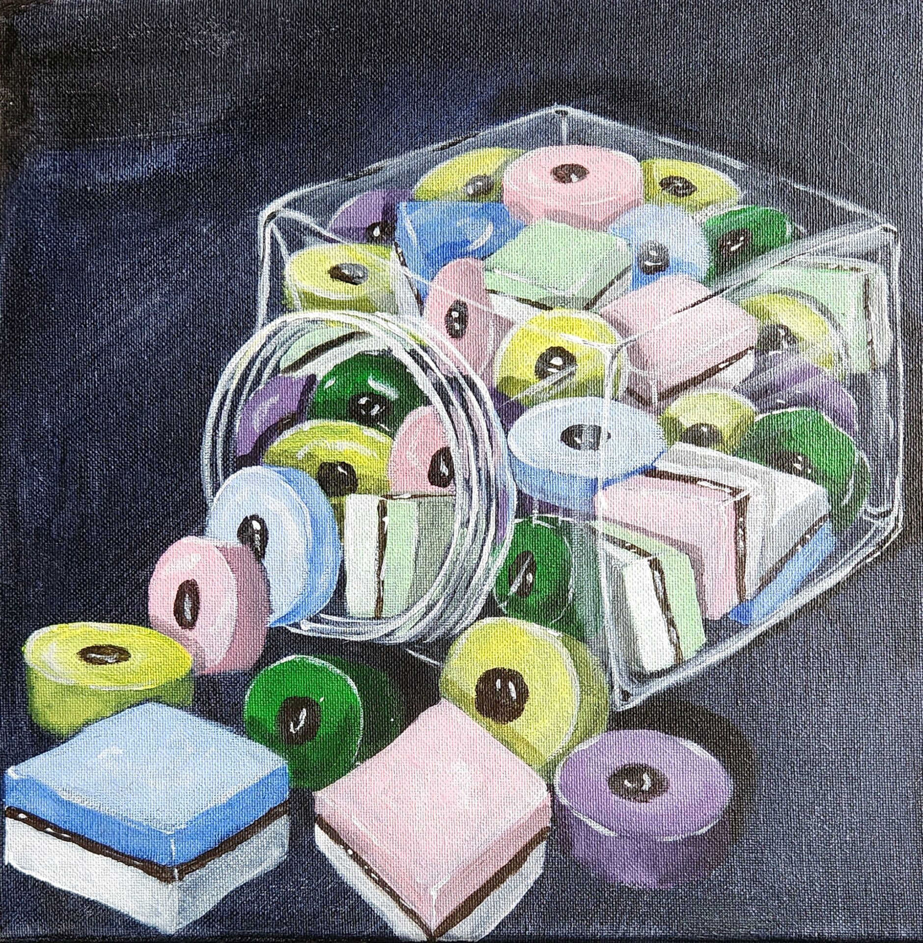 The rich, dark background enhances the vivid colors of the licorice, making them almost pop off the canvas. For me, this piece is not just about the candies themselves but the stories and emotions tied to them—the excitement of opening a jar, the sweetness of sharing, and the comfort of revisiting treasured memories.