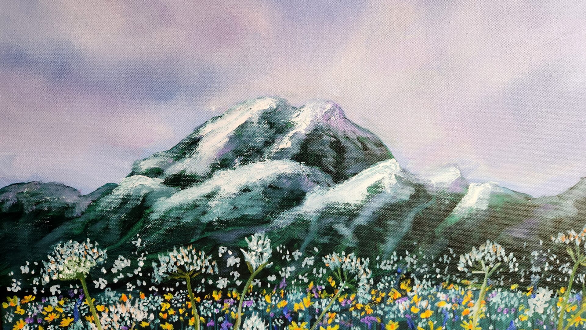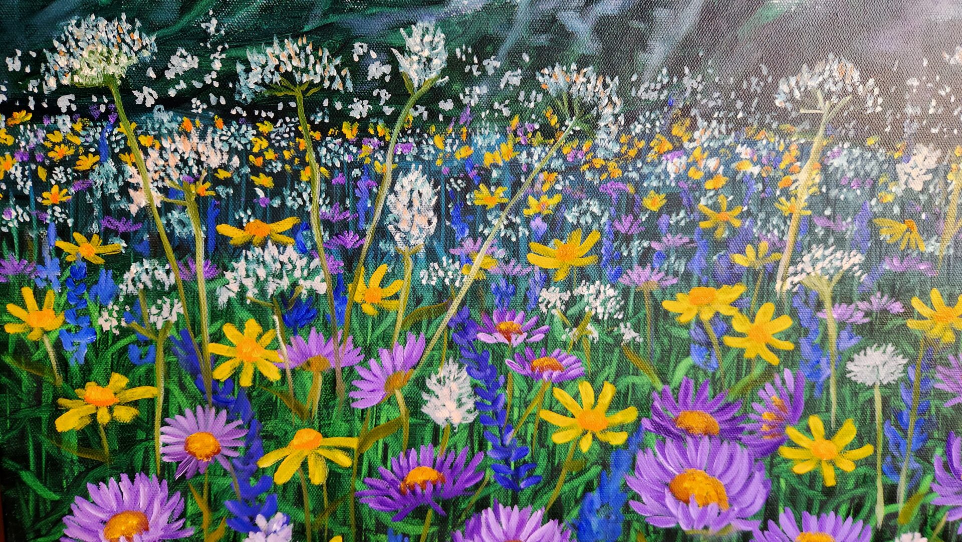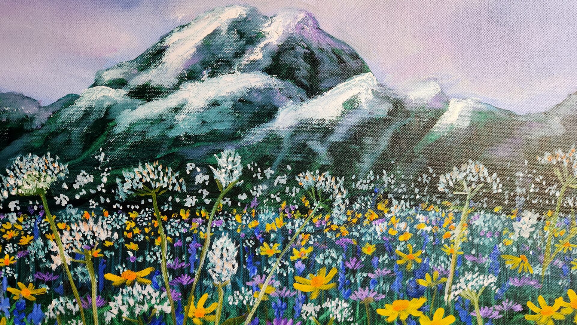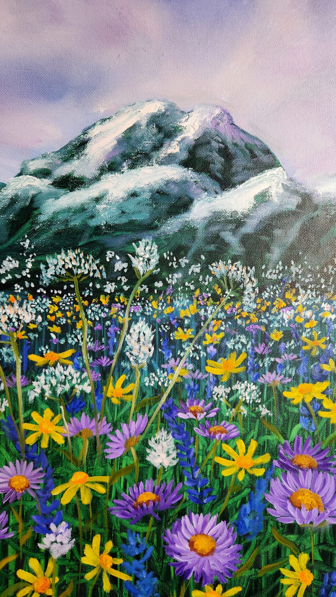 “Meadow Serenity” is a vibrant painting of an alpine meadow filled with wildflowers set against majestic snow-capped mountains. This artwork celebrates the beauty, resilience, and tranquility of nature, making it a calming and uplifting centerpiece for any space. Perfect for collectors seeking meaningful, nature-inspired art that radiates peace and positivity.