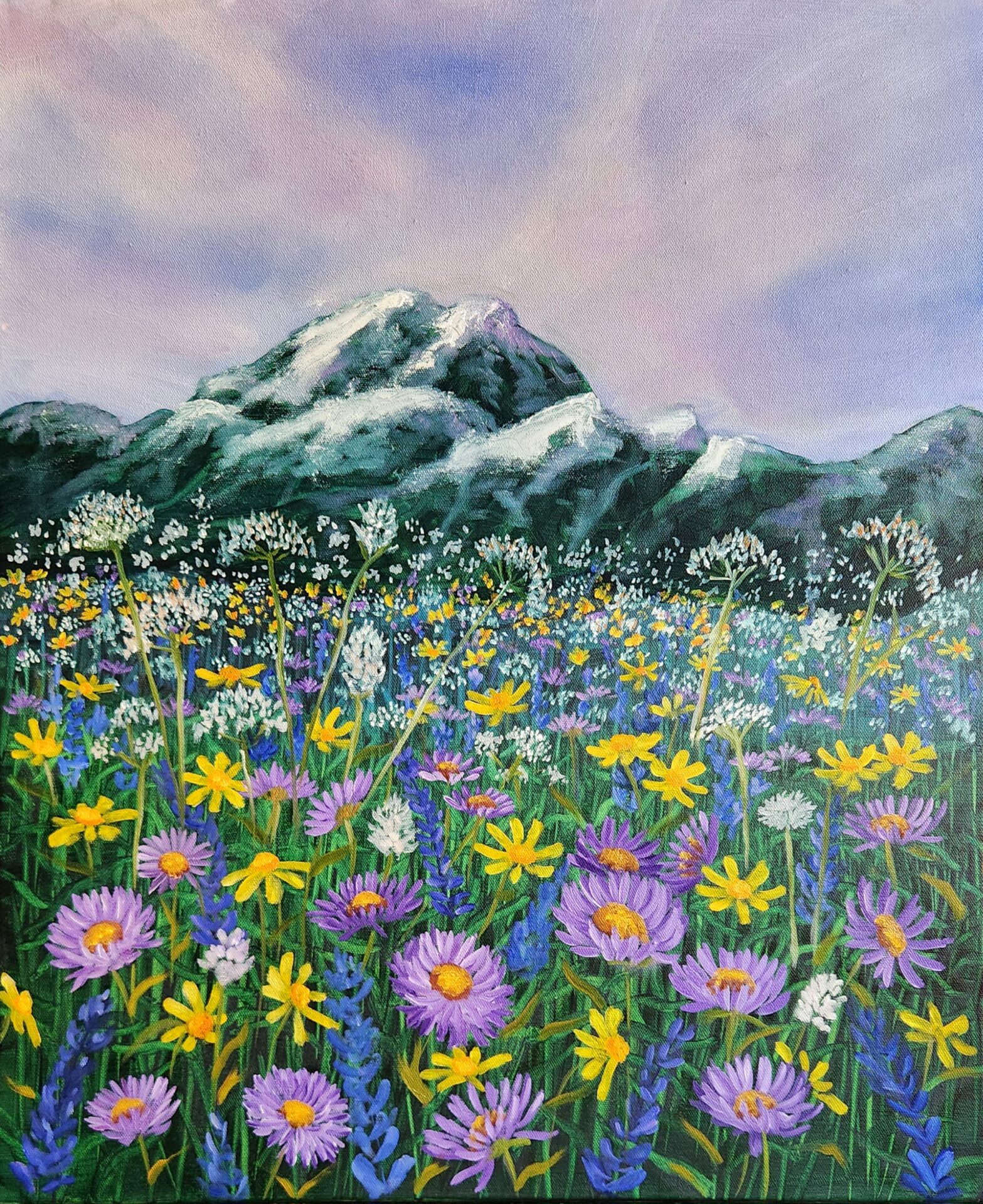 As I painted “Meadow Serenity,” I imagined standing amidst a vibrant alpine meadow, surrounded by wildflowers swaying gently in the breeze, with majestic snow-capped mountains in the distance. This piece is a celebration of nature’s boundless beauty, offering a sense of tranquility and renewal. The vivid purples, yellows, and greens of the flowers symbolize resilience and growth, while the serene mountains represent strength and permanence.