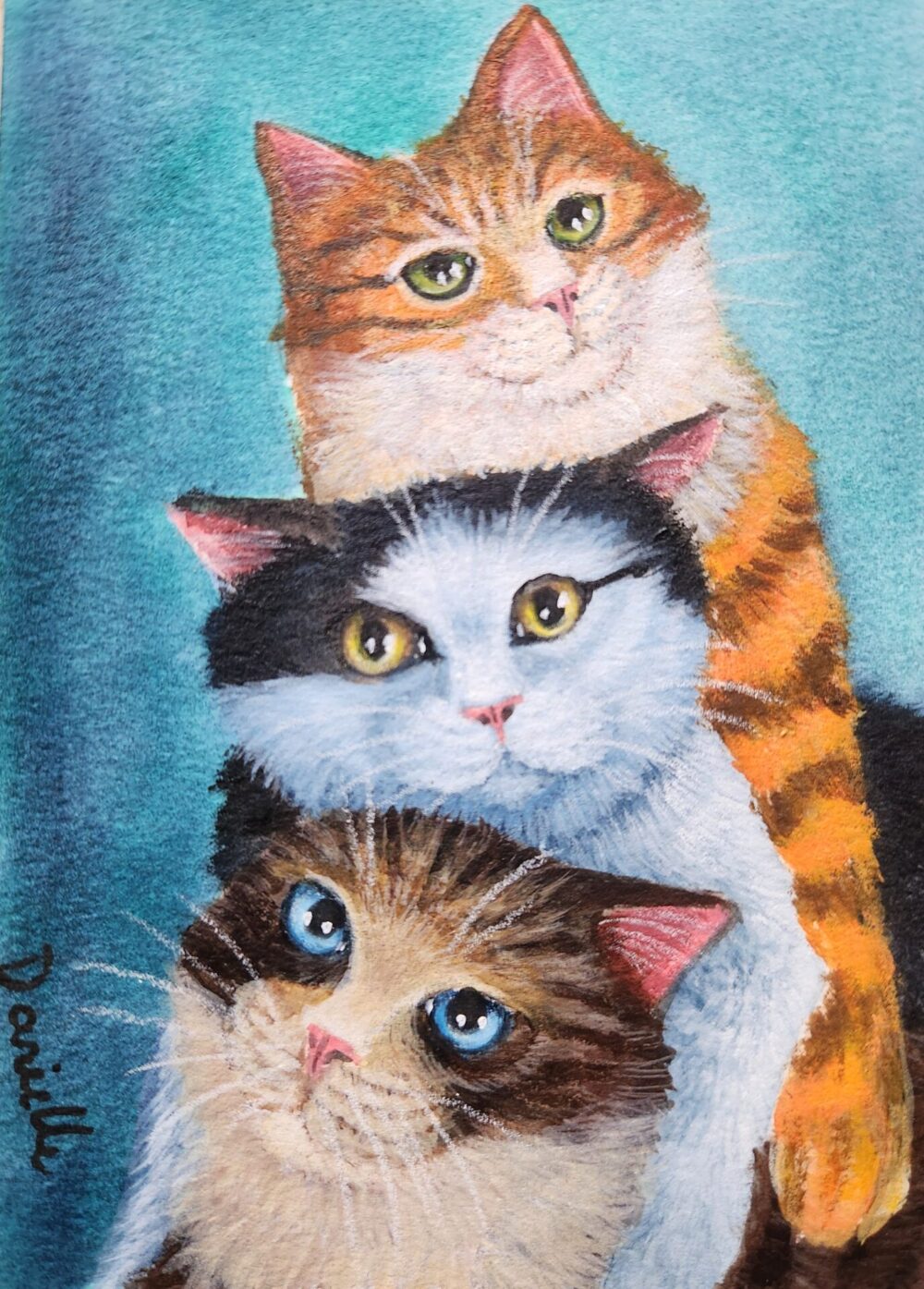 A tender stack of three cats nestled closely together, Mochi Cats – Cuddle Pile captures the comfort, trust, and quiet joy found in shared closeness.