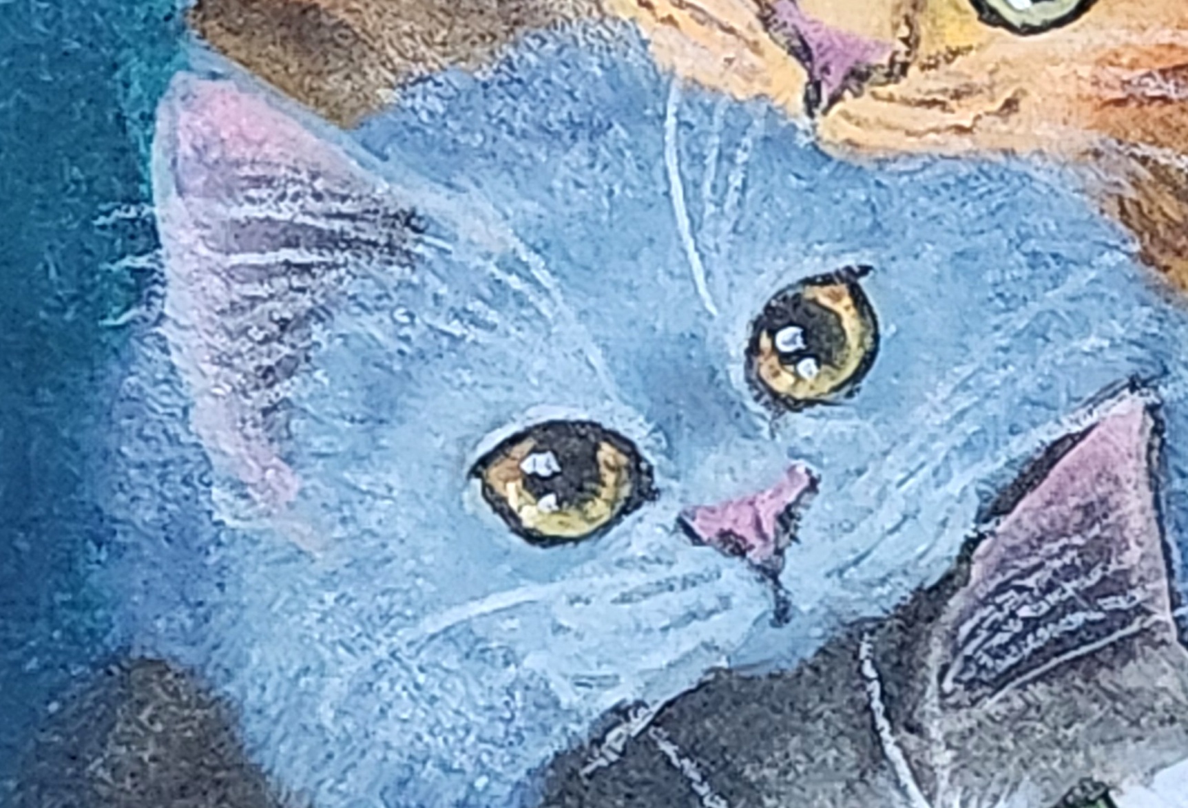 A cozy trio of cuddled-up cats captured in gentle watercolor tones. This heartwarming piece radiates love, calm, and the quiet joy of feline companionship.