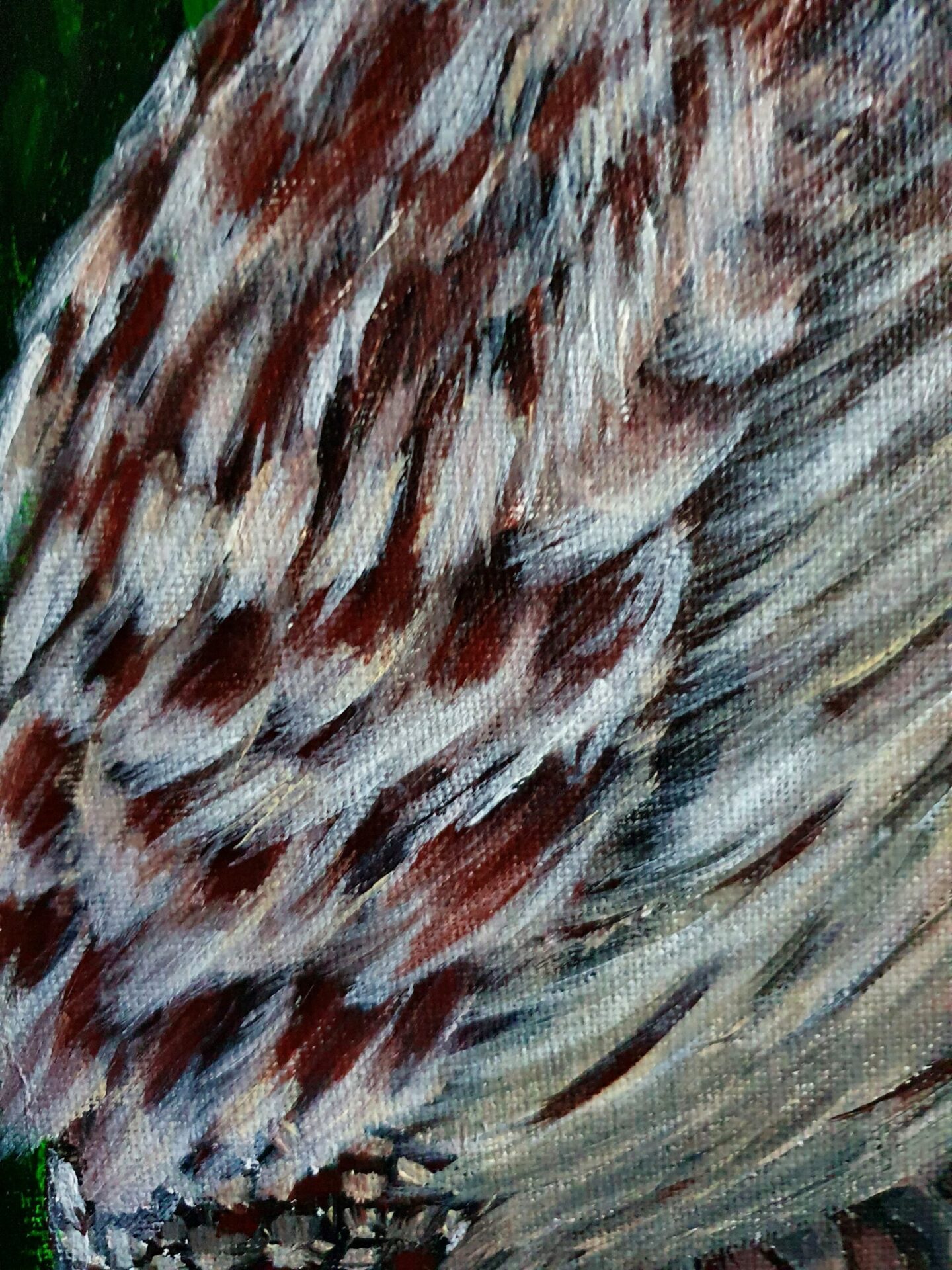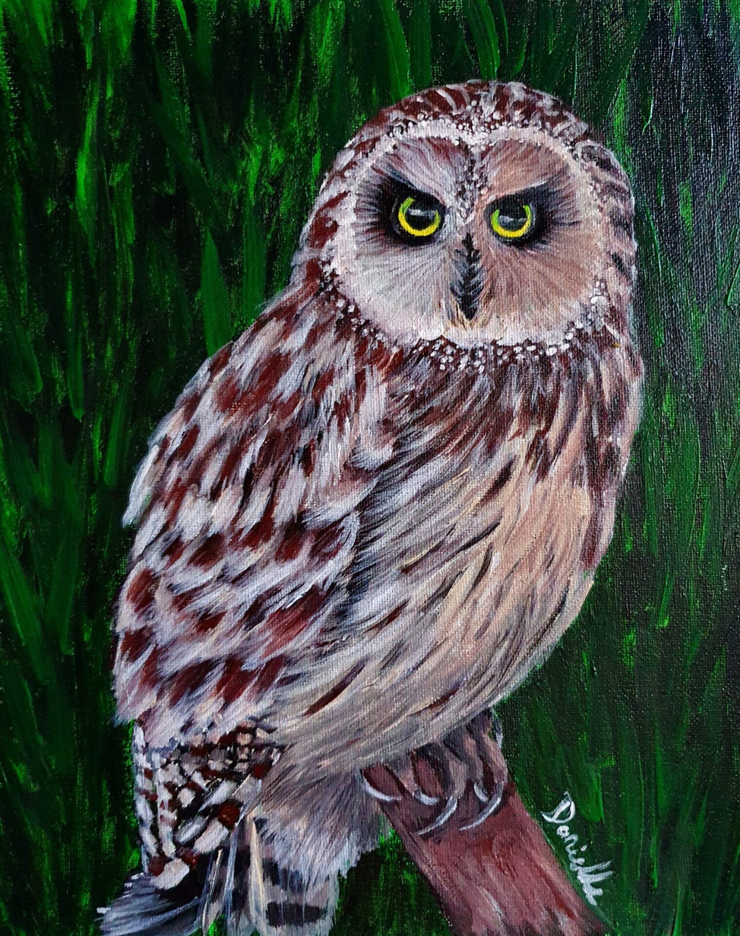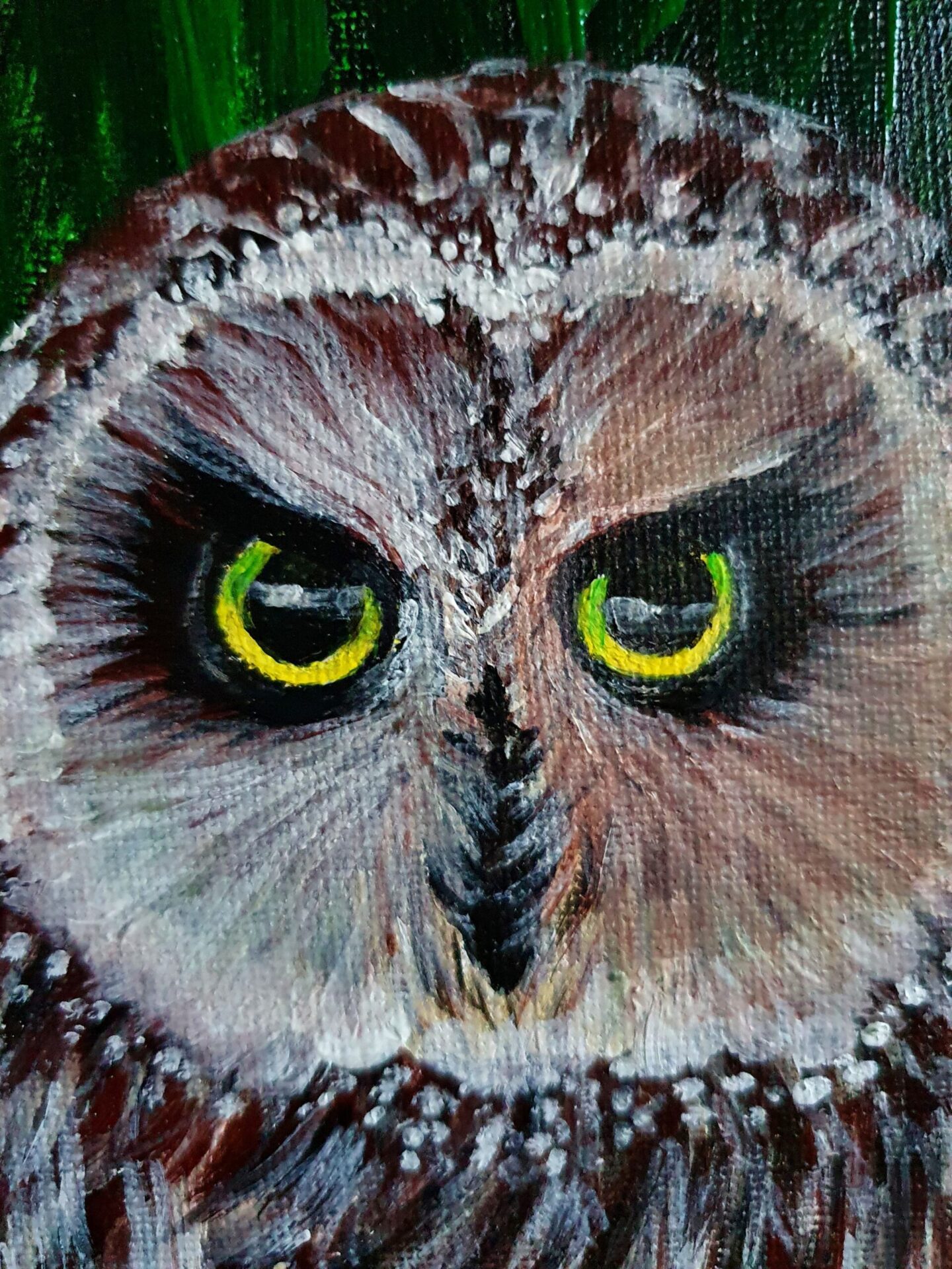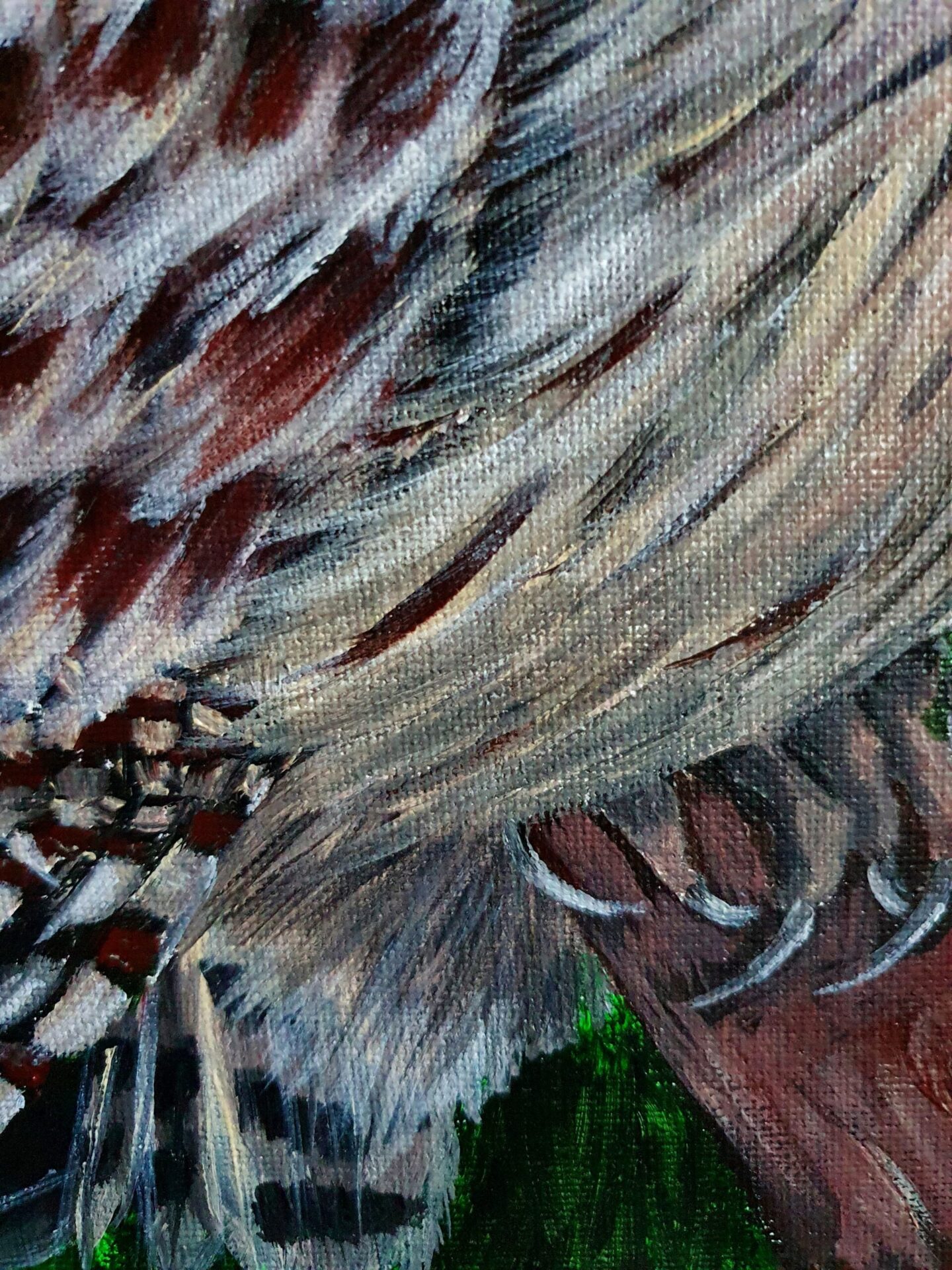 As I worked on this piece, I was inspired by the owl’s reputation as a symbol of insight, intuition, and protection. Each brushstroke was carefully placed to highlight its textured feathers and the contrast between light and shadow, giving the painting a lifelike and dynamic quality. The vibrant green background adds depth, symbolizing the connection between the owl and the natural world it watches over.