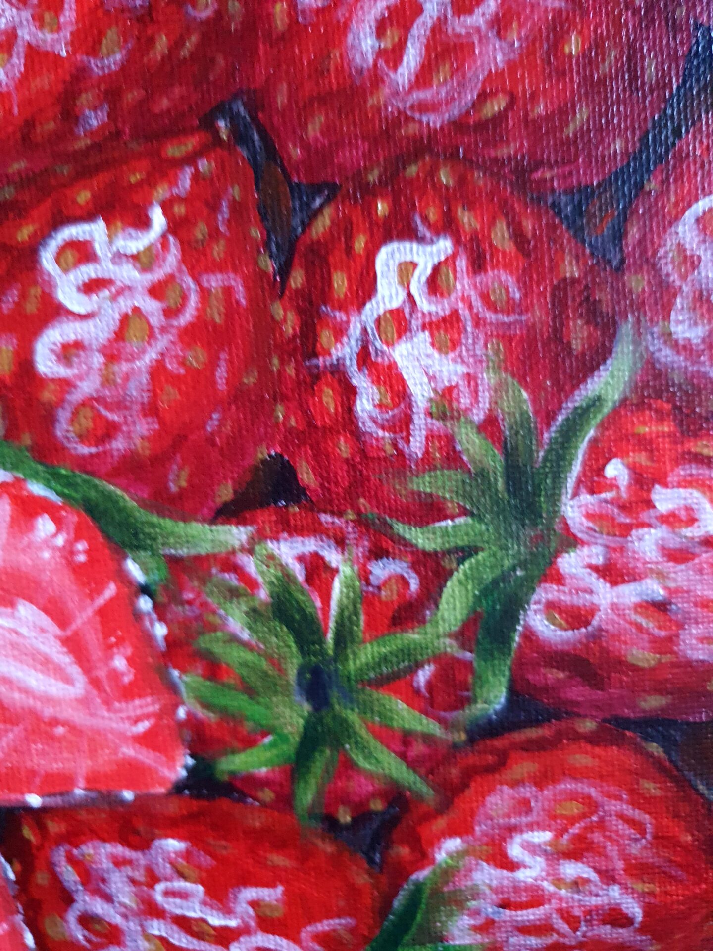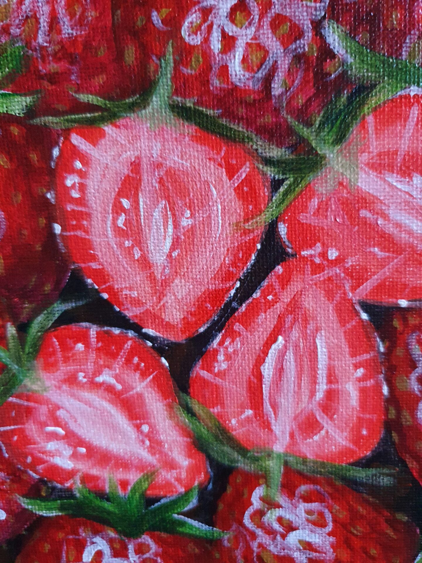 For me, this piece is a celebration of life’s little pleasures—the burst of flavor in a ripe strawberry, the vivid colors of summer, and the memories of picking fruit in the warmth of the sun. The layers of detail, from the delicate seeds to the fresh green stems, invite you to pause, appreciate, and savor the beauty of nature in all its forms.