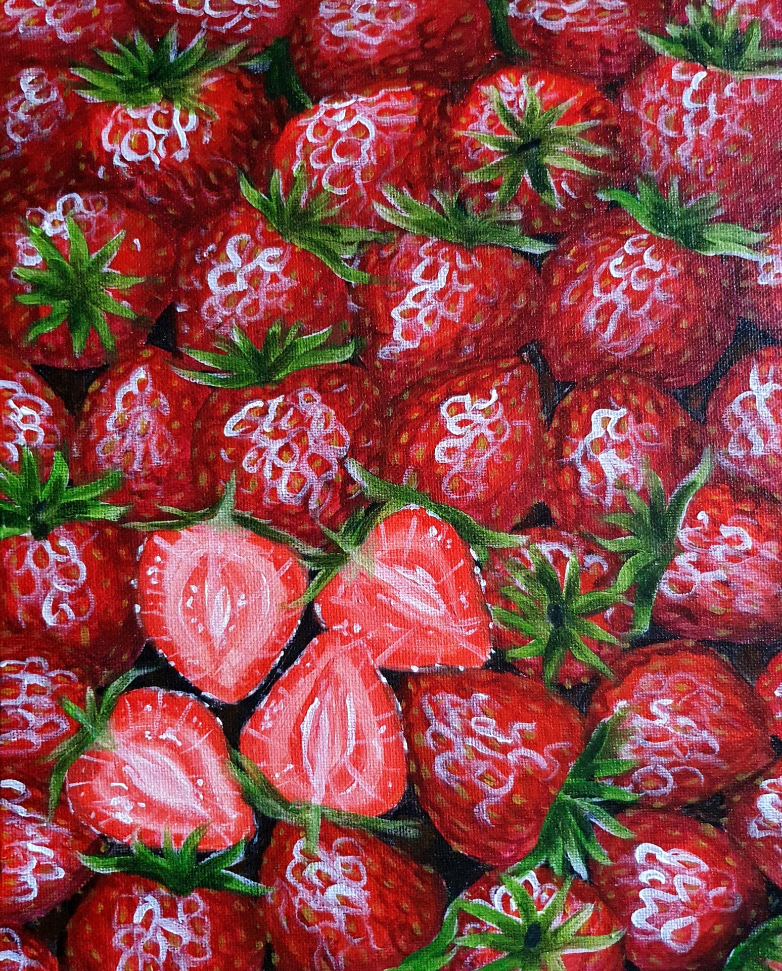 When I created this painting, I wanted to immerse myself in the simple yet profound beauty of nature’s abundance. The luscious, vibrant red strawberries, with their rich textures and juicy, glistening surfaces, evoke a sense of indulgence, freshness, and vitality. By adding the halved strawberries in the composition, I aimed to reveal their intricate, heart-like interiors, symbolizing the sweetness and joy that can be found when we look beyond the surface.
