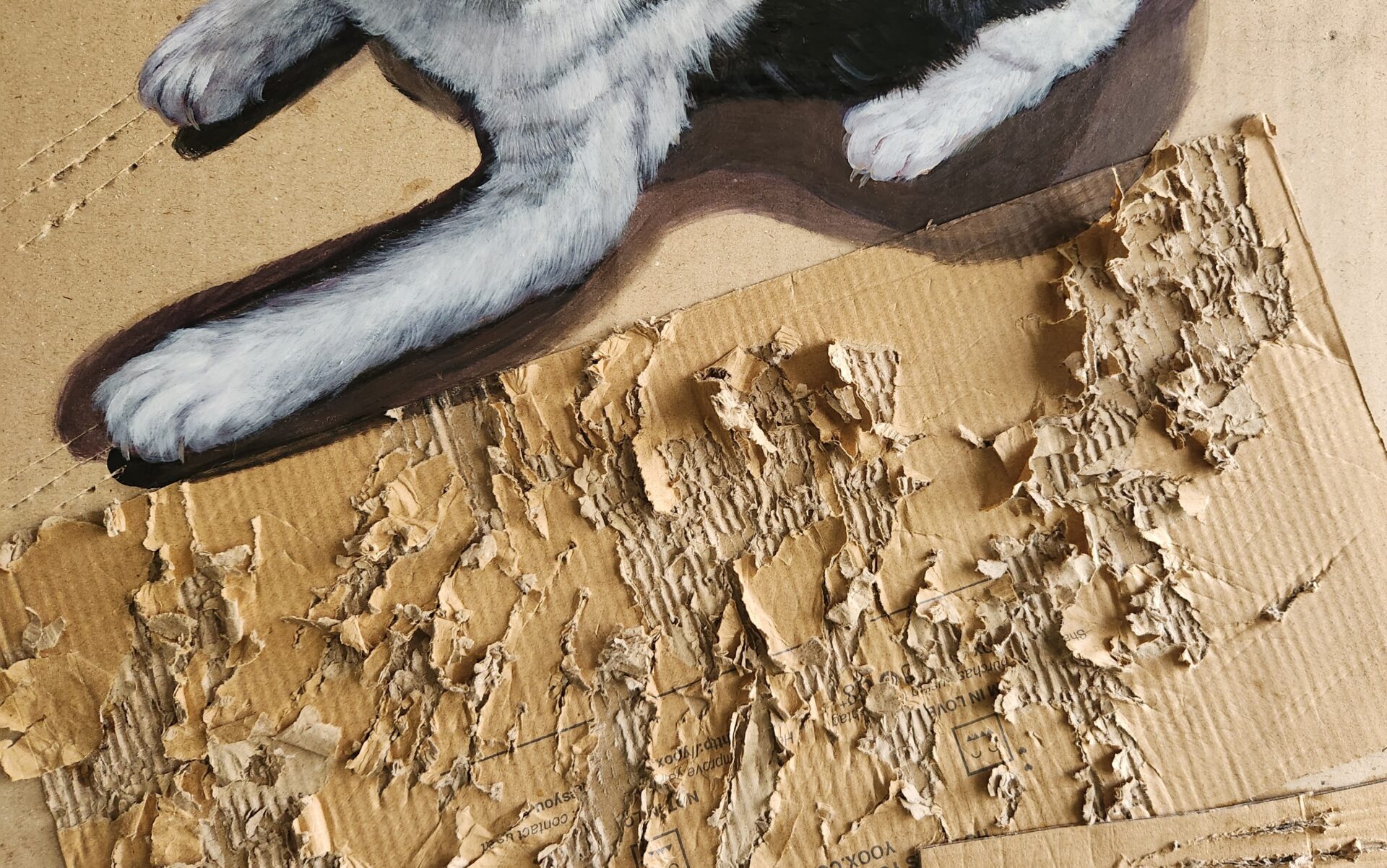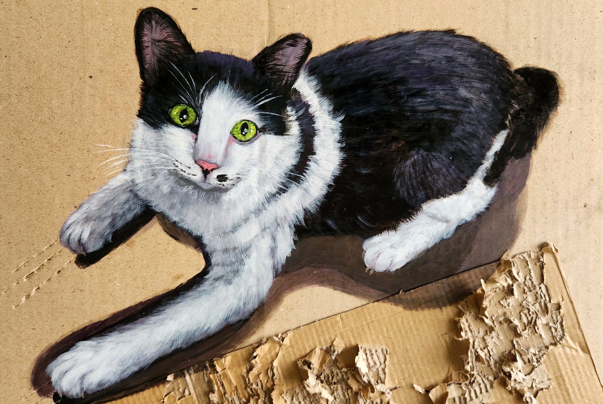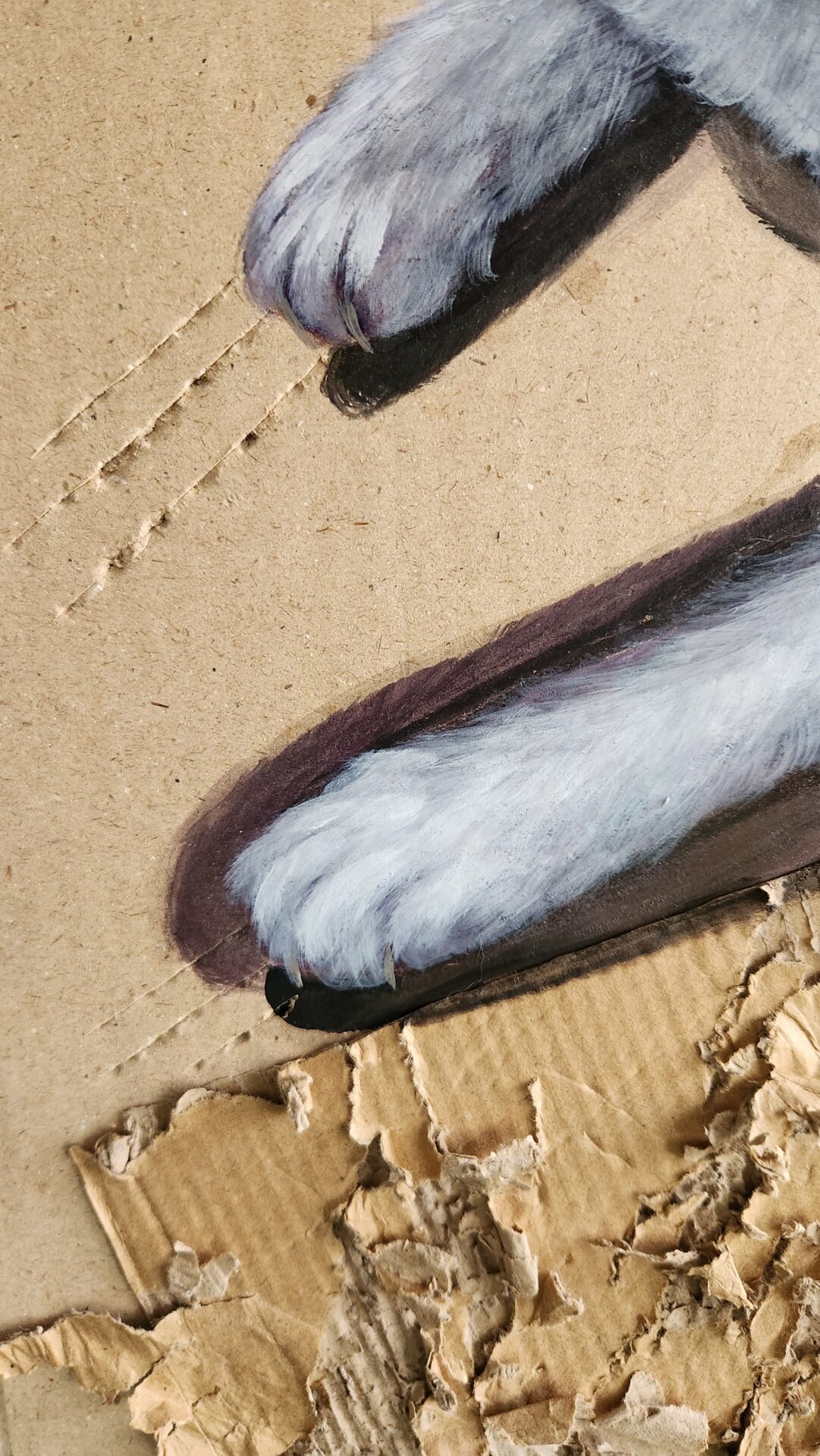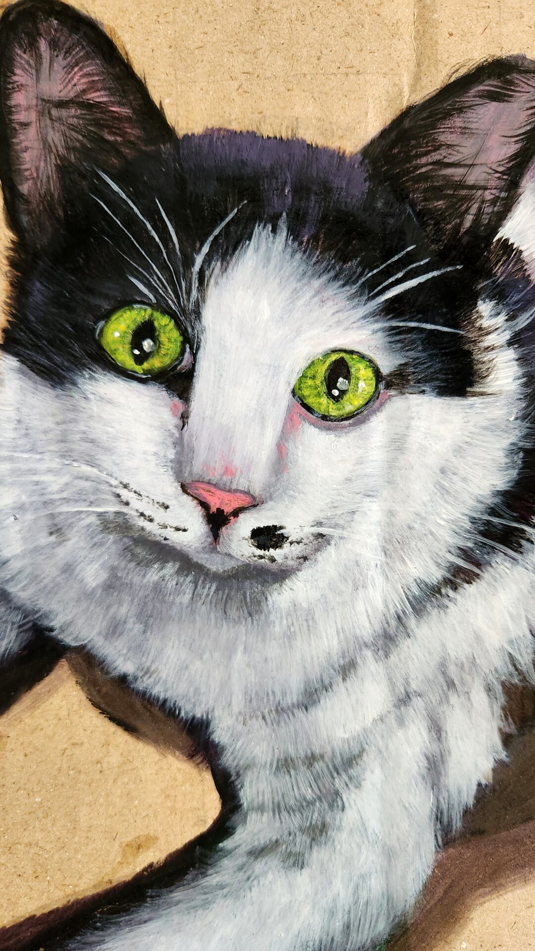This painting holds a very special place in my heart, as it is created on Oreo’s last cardboard—the one he lovingly scratched and made his own. Oreo was my mischievous, playful cat, and scratching on cardboard was one of his favorite pastimes. He would spend hours tearing, clawing, and leaving his unique marks, turning an ordinary piece of cardboard into something truly his. This painting is not just an artwork; it’s a memory, a tangible connection to the joy and love Oreo brought into my life.