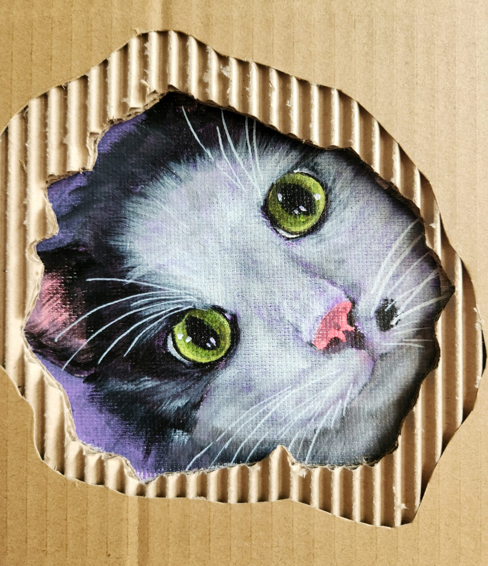 As I painted this piece, I couldn’t help but smile at the memory of Oreo, my beloved cat who brought so much joy into my life. Oreo was more than just a pet; he was my mischievous companion, my comfort on hard days, and the curious explorer of every cardboard box that entered our home. “Oreo in a Box 1” captures one of his most endearing habits—his love for carton boxes. He would tuck himself inside, leaving just enough room to peek out with those wide, curious eyes, always ready for an adventure or a playful pounce.