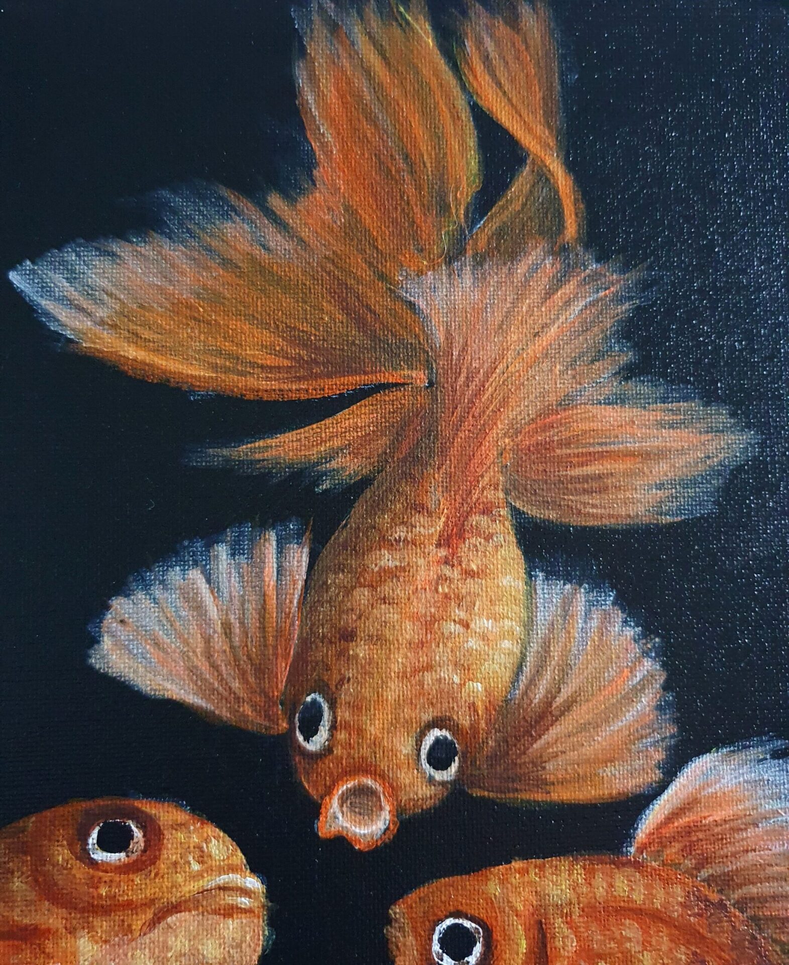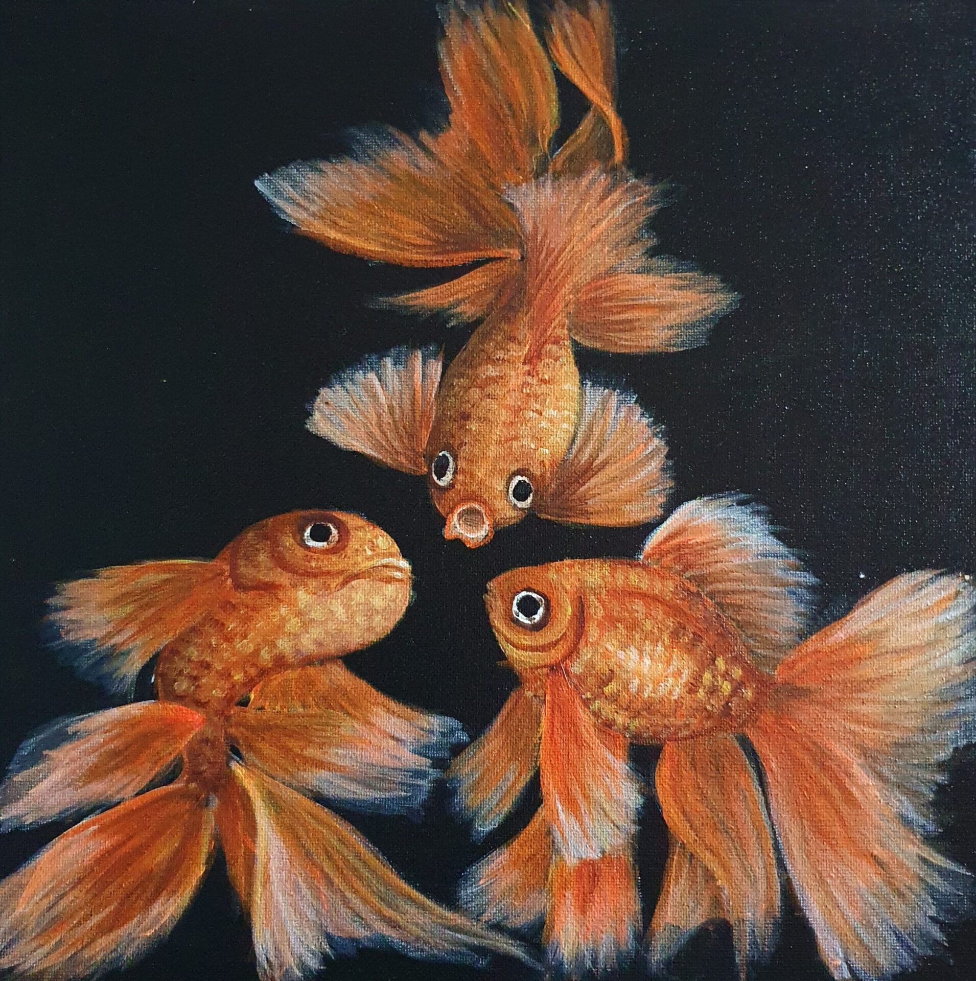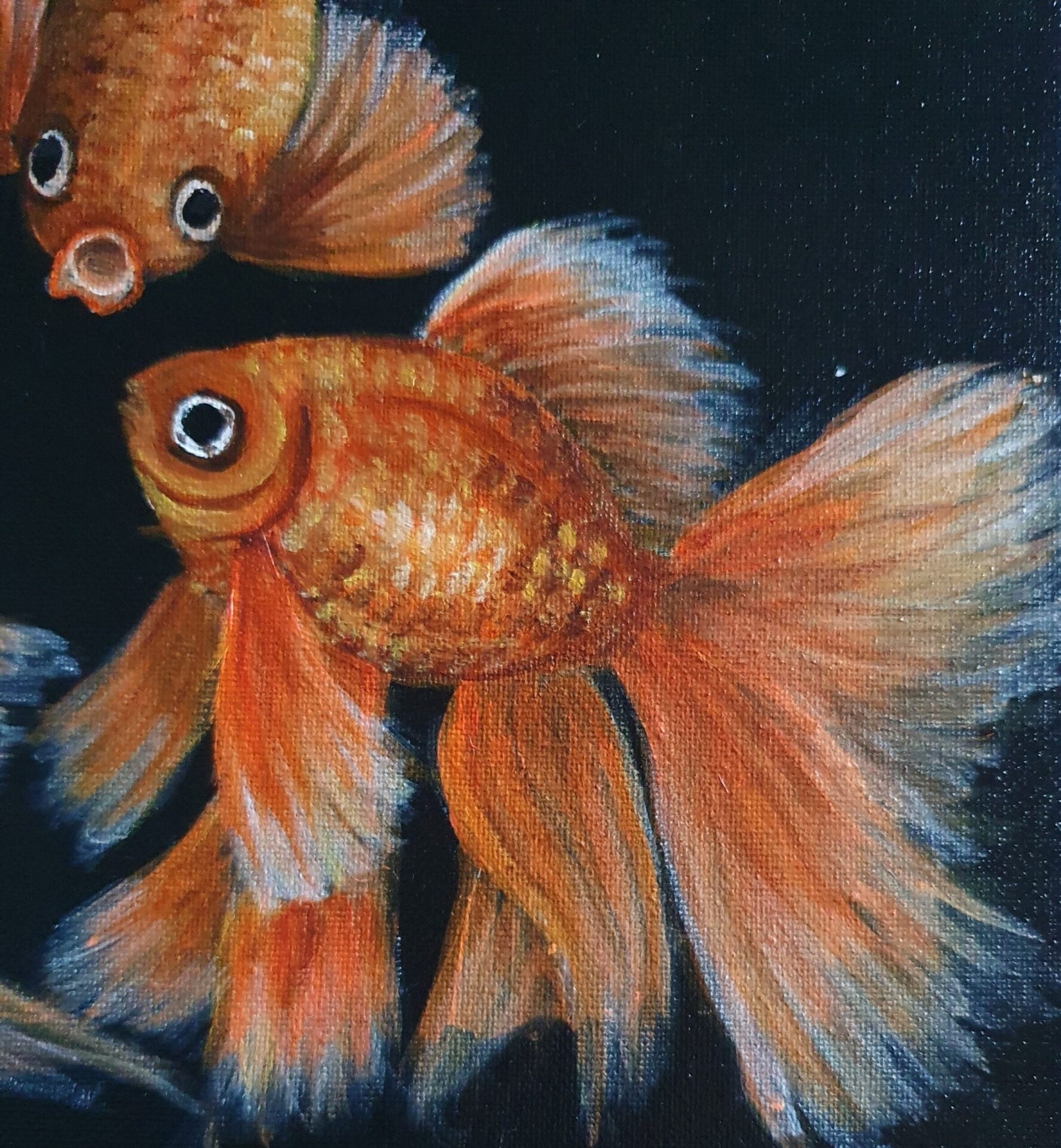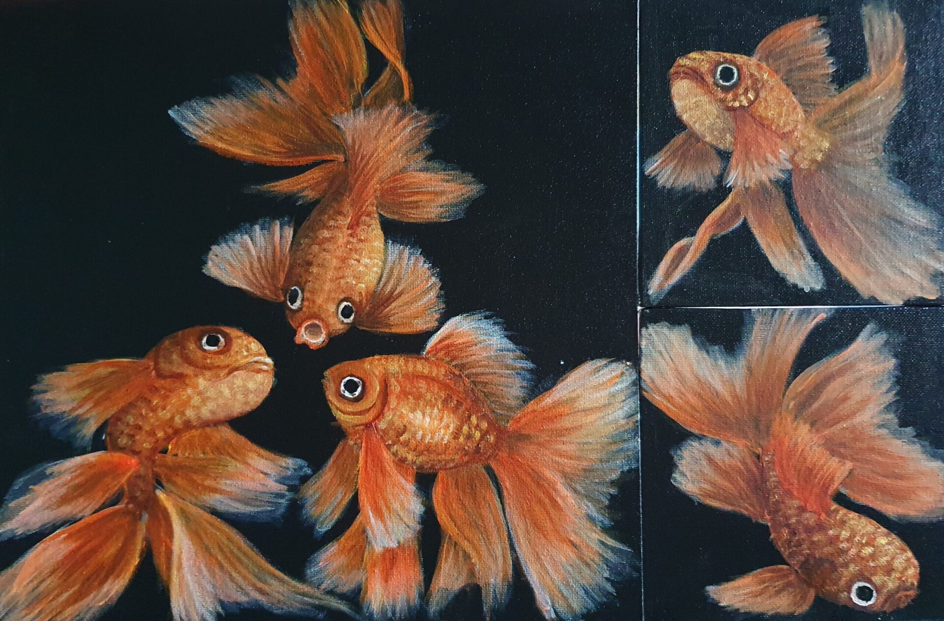 “Golden Arowanas” is a striking painting that captures the elegance and symbolism of the revered arowana fish, often associated with wealth, prosperity, and success. The artwork features golden-scaled arowanas gliding through an ethereal underwater setting, illuminated by radiant beams of light. With meticulous detailing and a rich color palette of golds, oranges, and deep aquatic blues, this piece exudes luxury and sophistication.