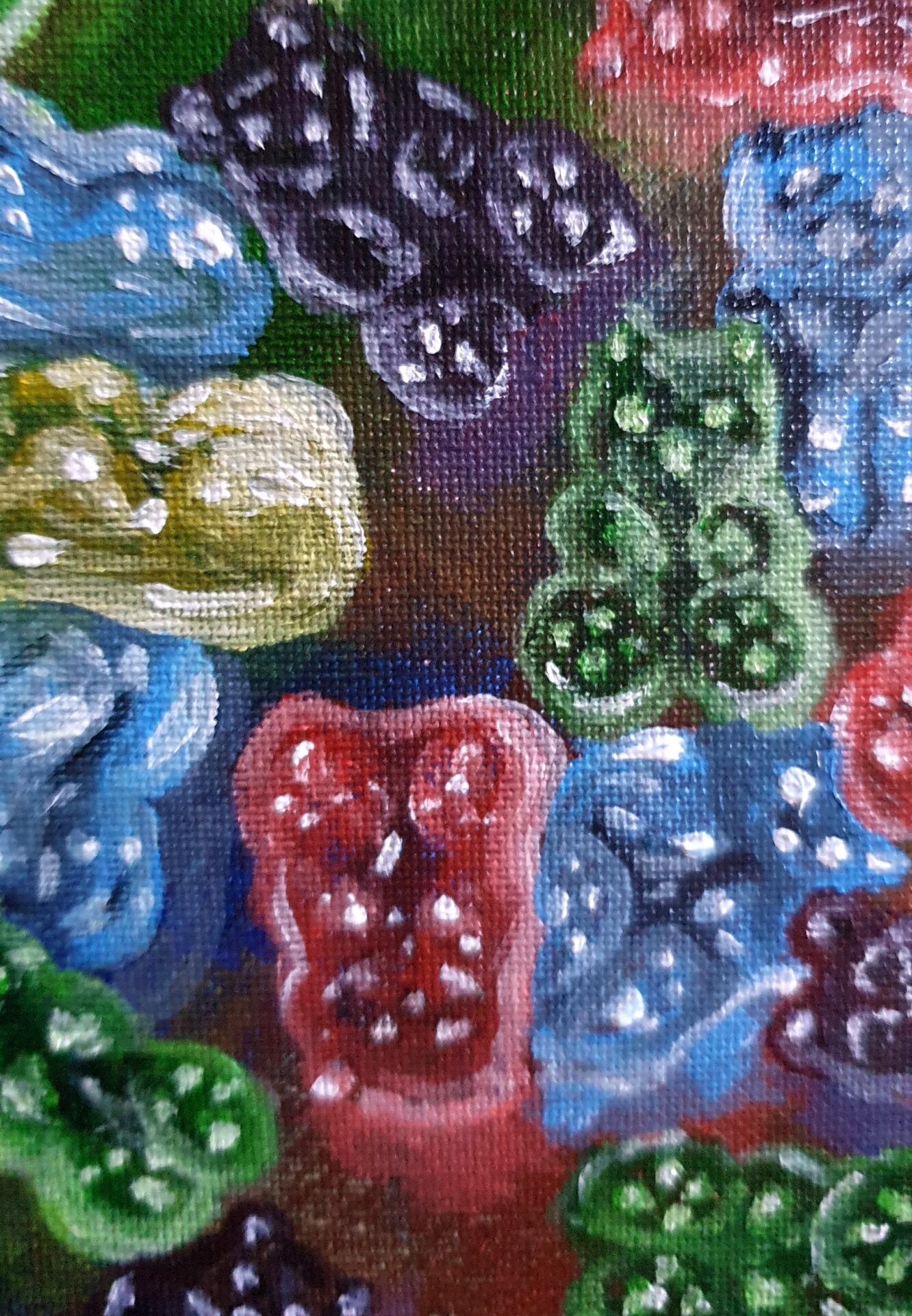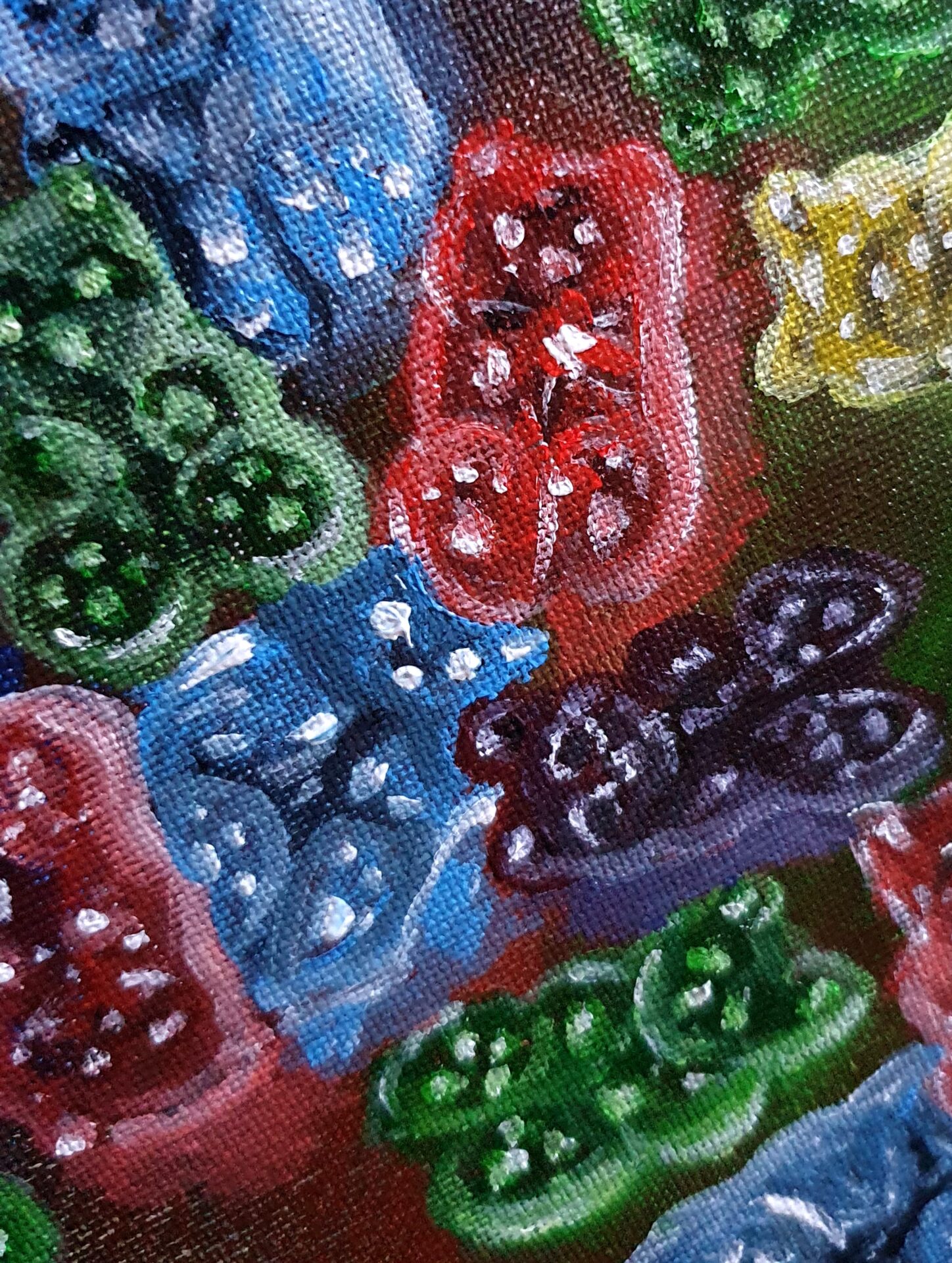 For me, this painting is about more than candy—it’s a reminder to find joy in the little things and to reconnect with the playful, carefree spirit we often leave behind. Gummy bears symbolize happiness, spontaneity, and the ability to savor life’s sweet moments.