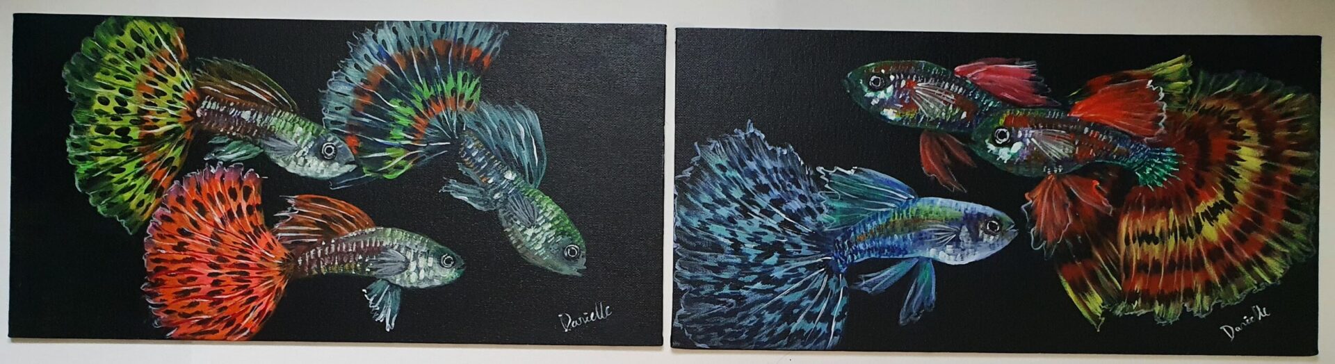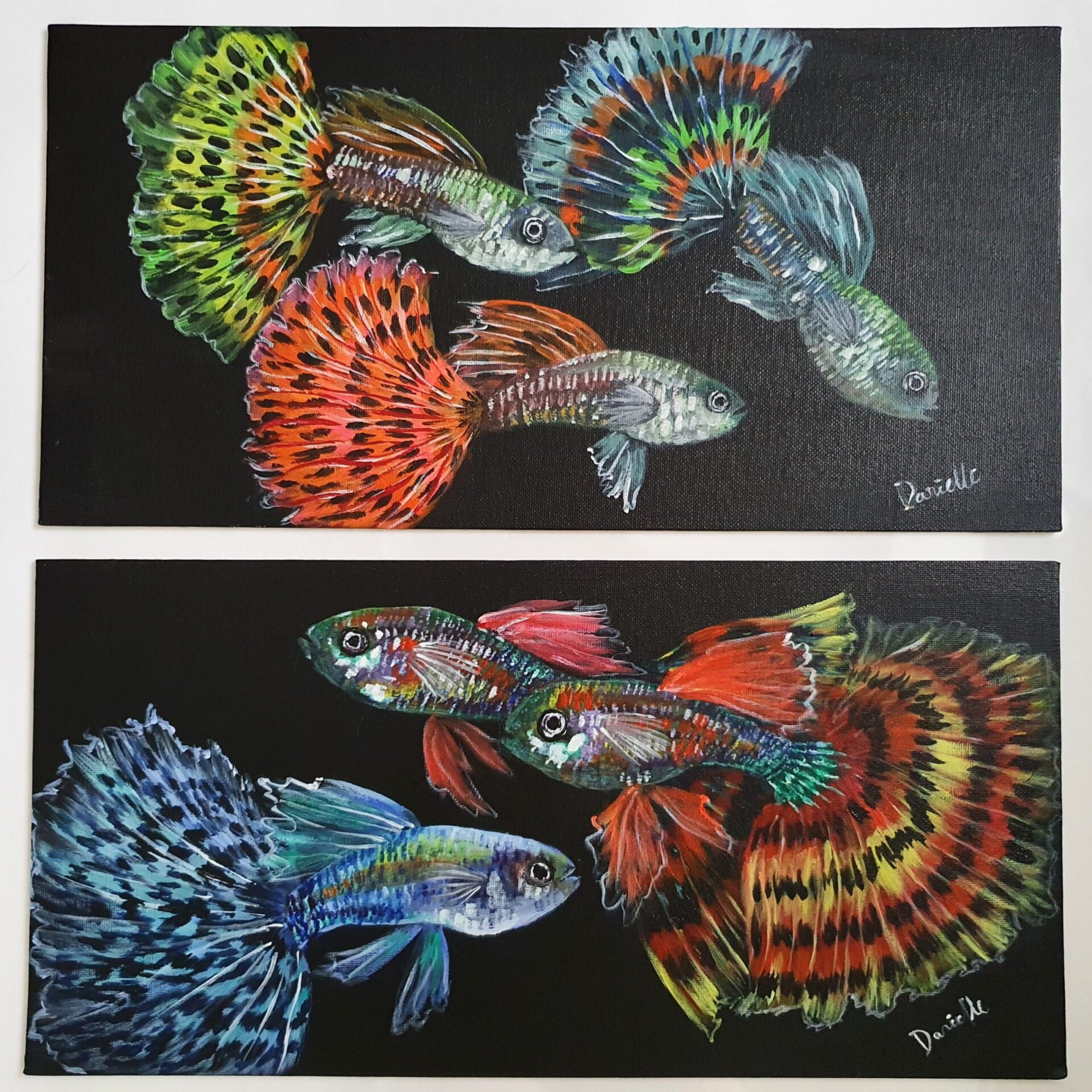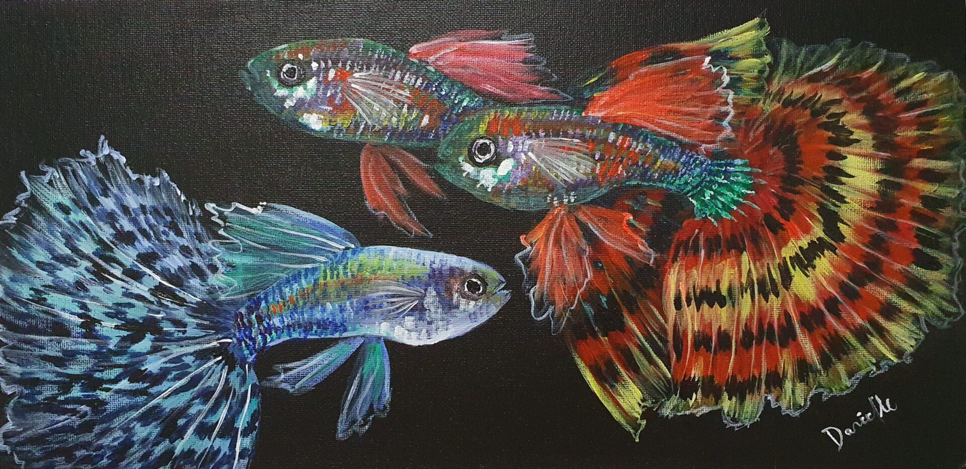 Danielle Art Original Acrylic and Oil Paintings Original Acrylic Painting – Guppies 2: A vibrant acrylic painting of colorful guppy fish swimming against a black background.