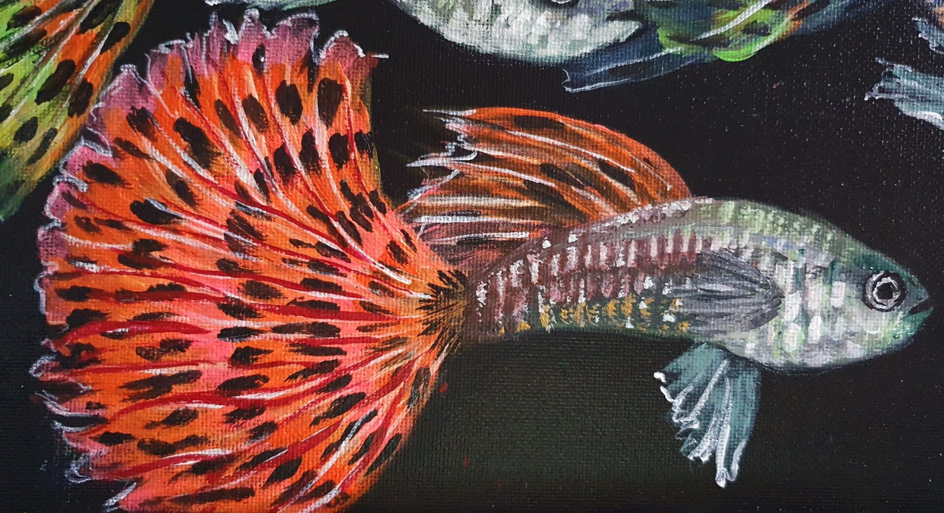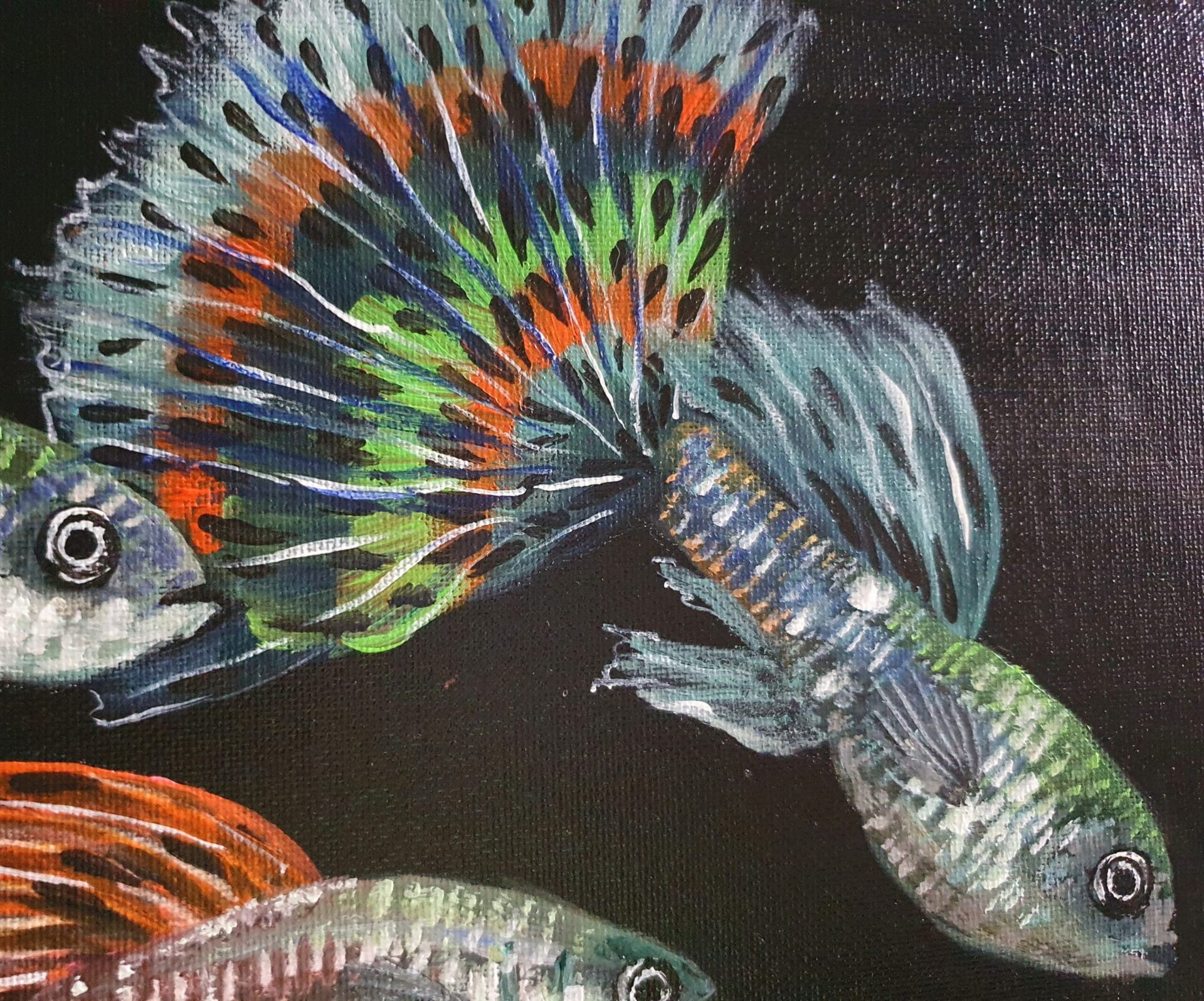 This vibrant guppy painting showcases the beauty of marine life with shimmering colors, intricate patterns, and flowing fins. Set against a dark background, it captures the elegance and movement of these fish, making it perfect for adding energy and tranquility to any space.