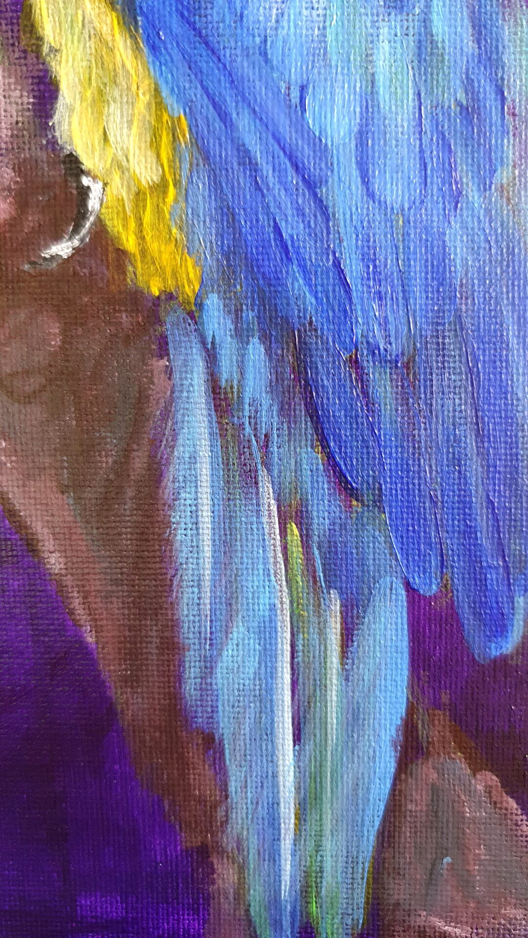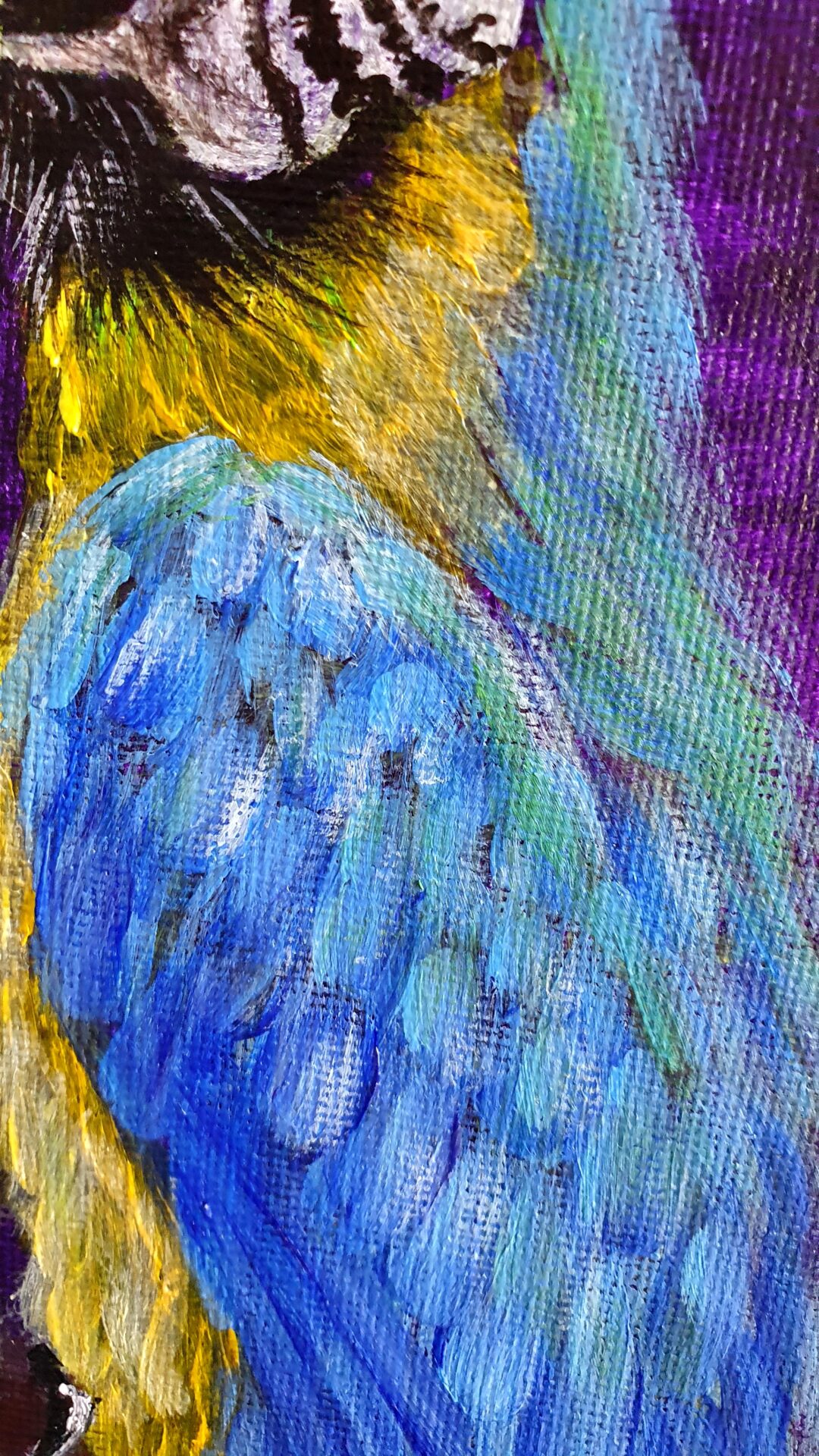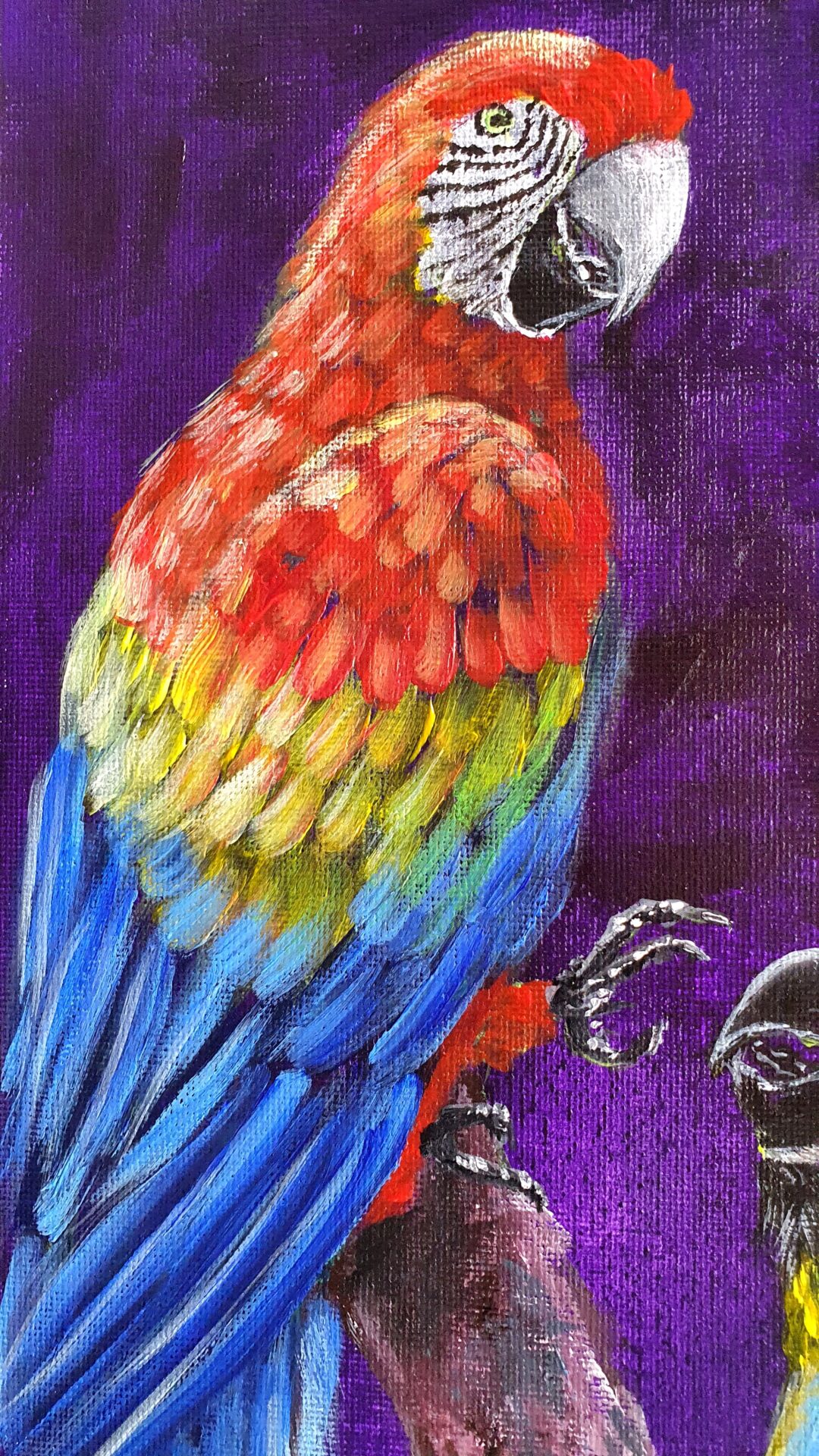 As I worked on this piece, I focused on the intricate details of their feathers, using bold brushstrokes to bring out the texture and vividness of their plumage. The deep purple background creates a dramatic contrast, enhancing their radiant colors and drawing attention to their expressive postures.