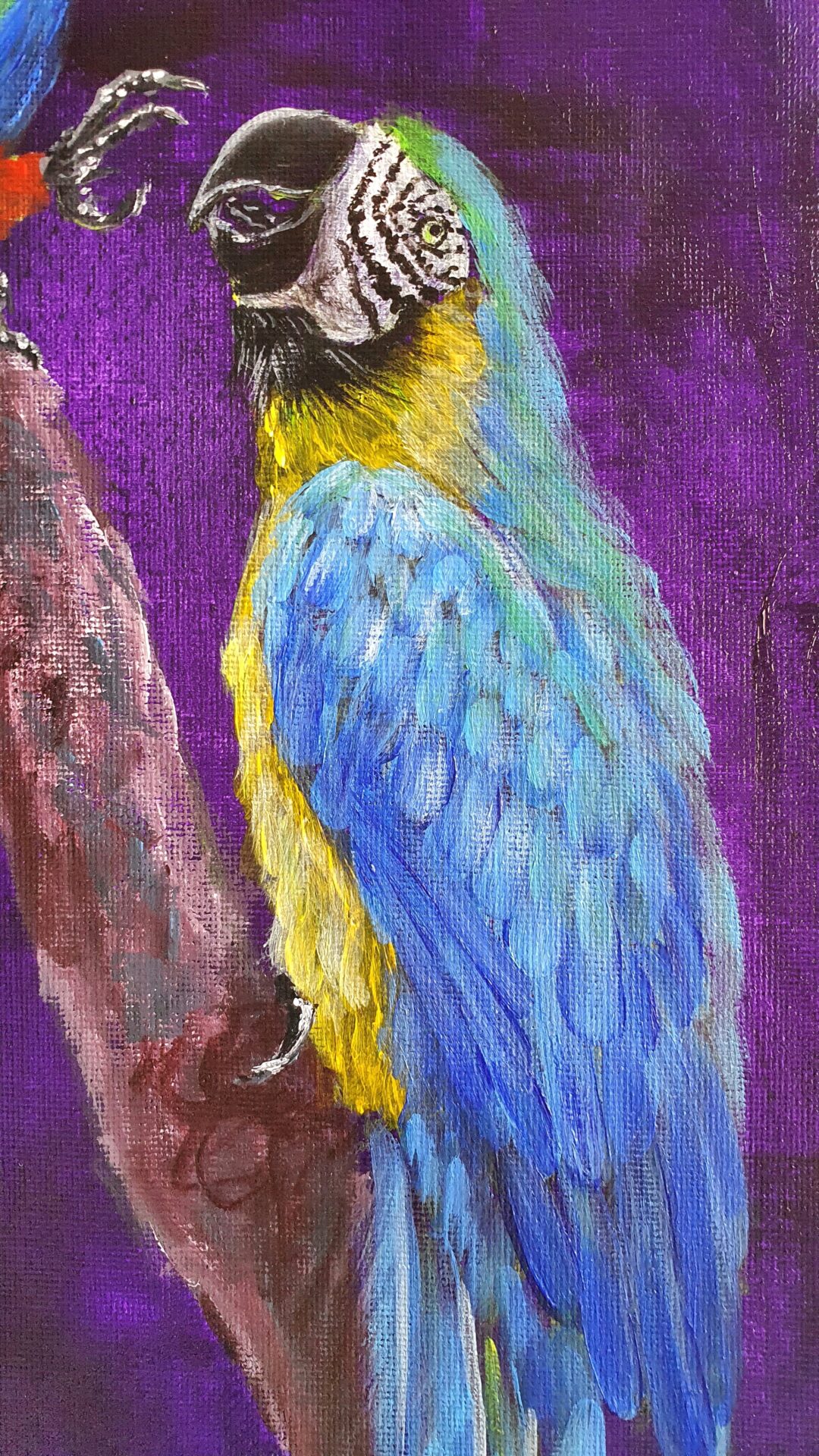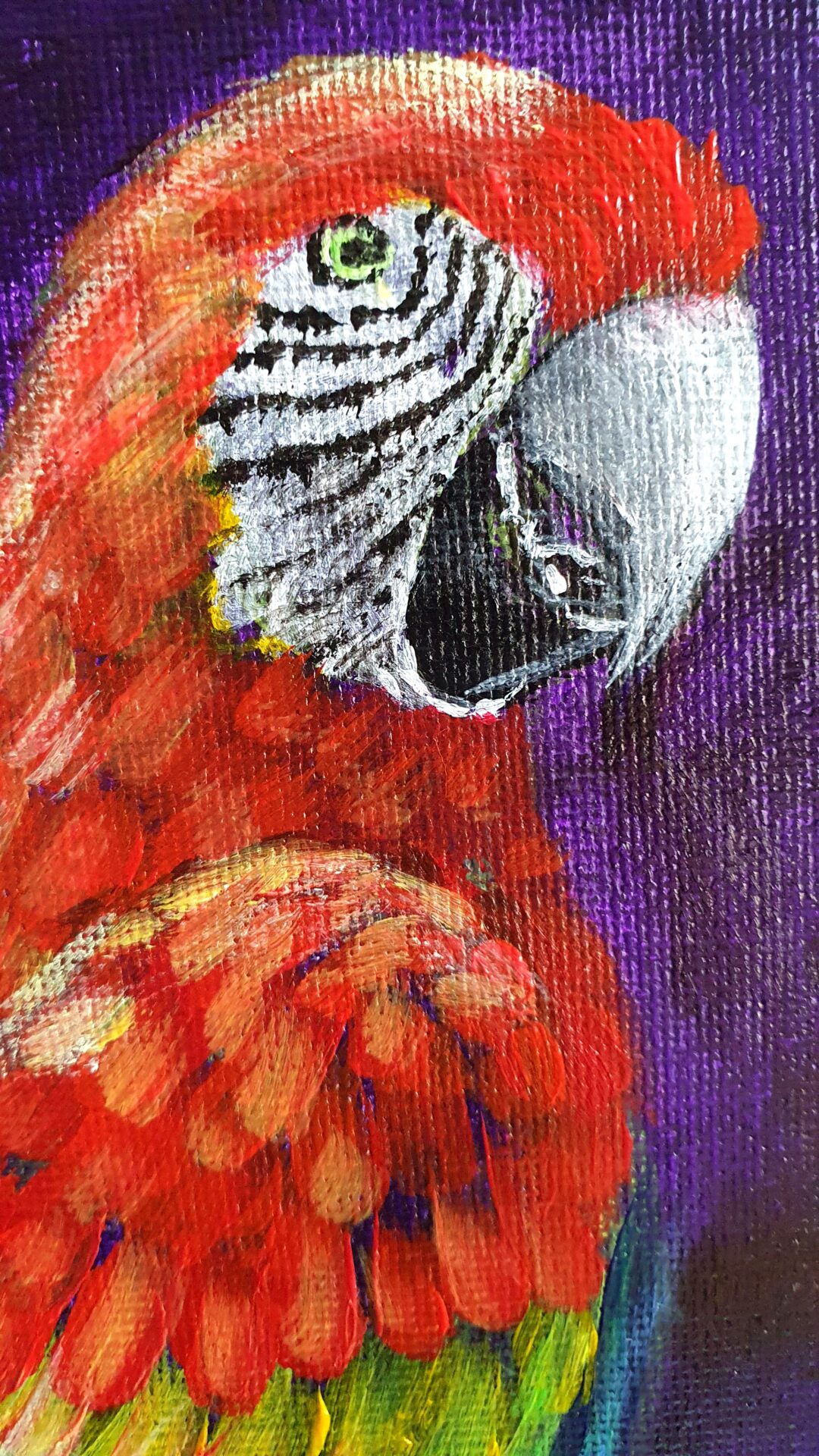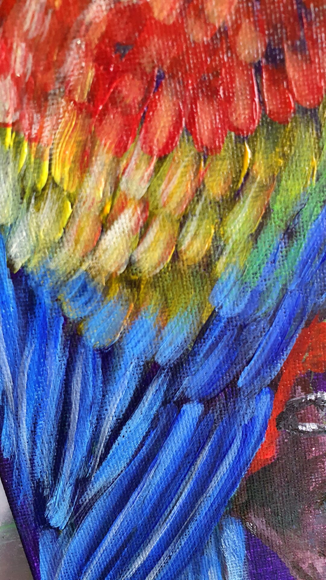 As I worked on this piece, I focused on the intricate details of their feathers, using bold brushstrokes to bring out the texture and vividness of their plumage. The deep purple background creates a dramatic contrast, enhancing their radiant colors and drawing attention to their expressive postures.