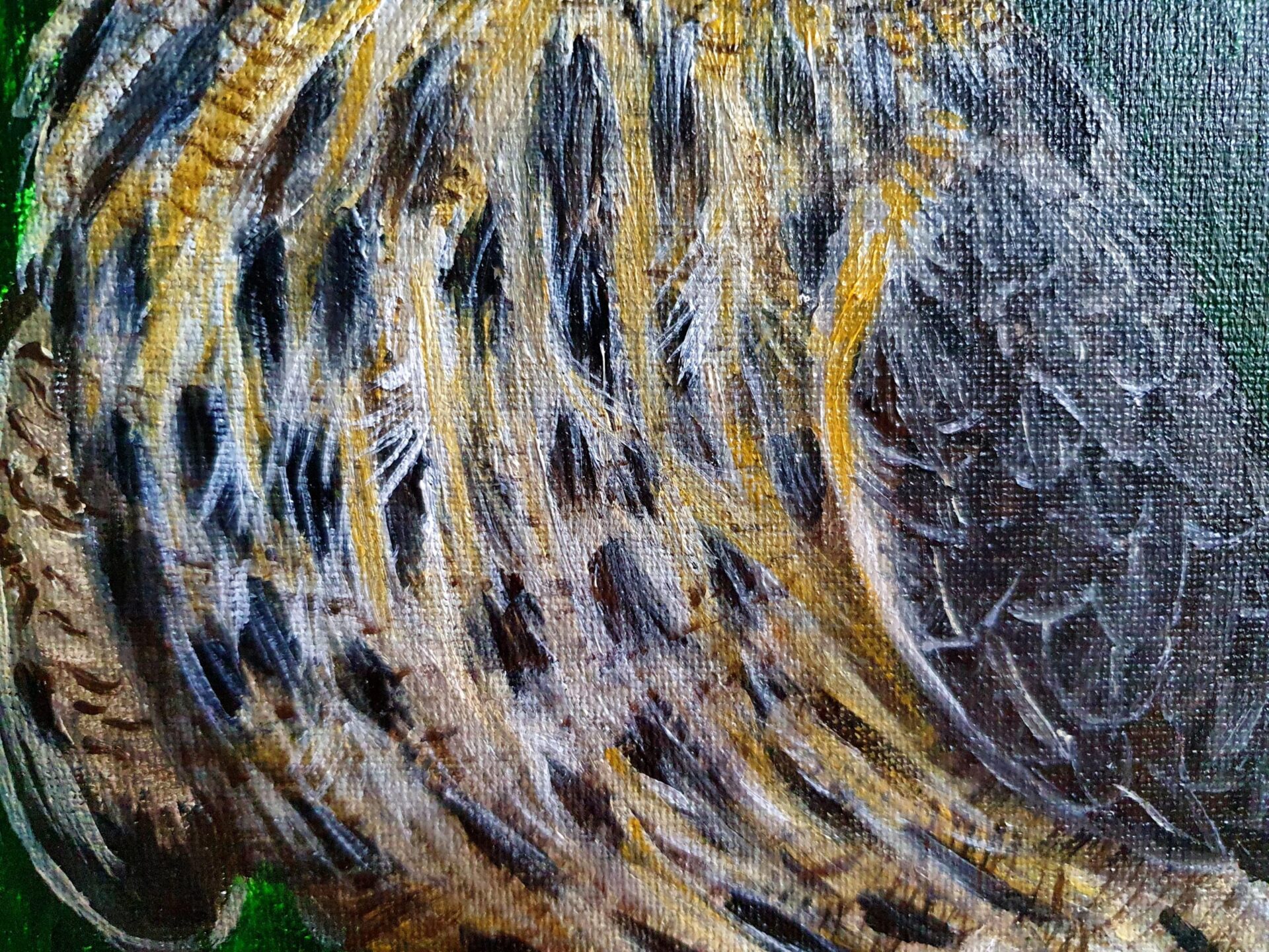 As I worked on this piece, I was inspired by the owl’s reputation as a symbol of insight, intuition, and protection. Each brushstroke was carefully placed to highlight its textured feathers and the contrast between light and shadow, giving the painting a lifelike and dynamic quality. The vibrant green background adds depth, symbolizing the connection between the owl and the natural world it watches over.
