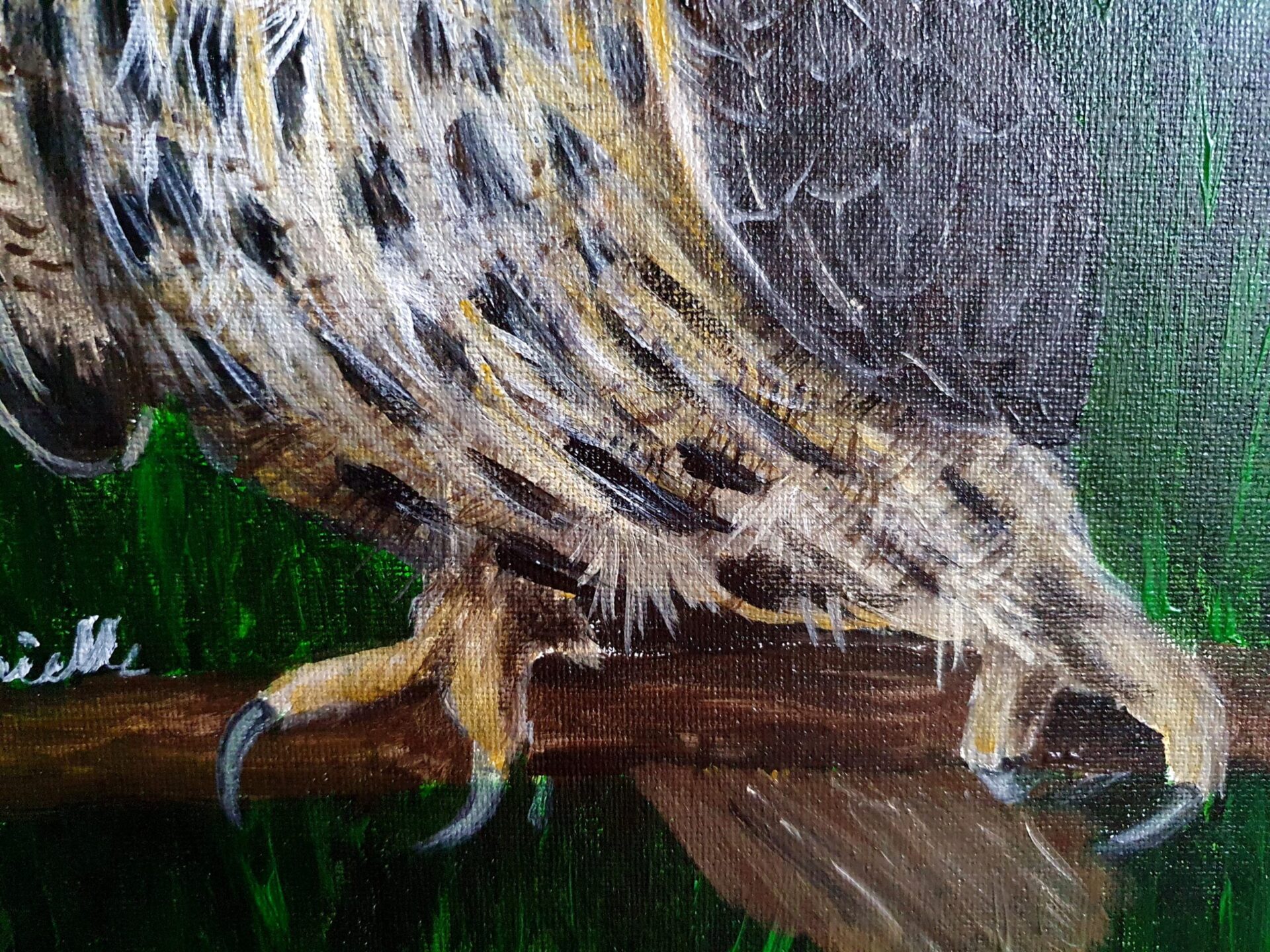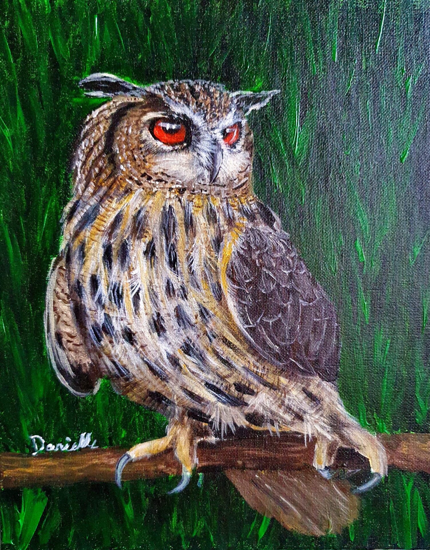 Danielle Art Original Acrylic and Oil Paintings Original Acrylic Painting – Owl 2: Detailed painting of an owl perched on a branch with green background.