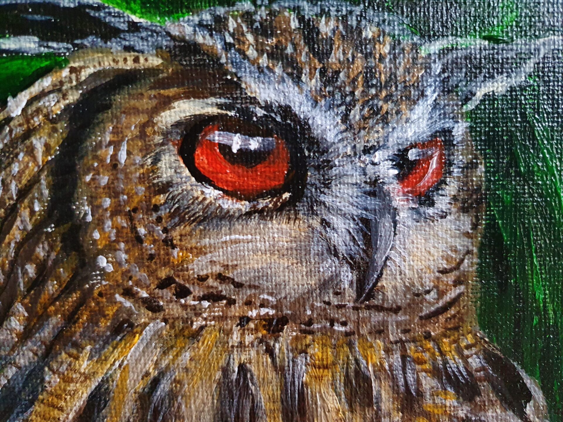 When I painted this owl, I aimed to capture its captivating presence and the wisdom it symbolizes. The piercing red eyes, detailed feathers, and the owl’s poised stance exude an air of mystery and intelligence. Perched on a branch against a rich green background, this owl commands attention, reminding us of nature’s beauty and the significance of stillness and observation.