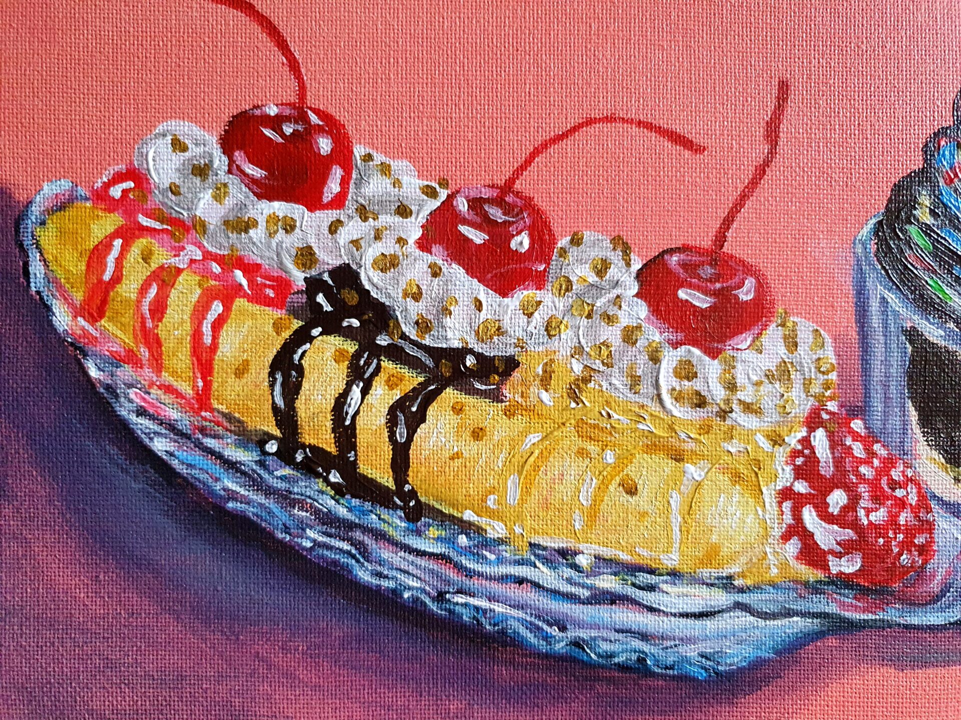 In A Sweet Sundae Escape, I wanted to capture the indulgent joy of a classic banana split sundae paired with a swirl of colorful ice cream. This painting is a celebration of life’s simple pleasures, where every detail is designed to evoke happiness, nostalgia, and a sense of carefree indulgence.