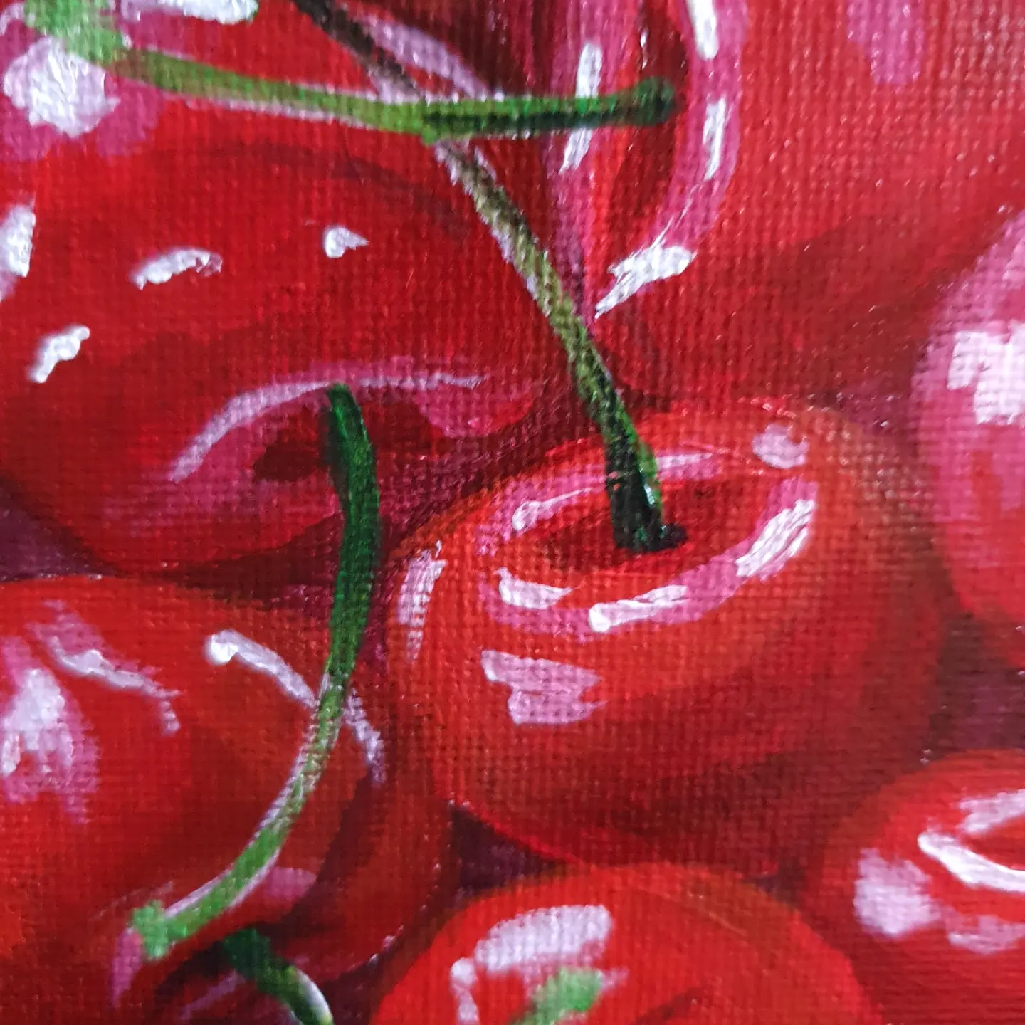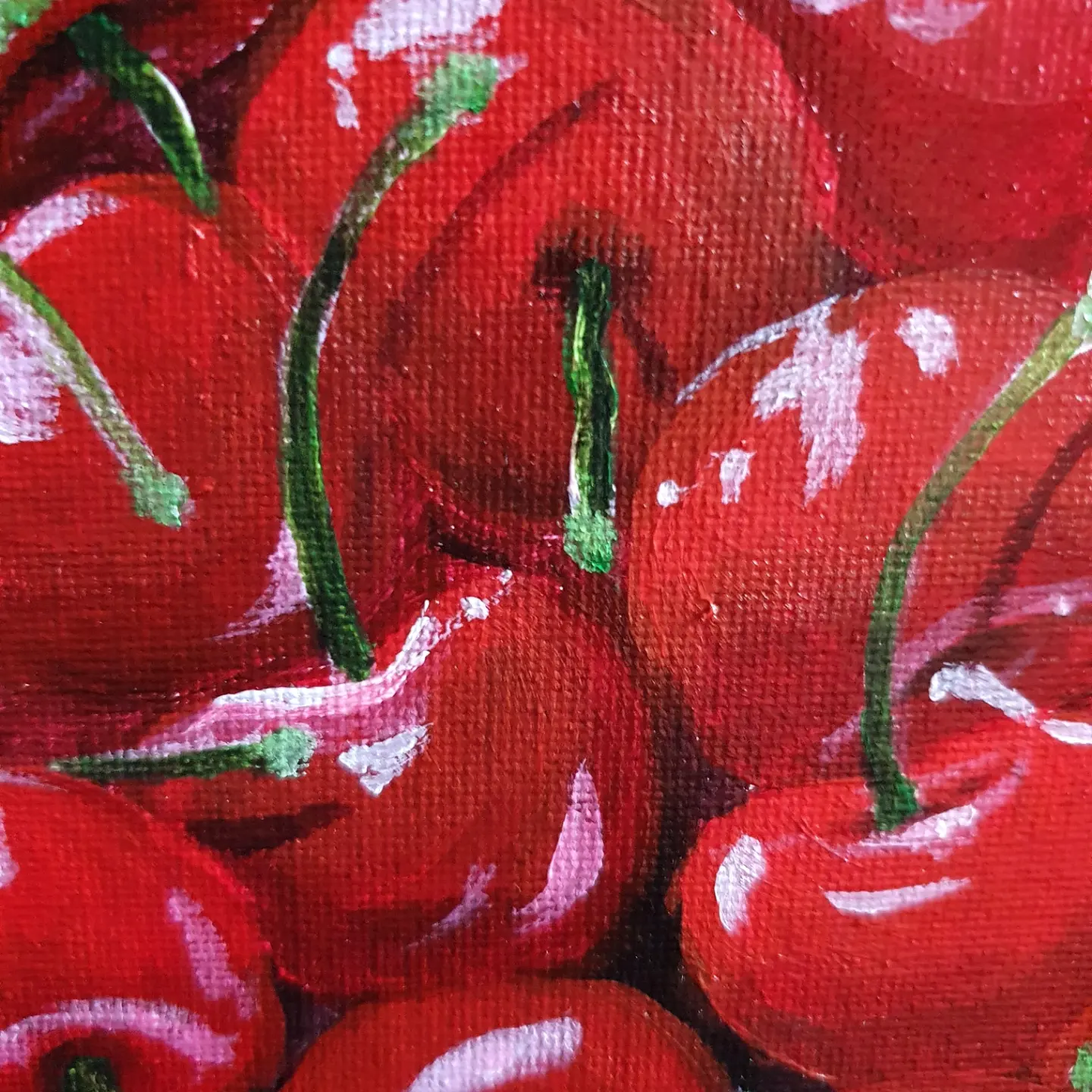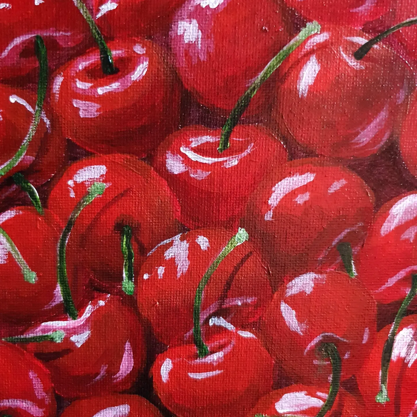 When I painted this vibrant composition of cherries, I wanted to evoke a sense of abundance, joy, and the irresistible allure of nature’s sweetest treasures. Each cherry, with its glossy red surface and delicate green stem, tells a story of summer warmth, simple pleasures, and shared moments of indulgence.
