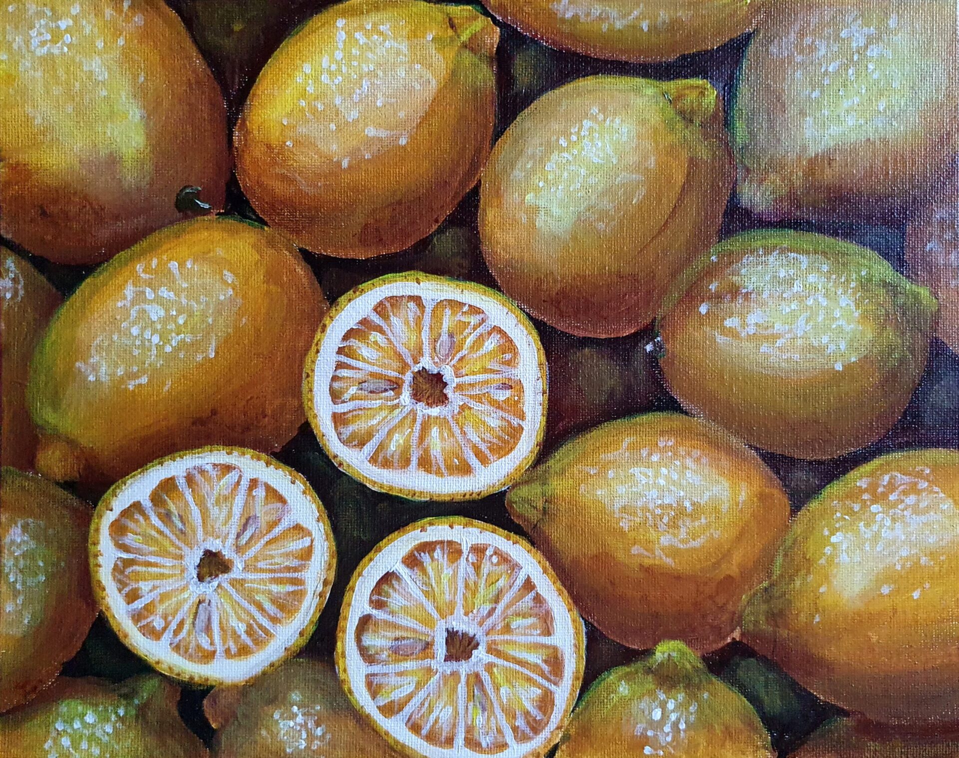 When I painted this vibrant composition of lemons, I wanted to capture the zest and energy they bring into our lives—not just as a fruit, but as a symbol of brightness, renewal, and positivity. The rich yellows and the subtle texture of their skins are a tribute to the sunlit warmth of citrus groves, while the halved lemons reveal their intricate patterns, embodying nature’s perfect design.
