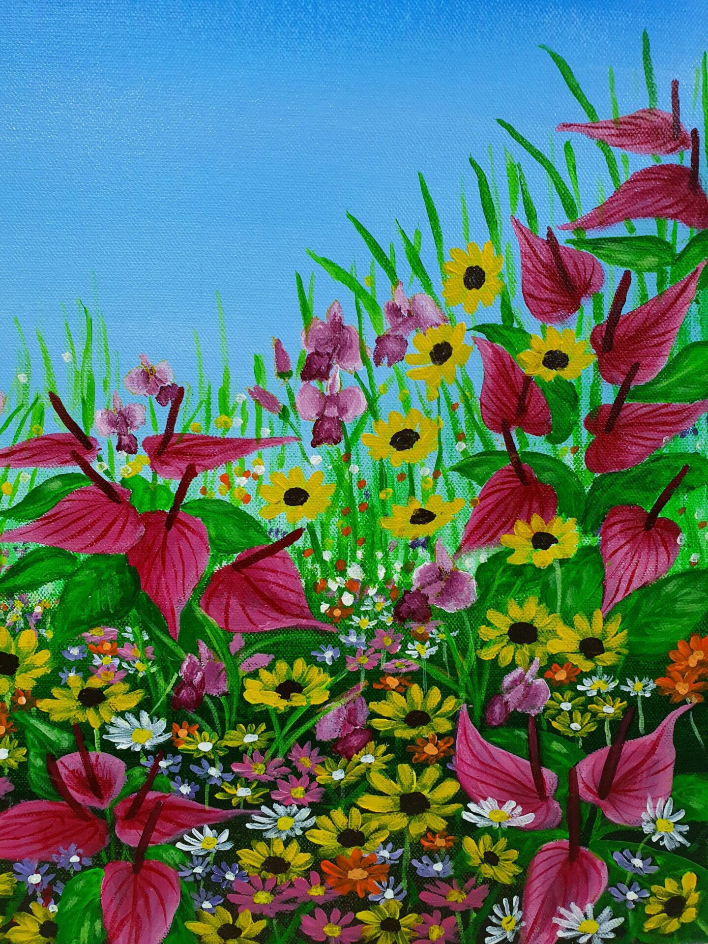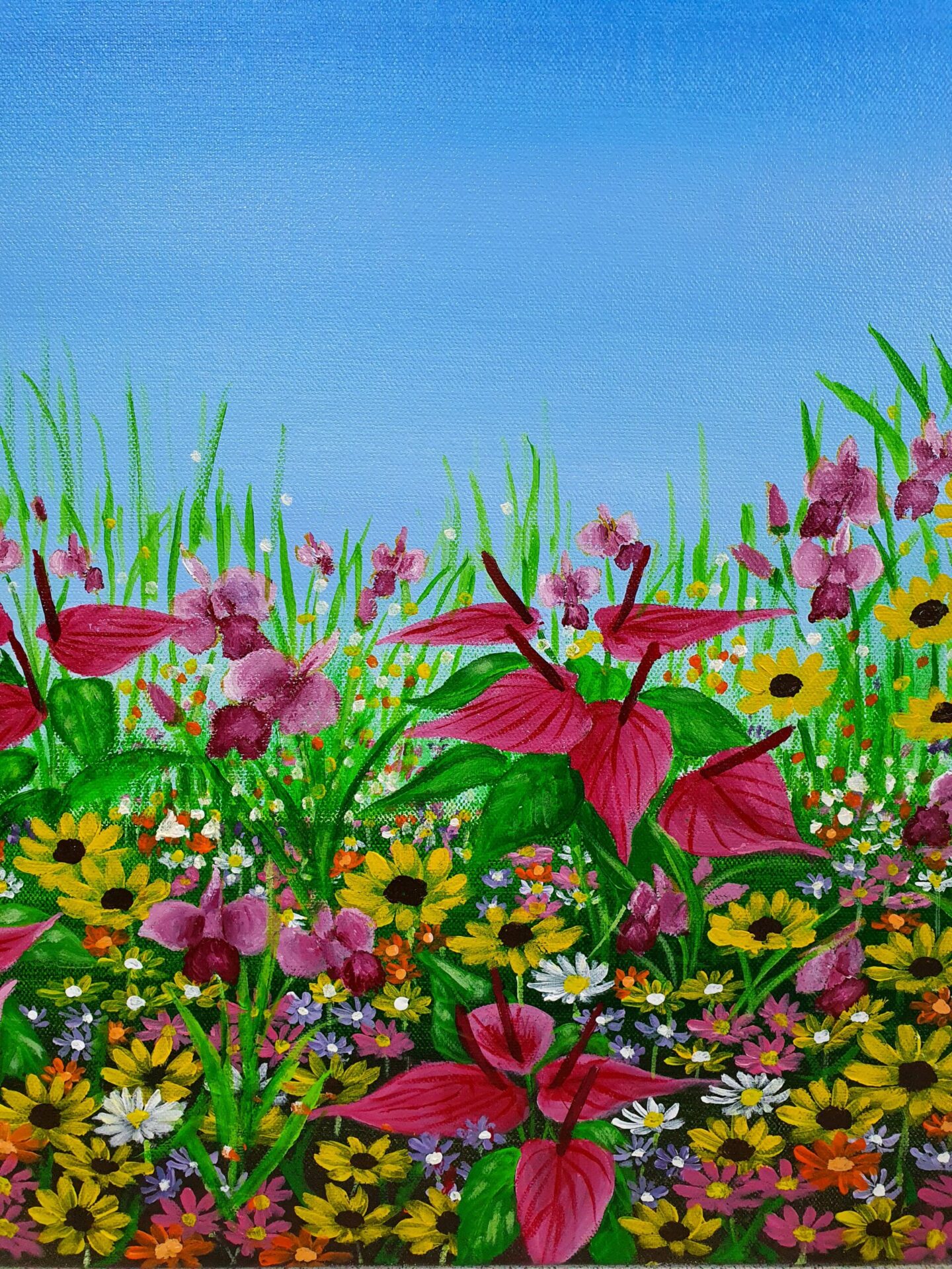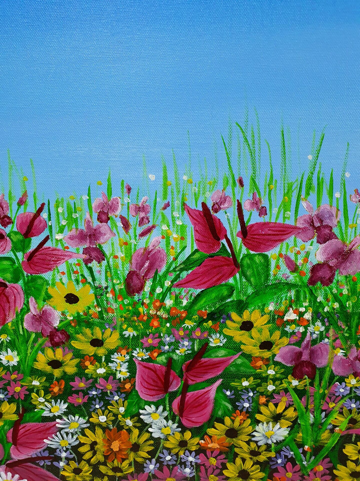 When I painted this vibrant wildflower meadow, I wanted to capture the boundless joy and serenity of nature in full bloom. The colorful blossoms, with their reds, yellows, and whites, dance across the canvas, creating a harmonious blend of life and energy. The lush greenery and crisp blue sky provide a tranquil backdrop, evoking a sense of freedom and connection to the outdoors.