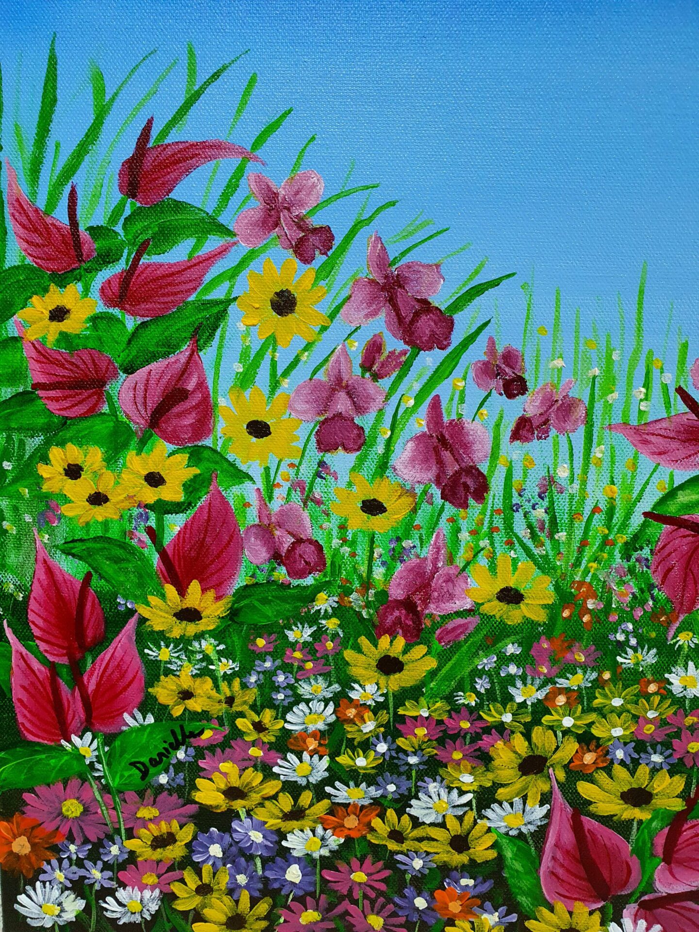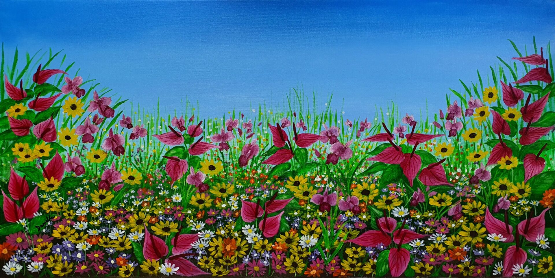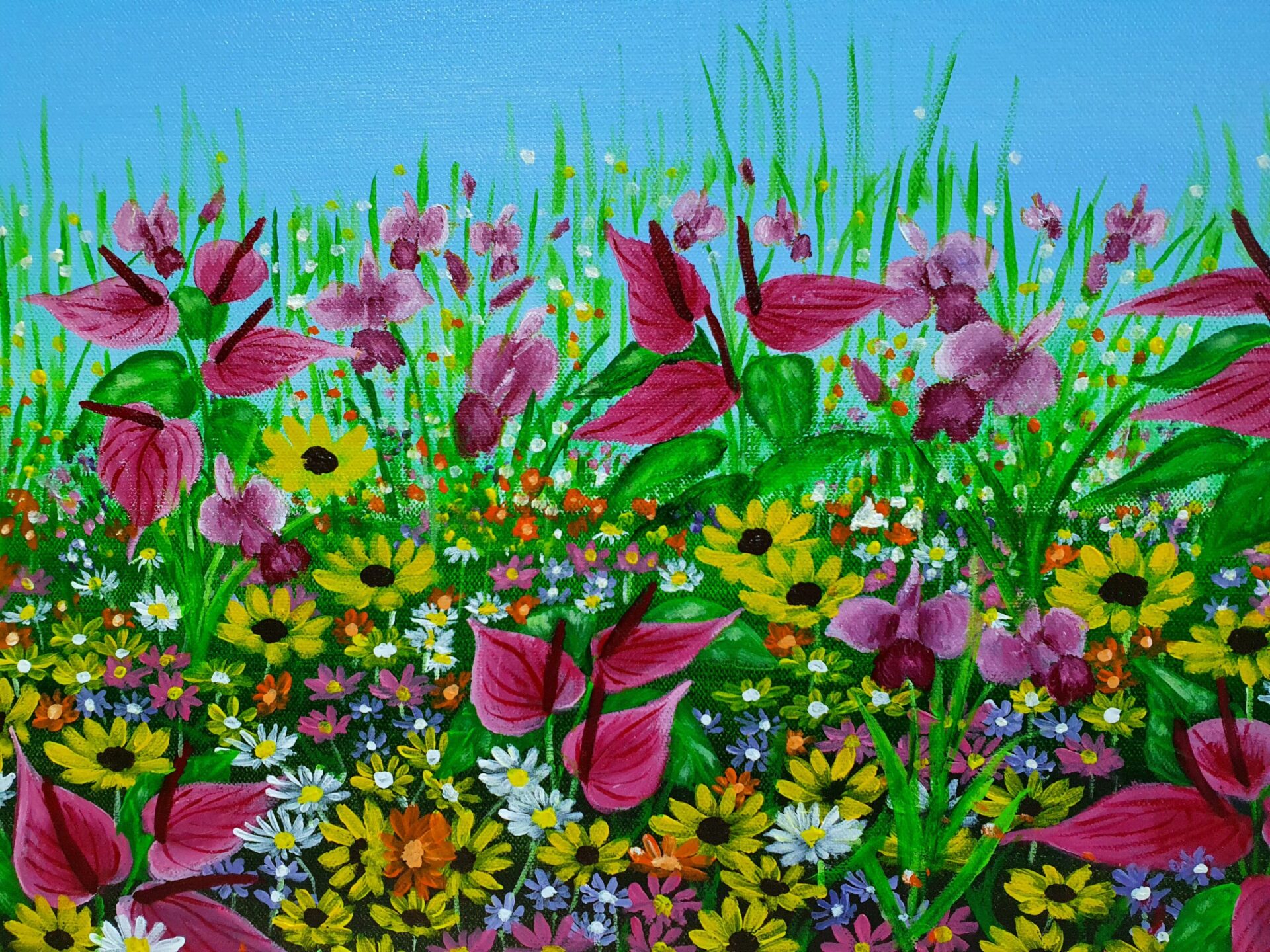 When I painted this vibrant wildflower meadow, I wanted to capture the boundless joy and serenity of nature in full bloom. The colorful blossoms, with their reds, yellows, and whites, dance across the canvas, creating a harmonious blend of life and energy. The lush greenery and crisp blue sky provide a tranquil backdrop, evoking a sense of freedom and connection to the outdoors.