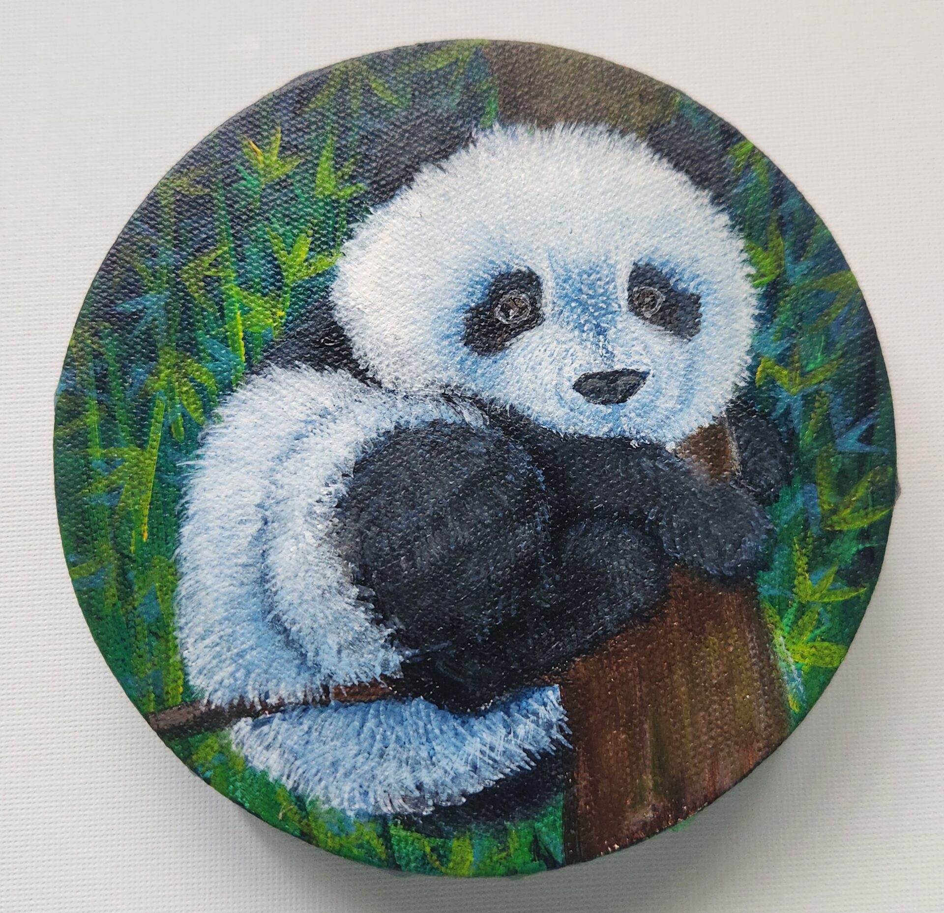 “Forest Cuddles” is inspired by the pandas I watched clinging to tree trunks like soft, sleepy babies. This piece captures a tender moment, the panda nestled comfortably against the bark, surrounded by cool bamboo leaves. I painted this with an emphasis on texture: the velvety fur, the curved paws, and the sturdy trunk that holds it. It speaks to safety, comfort, and the healing energy of nature.