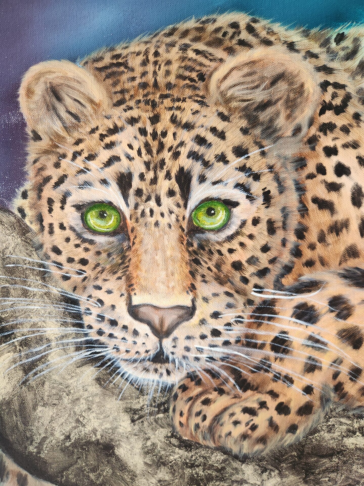 For me, this painting symbolizes resilience and vigilance—the ability to stay grounded yet ready for action. The leopard’s watchful expression reminds us of the power of patience and the beauty of stillness. The twilight hues in the background suggest a world of mystery and calm, enhancing the timeless allure of this majestic creature.