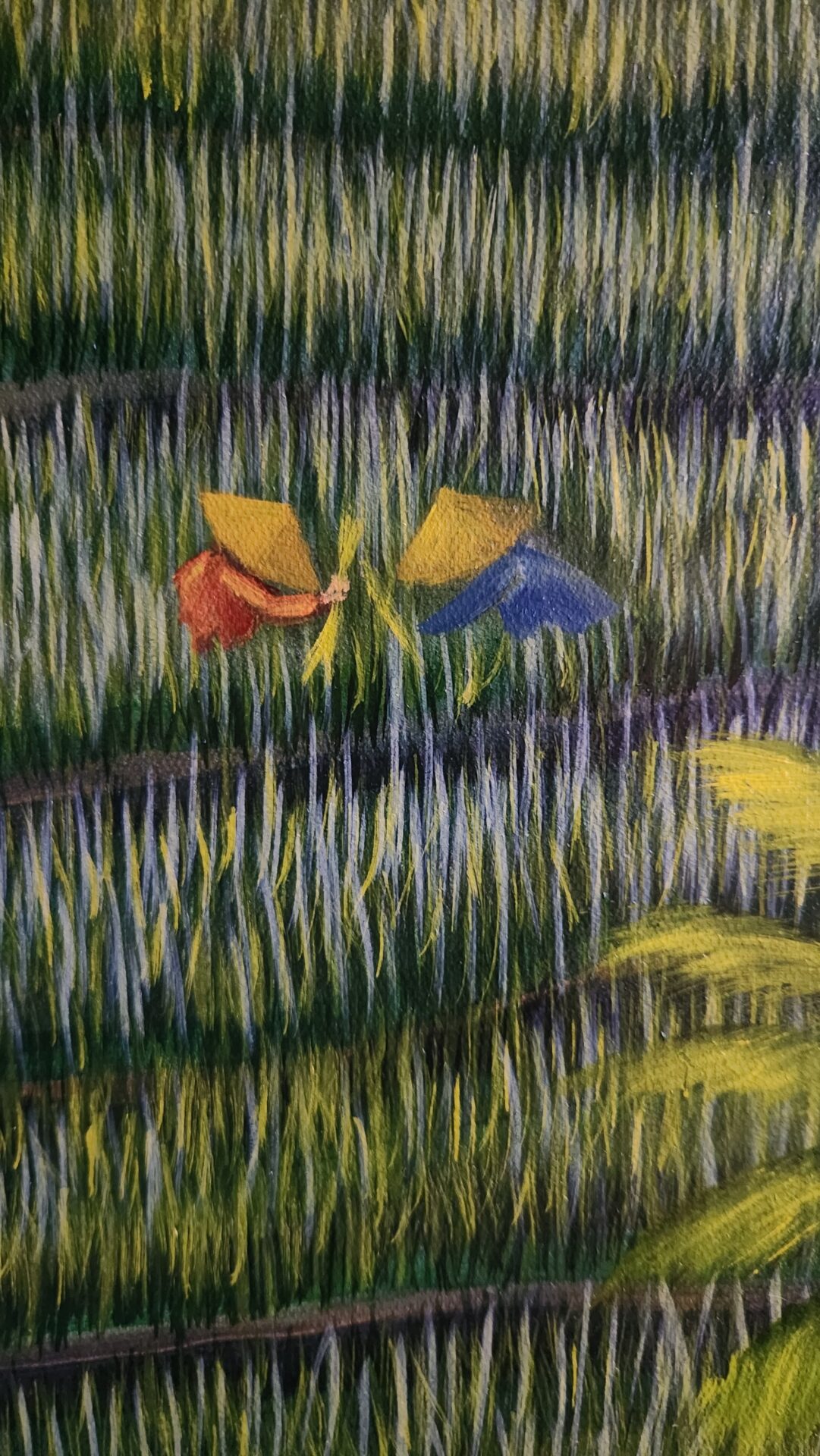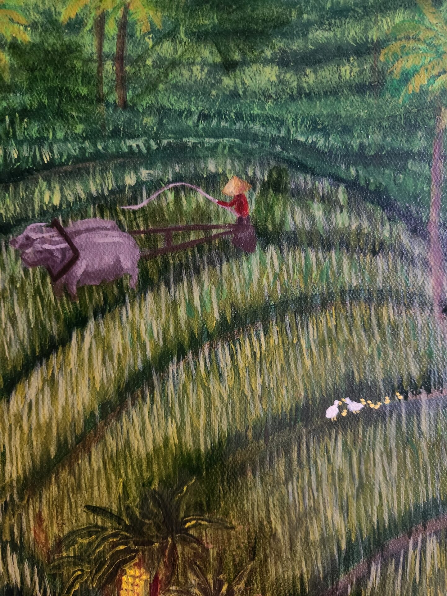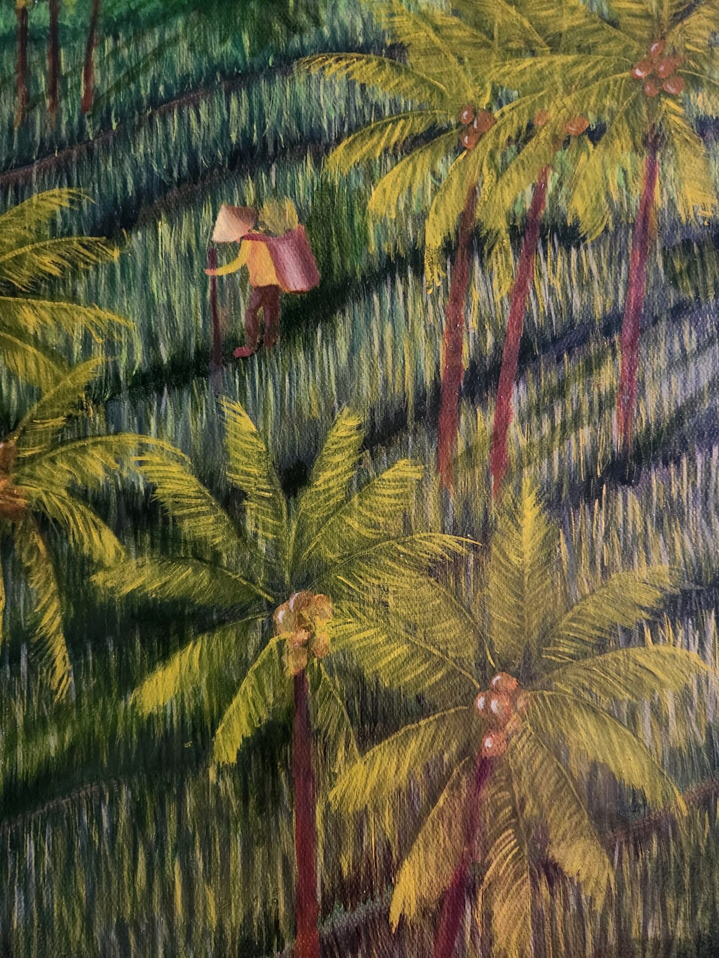 “Rice Terrace of Yogyakarta” is my homage to the harmony and vibrancy of rural life, inspired by the timeless beauty of terraced rice fields. As I painted this intricate landscape, I was struck by how the lush green paddies, swaying palm trees, and scattered figures working the land come together in a seamless rhythm, mirroring the interconnectedness of humans and nature. This painting reflects a life that is simple yet profoundly rich, where every detail tells a story of labor, tradition, and coexistence with the earth.
