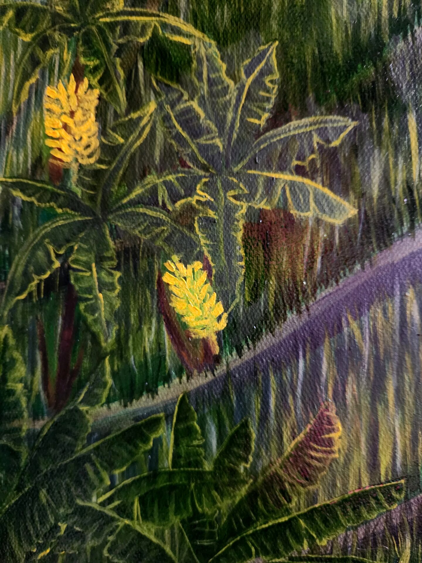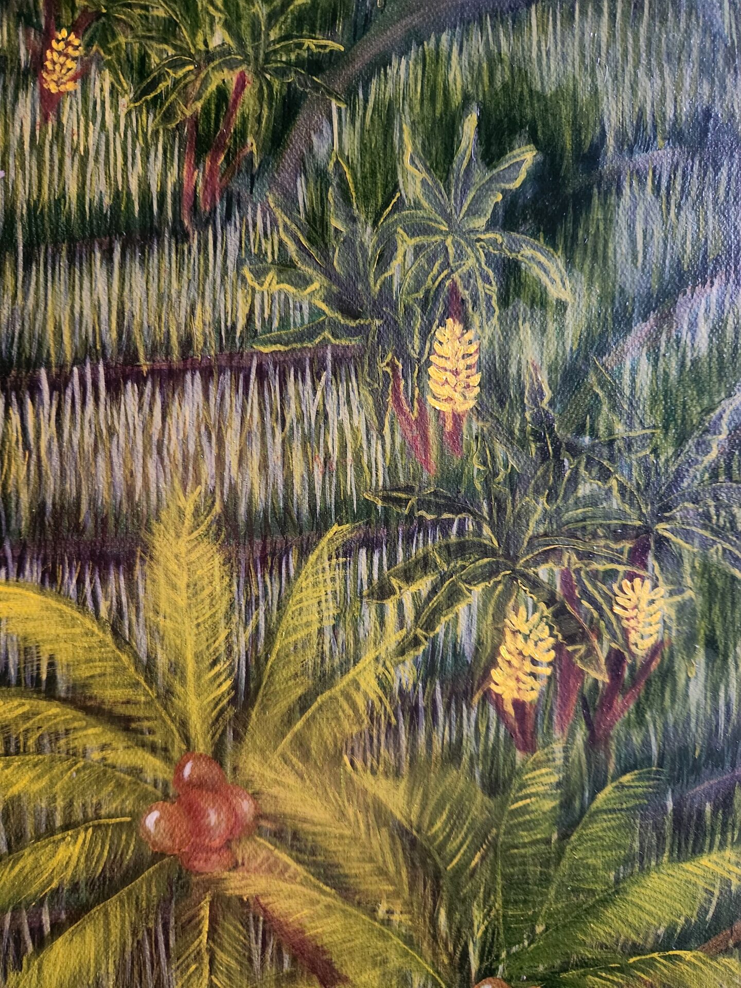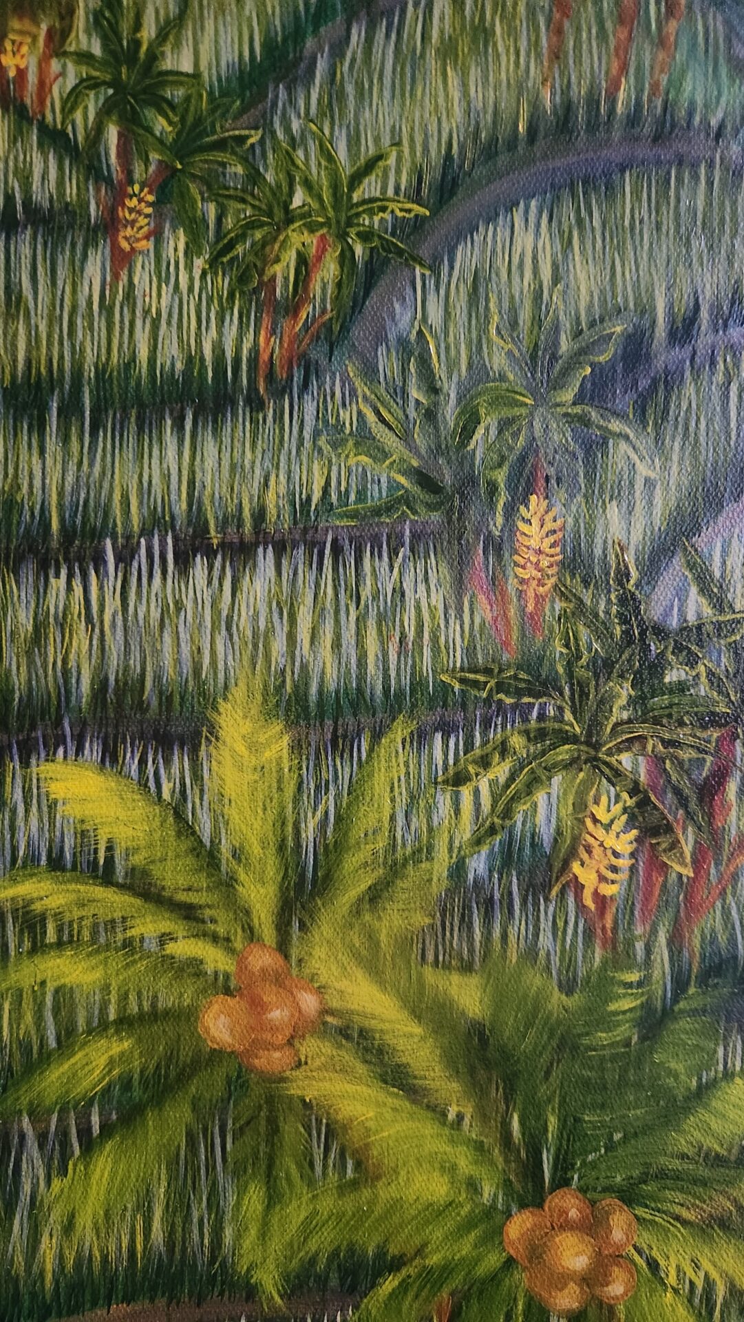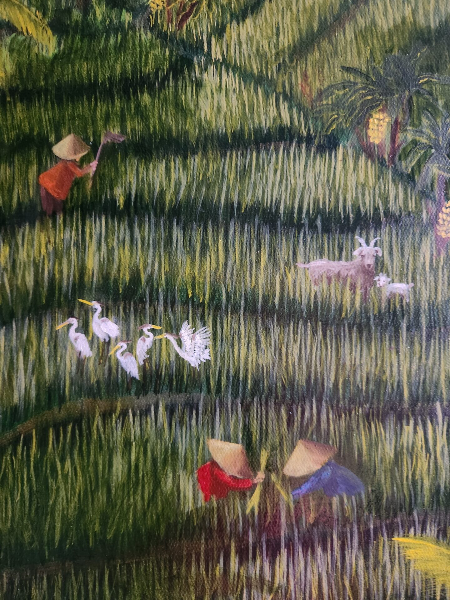 “Rice Terrace of Yogyakarta” is my homage to the harmony and vibrancy of rural life, inspired by the timeless beauty of terraced rice fields. As I painted this intricate landscape, I was struck by how the lush green paddies, swaying palm trees, and scattered figures working the land come together in a seamless rhythm, mirroring the interconnectedness of humans and nature. This painting reflects a life that is simple yet profoundly rich, where every detail tells a story of labor, tradition, and coexistence with the earth.