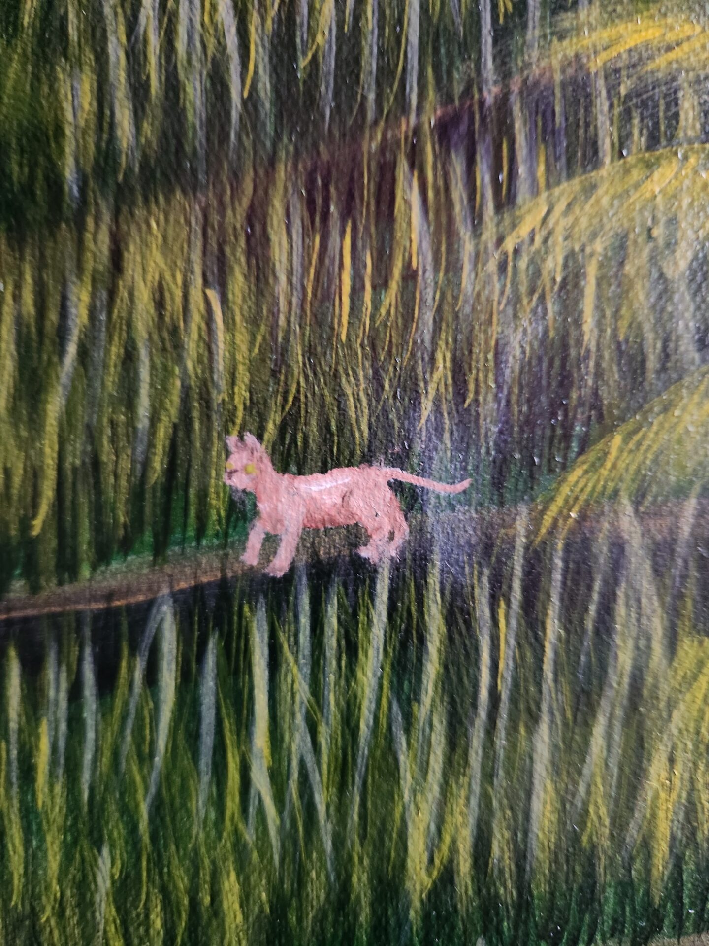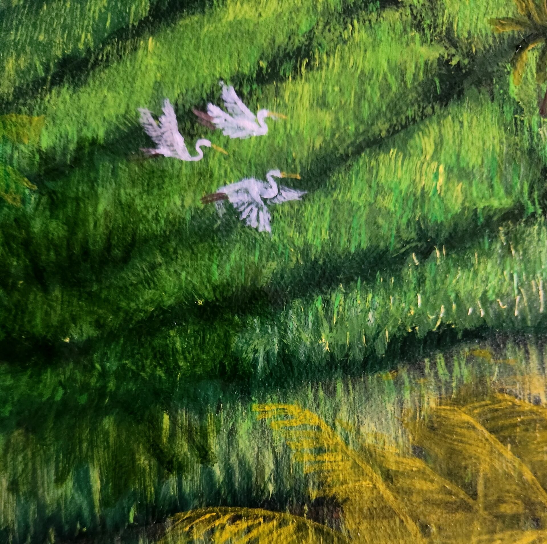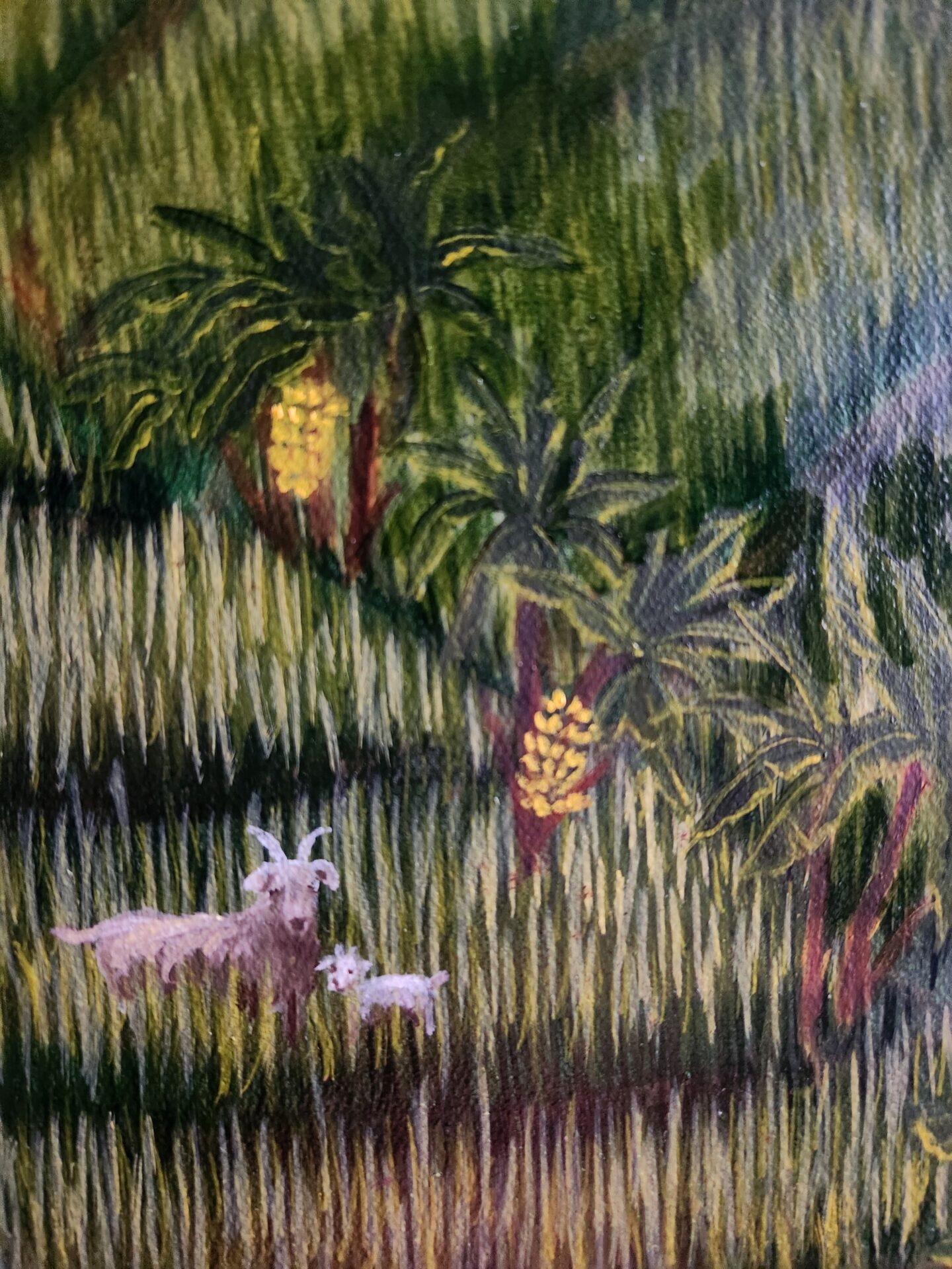 For me, this piece is a celebration of abundance and balance. The figures, animals, and lush greenery symbolize a symbiotic relationship with the land, one that respects the cycles of growth and harvest. The vivid greens and golden accents bring the fields to life, creating a sense of movement and vitality that draws the viewer into this tranquil yet dynamic world.
