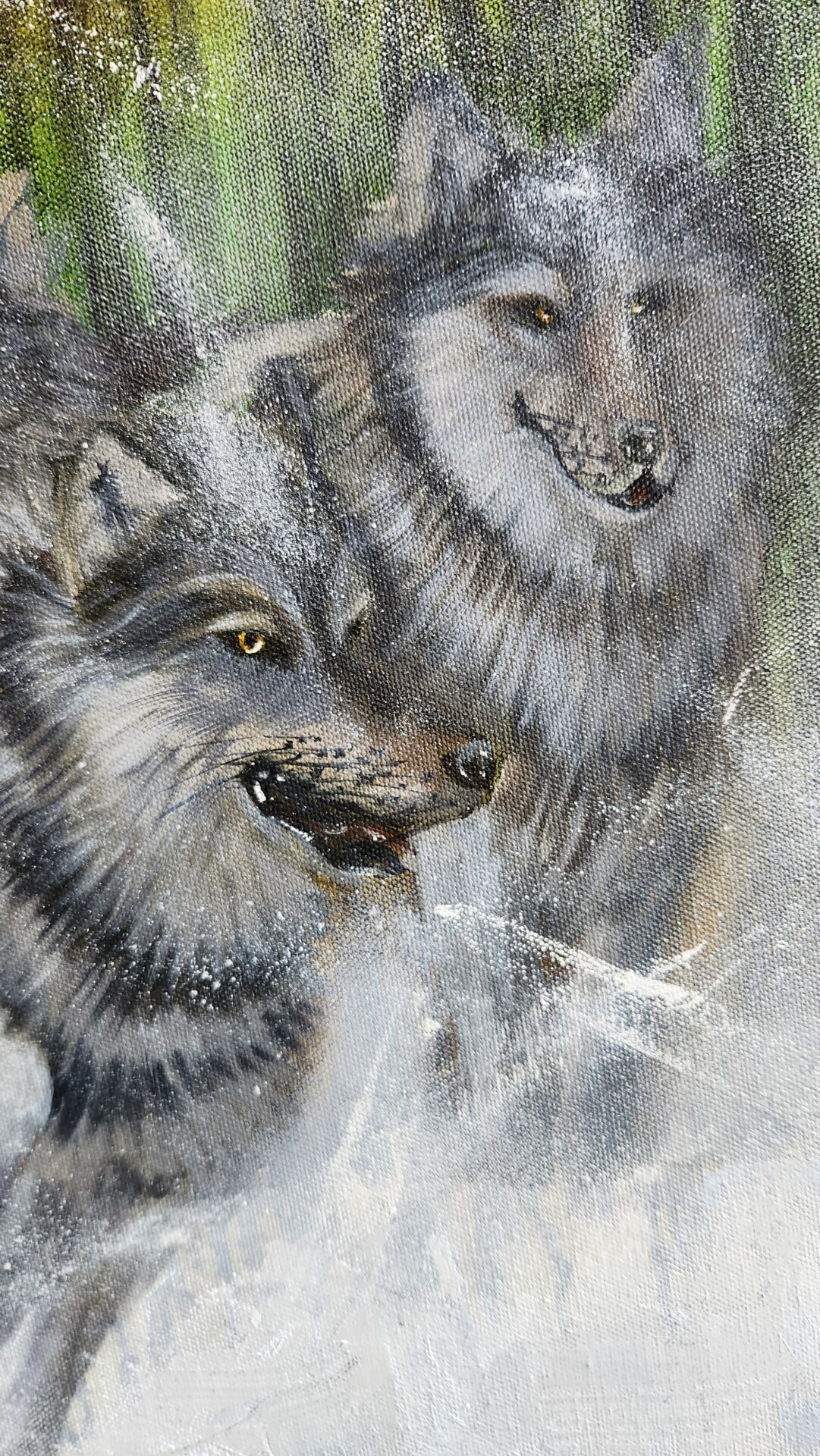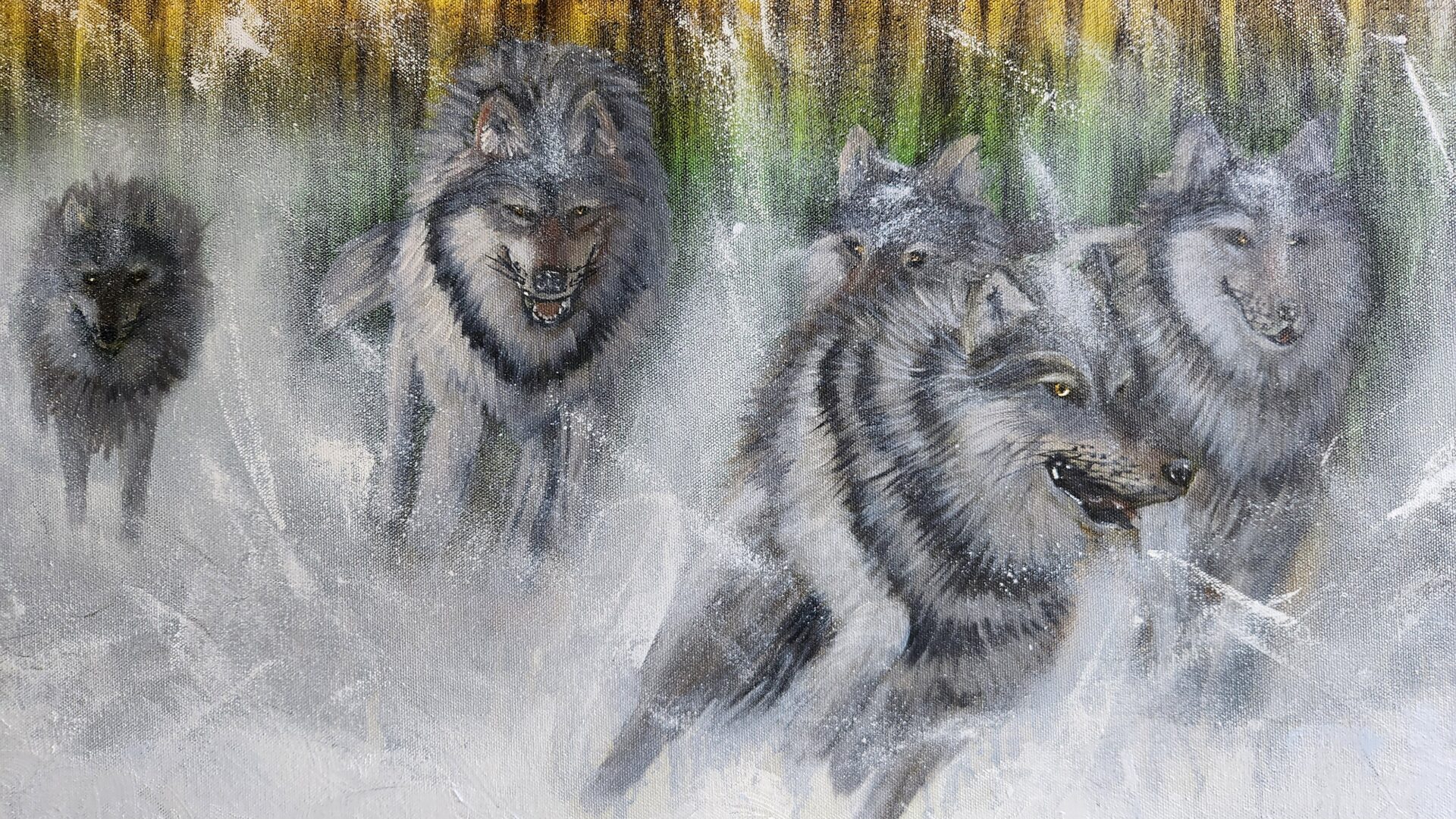 For me, this painting is a metaphor for life’s journey. The wolves remind us of the importance of community and shared purpose, as well as the courage to forge ahead in even the harshest conditions. The golden glow in the background suggests hope and light, a reminder that perseverance leads to new horizons. The dynamic brushstrokes bring movement to the scene, immersing the viewer in the intensity and vitality of the wolves’ charge.