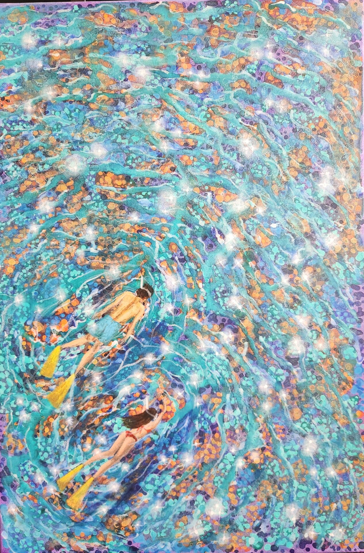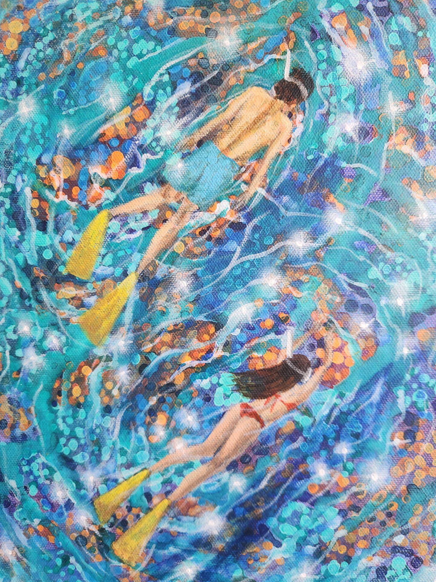 I painted this piece as an invitation to pause and listen to the sea’s gentle stories — to remember how fragile and beautiful our marine world is, and how magical it feels to be part of it, even for a brief, glimmering moment.