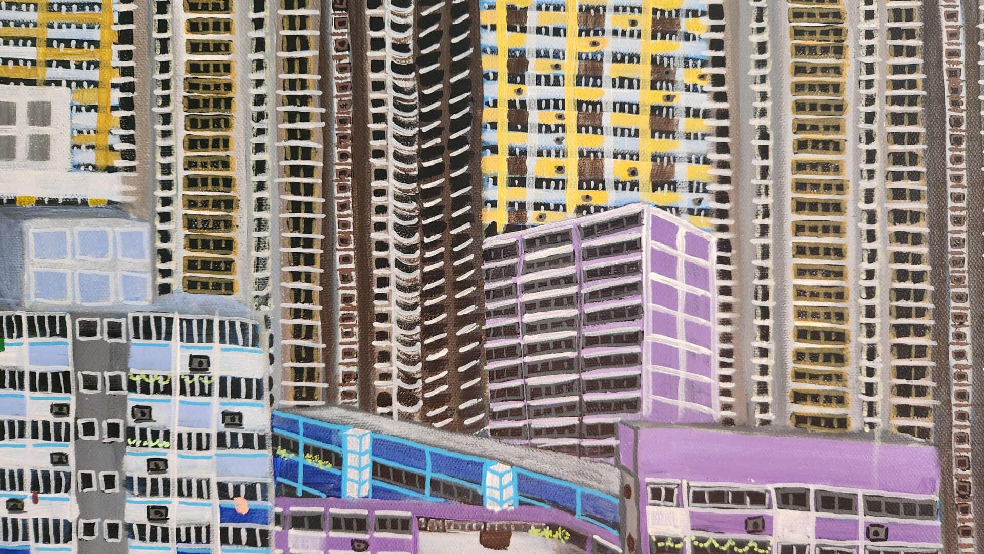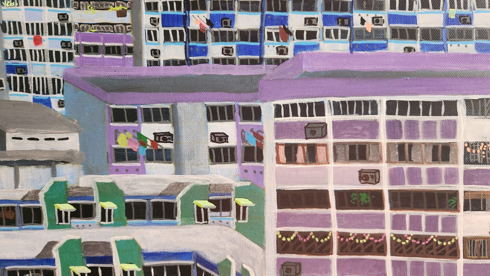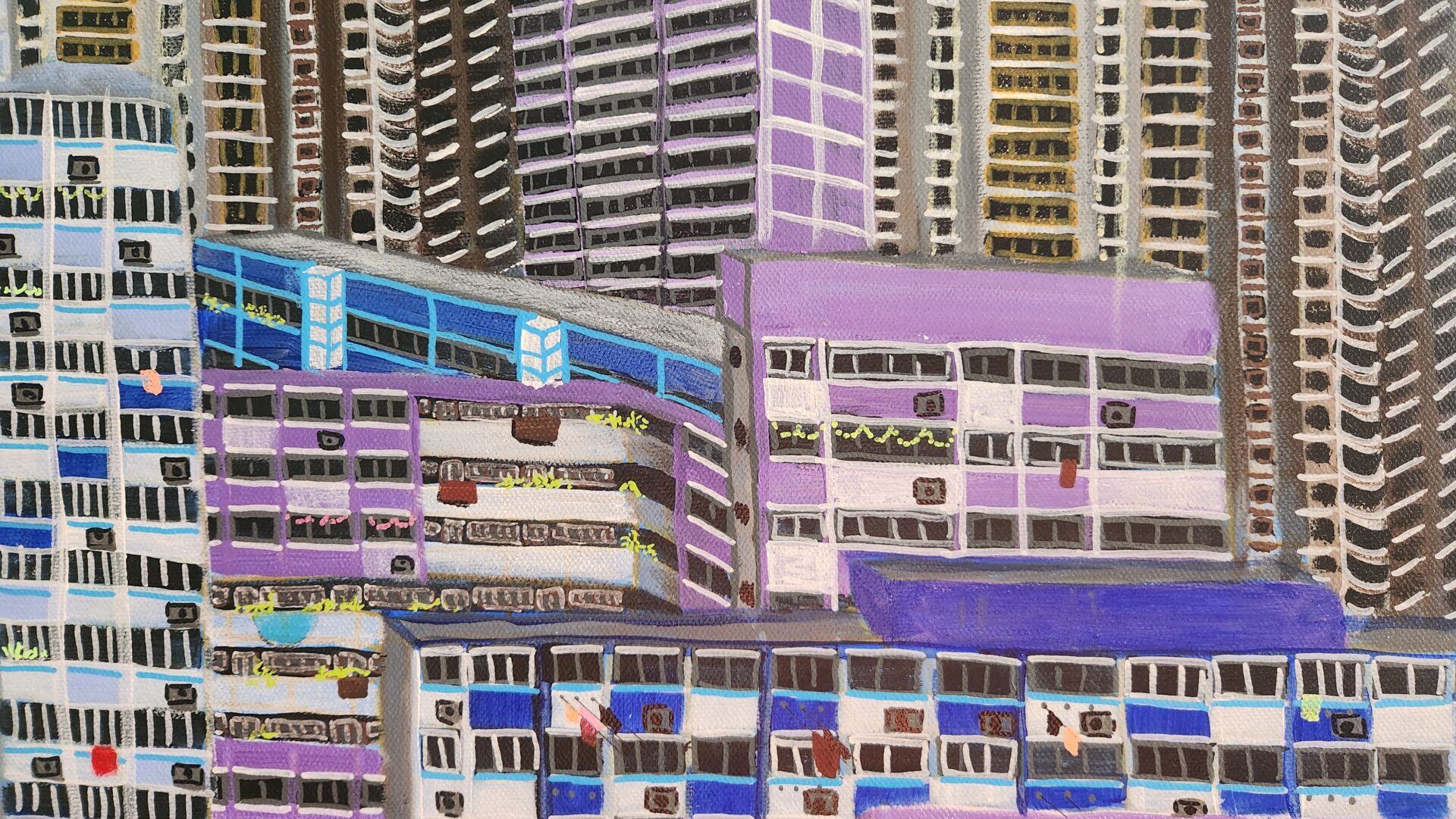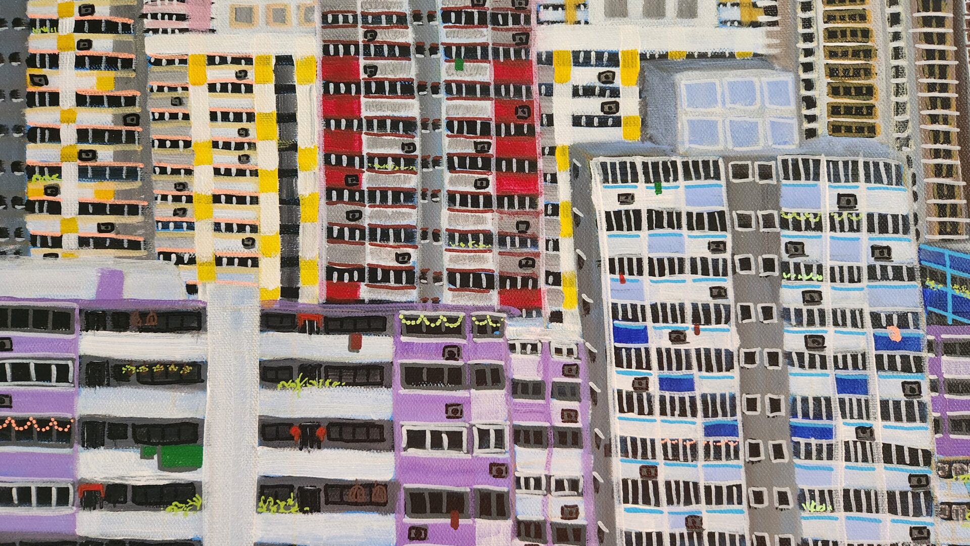 The focal point of the painting is a juxtaposition of old and new HDB (Housing and Development Board) flats, seamlessly coexisting in perfect harmony. The older flats, with their unique character and nostalgic charm, stand tall as guardians of the city’s past. Weathered by time, they bear witness to the stories of generations that have called them home.