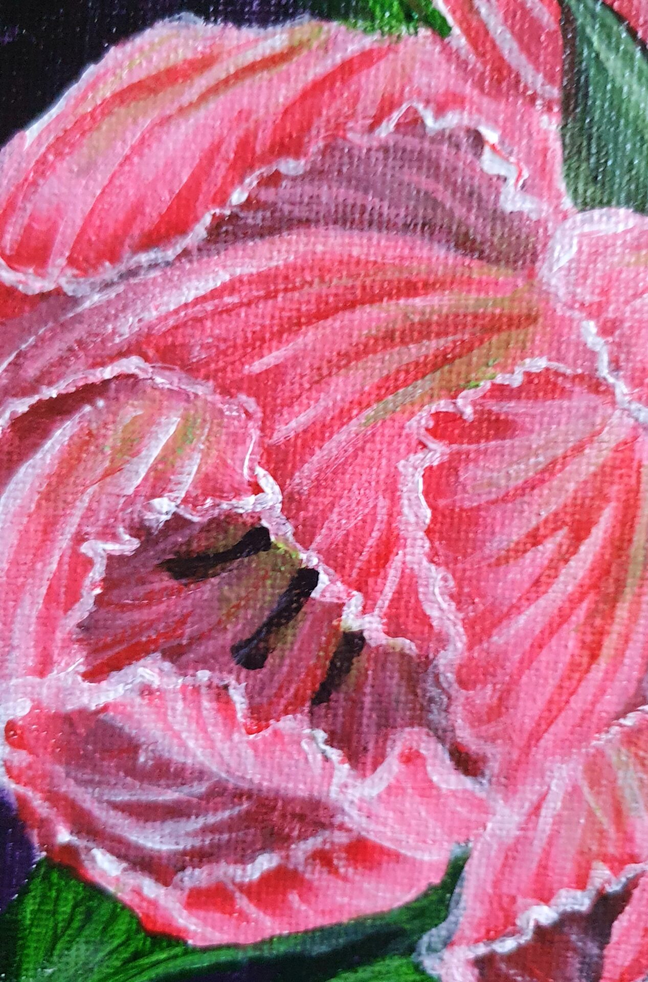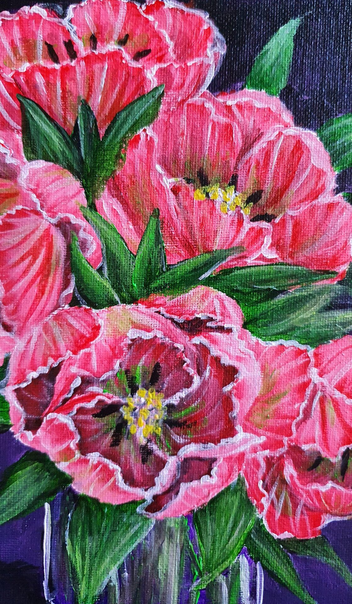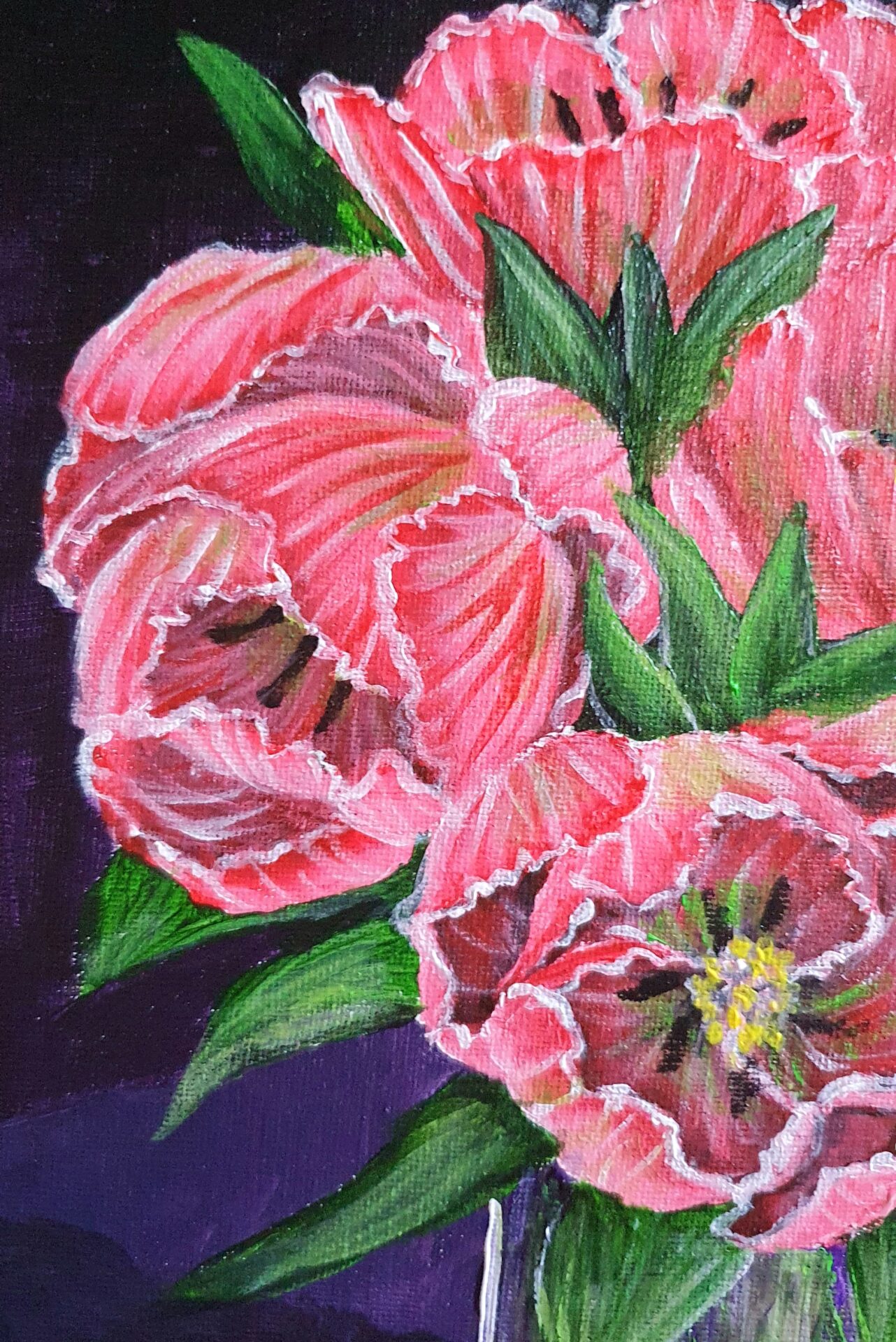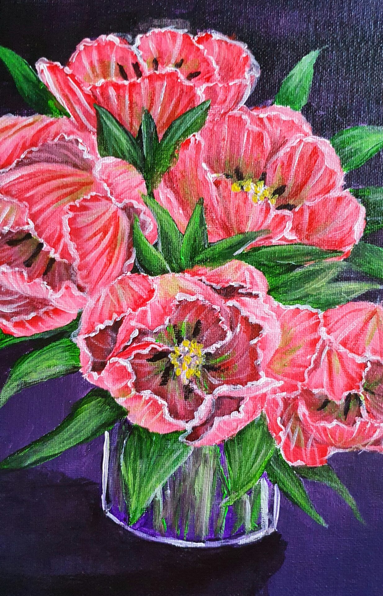 As I worked on this piece, I imagined a quiet moment of serenity—a vase of tulips glowing in soft light, filling a room with their gentle presence. The deep purple background was chosen to complement the delicate pink tones, allowing the flowers to radiate warmth and joy. This painting invites you to pause and embrace the simple, fleeting beauty of flowers, making it feel like spring is always near.